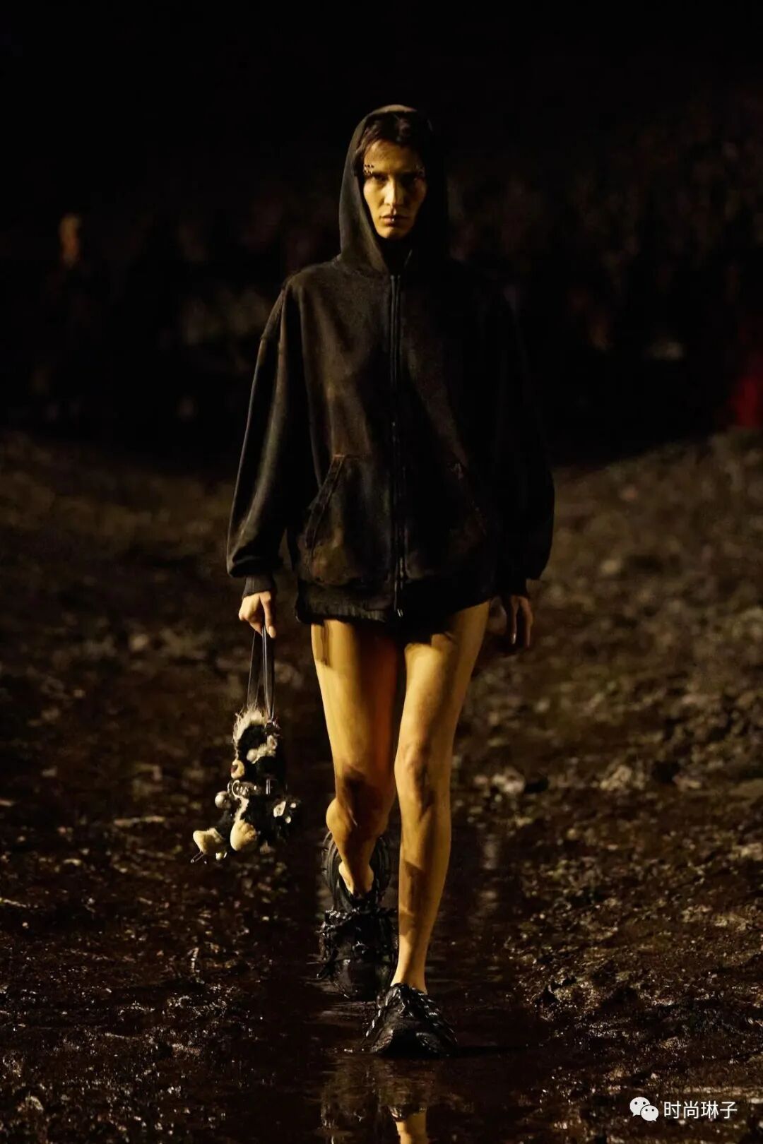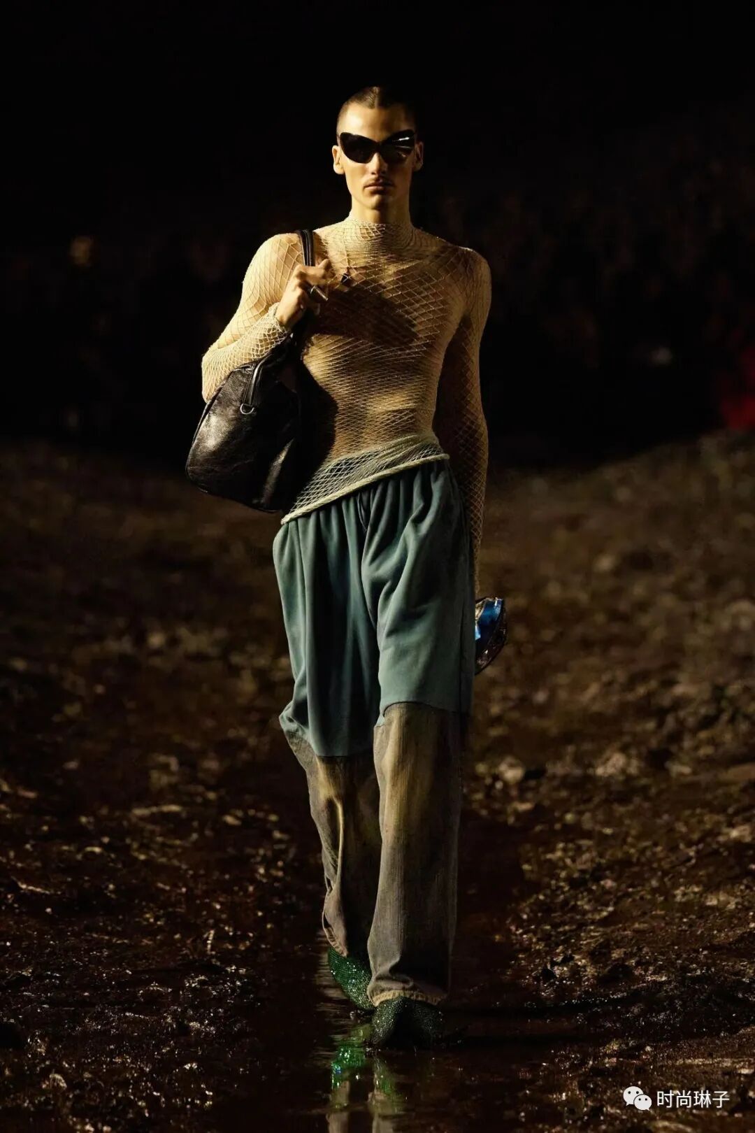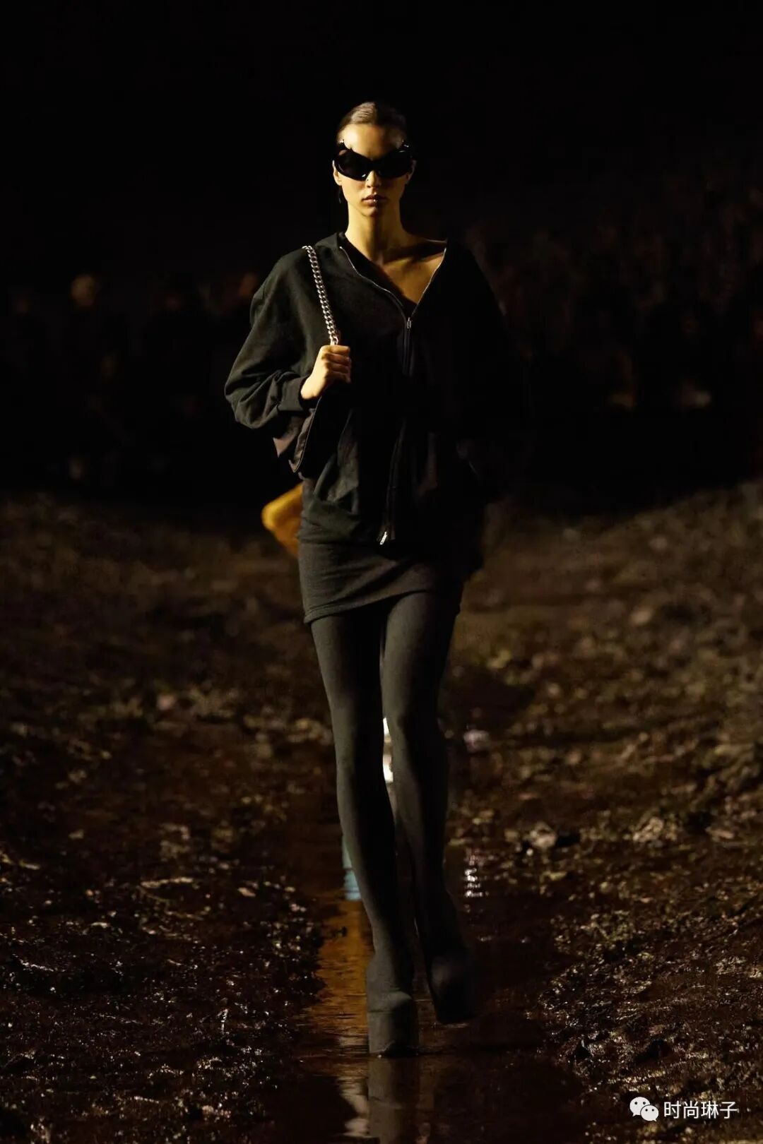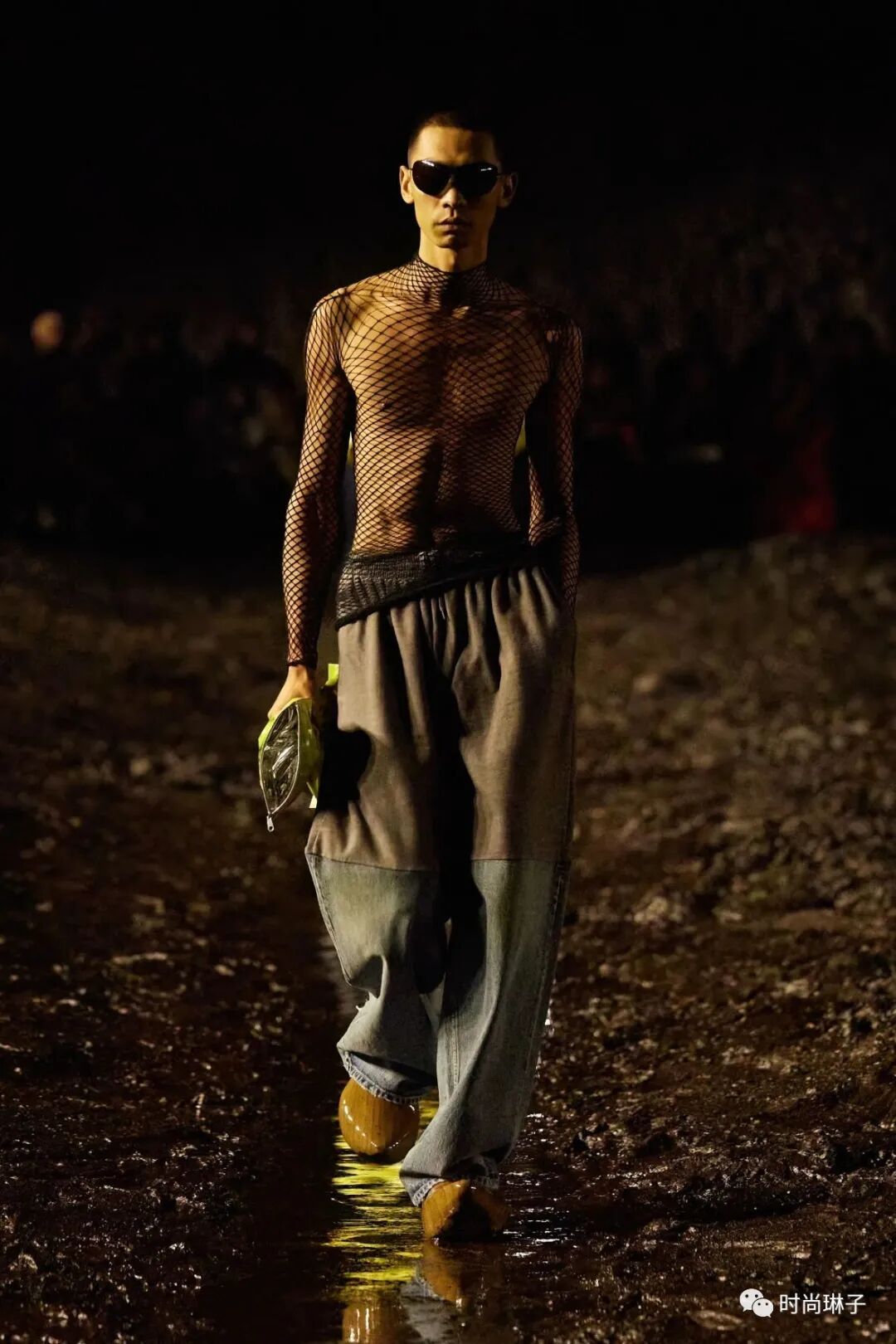 巴黎世家2023夏季大秀秀场以泥泞的路面为T台,被现实打击的“鼻青脸肿”的模特们,穿着夹克、牛仔裤、运动衫、长裙........,依然在生活这条道路上勇往直前。