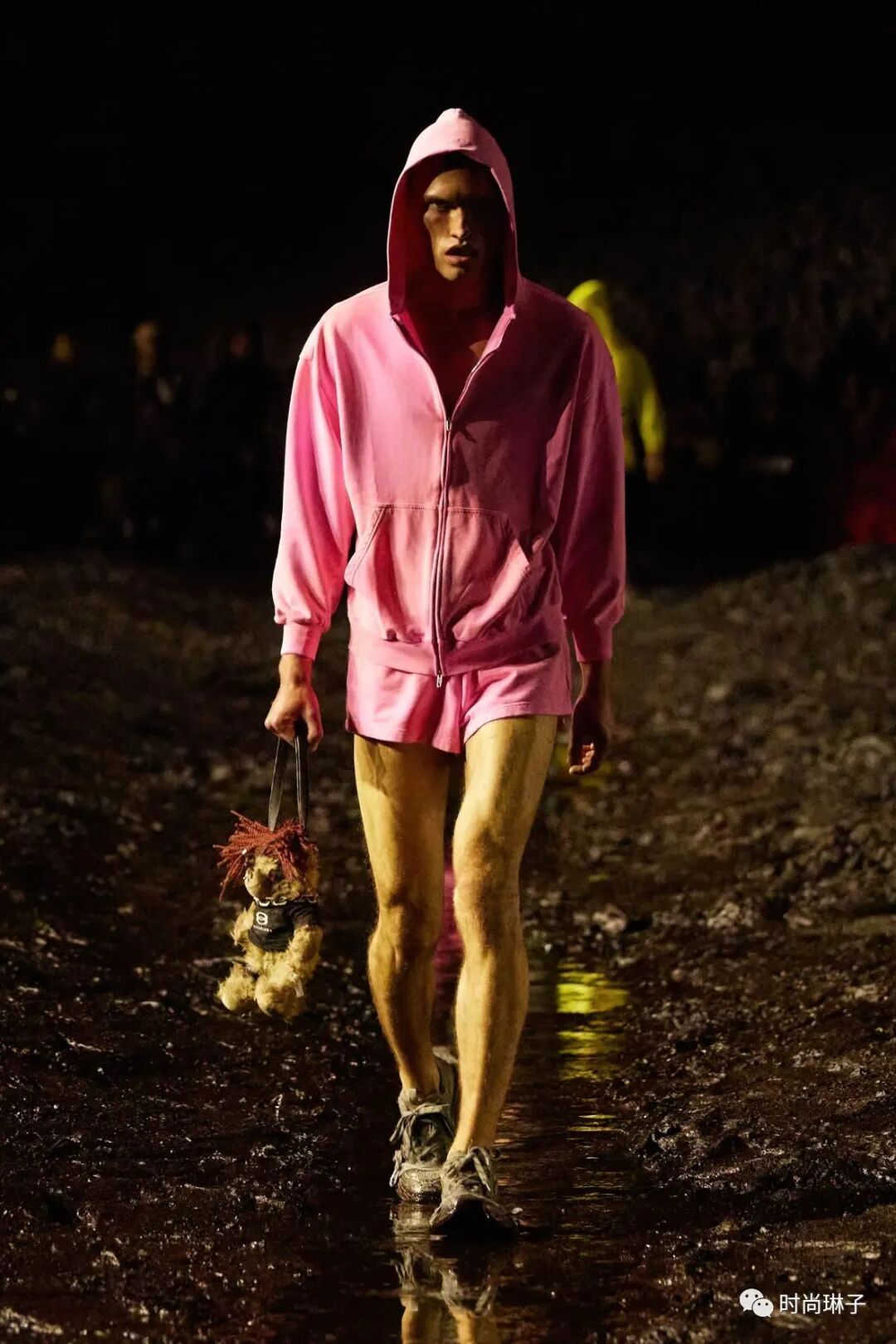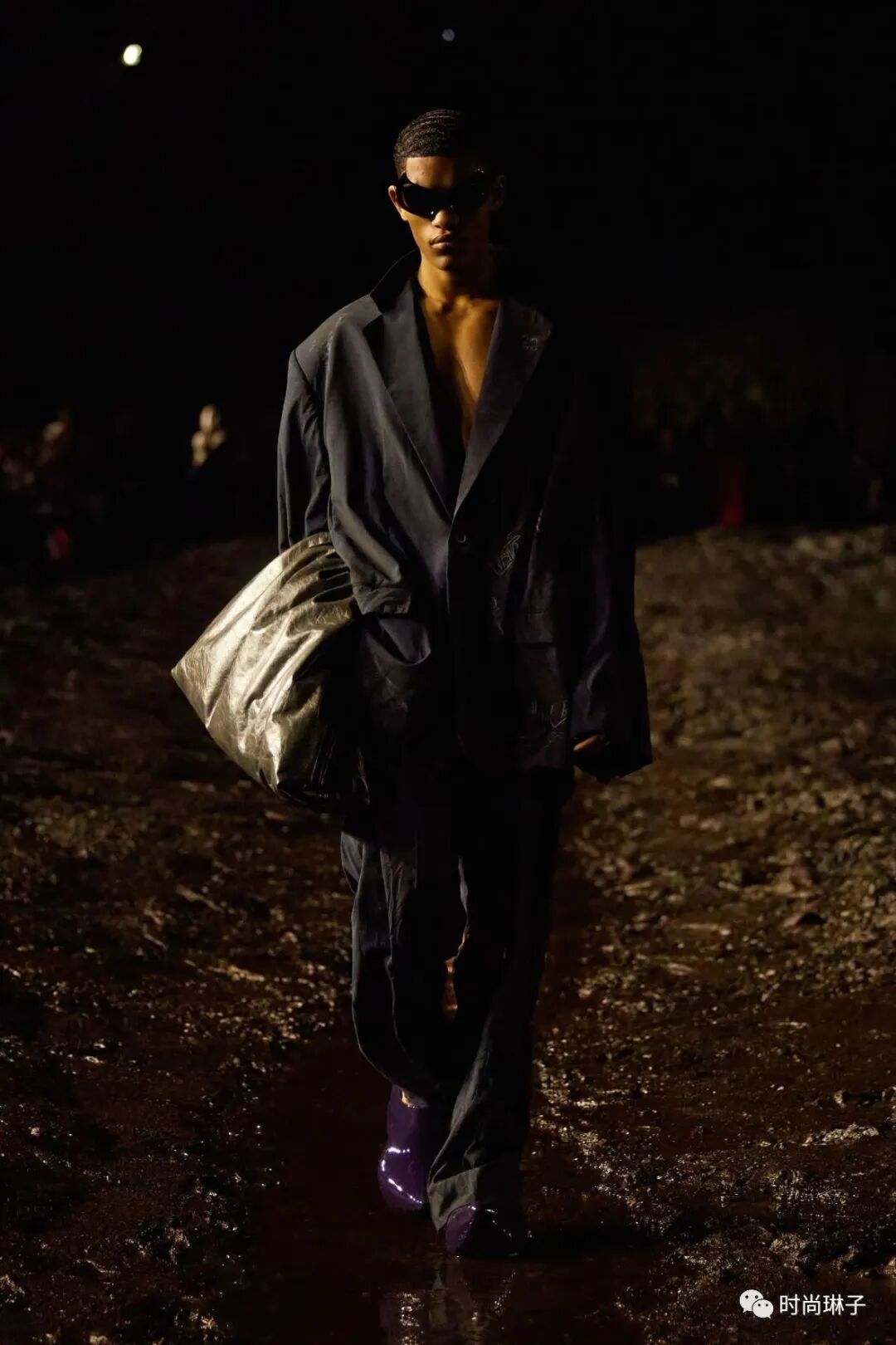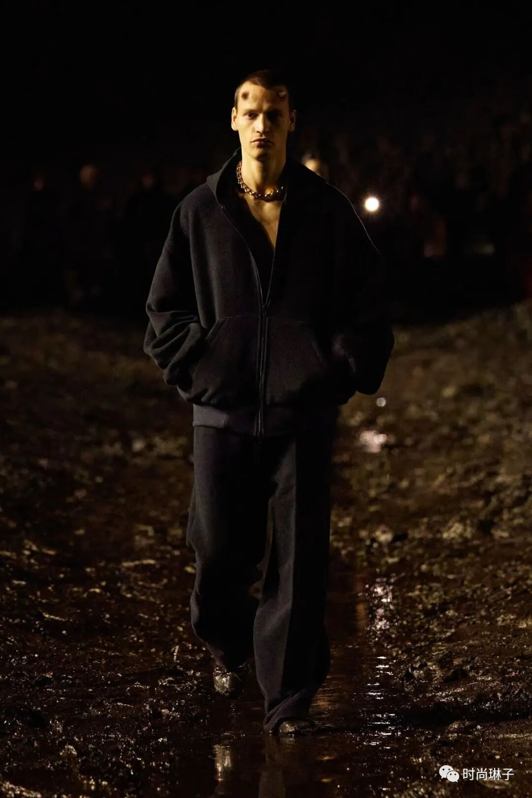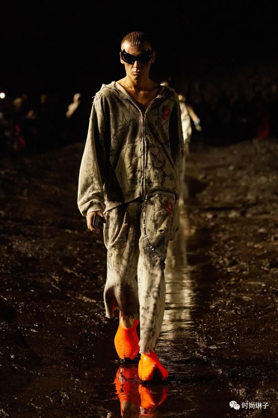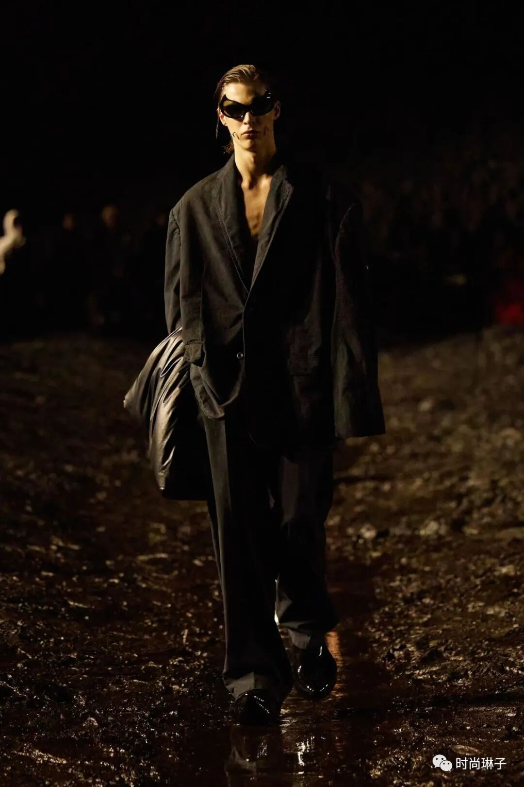 巴黎世家2023夏季大秀秀场以泥泞的路面为T台,被现实打击的“鼻青脸肿”的模特们,穿着夹克、牛仔裤、运动衫、长裙........,依然在生活这条道路上勇往直前。