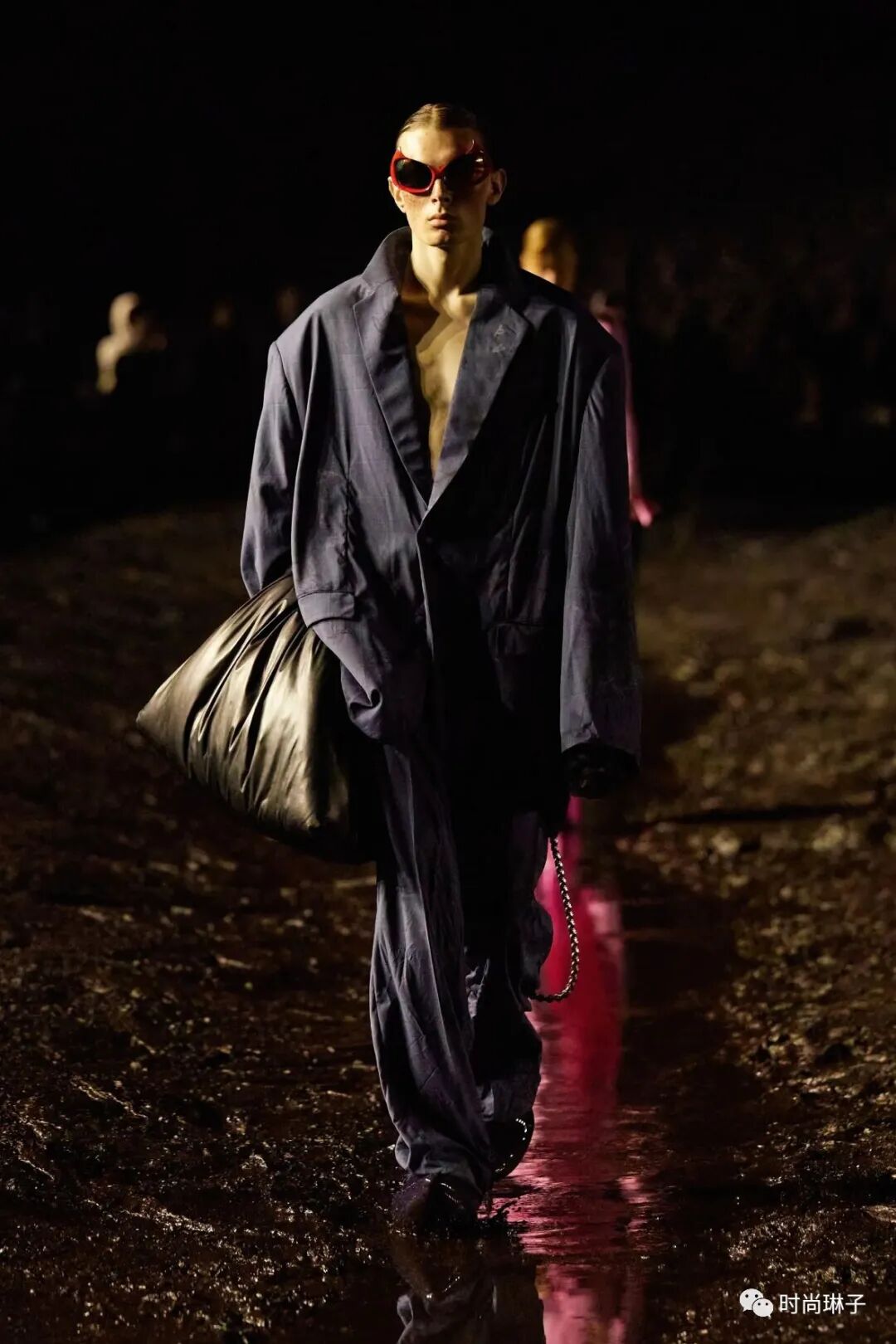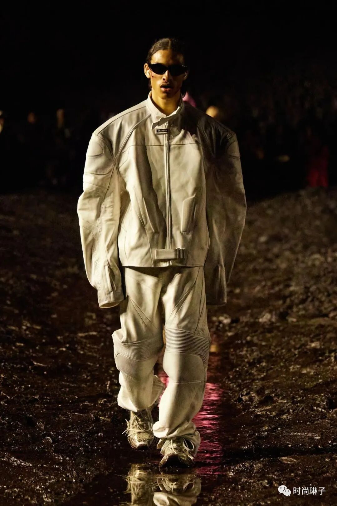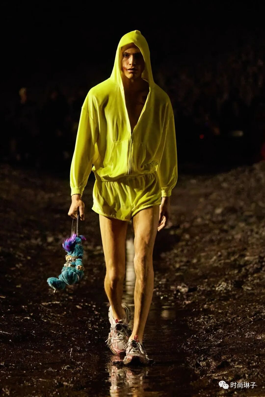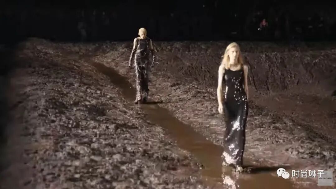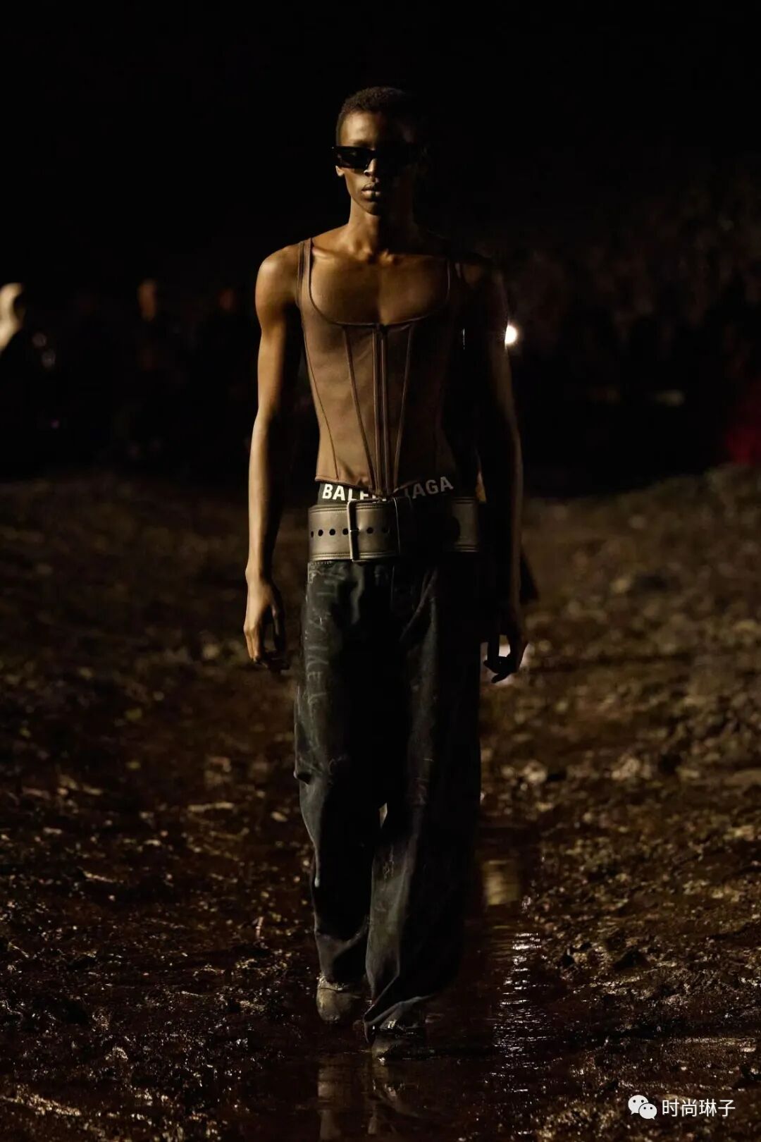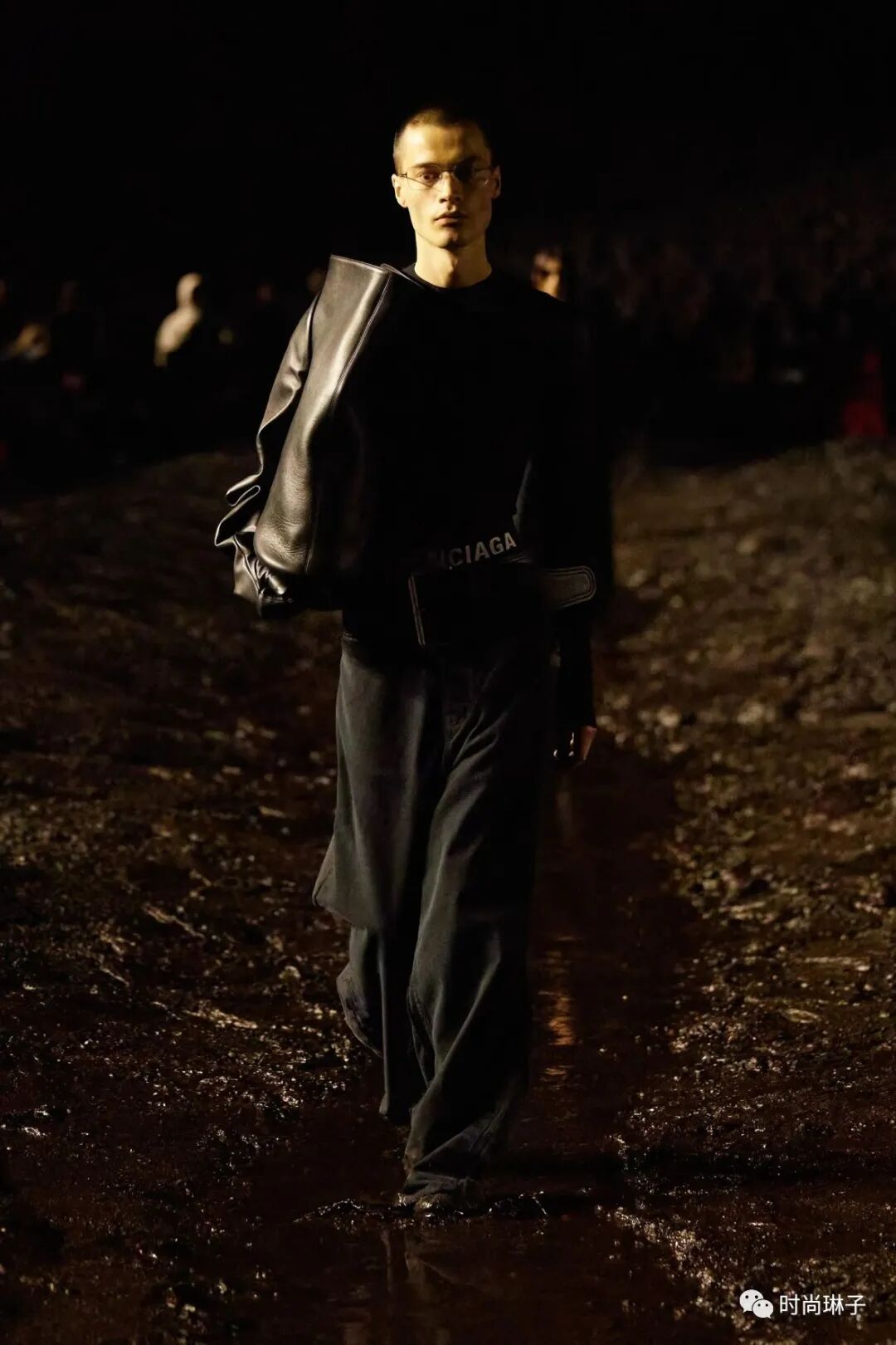 巴黎世家2023夏季大秀秀场以泥泞的路面为T台,被现实打击的“鼻青脸肿”的模特们,穿着夹克、牛仔裤、运动衫、长裙........,依然在生活这条道路上勇往直前。
