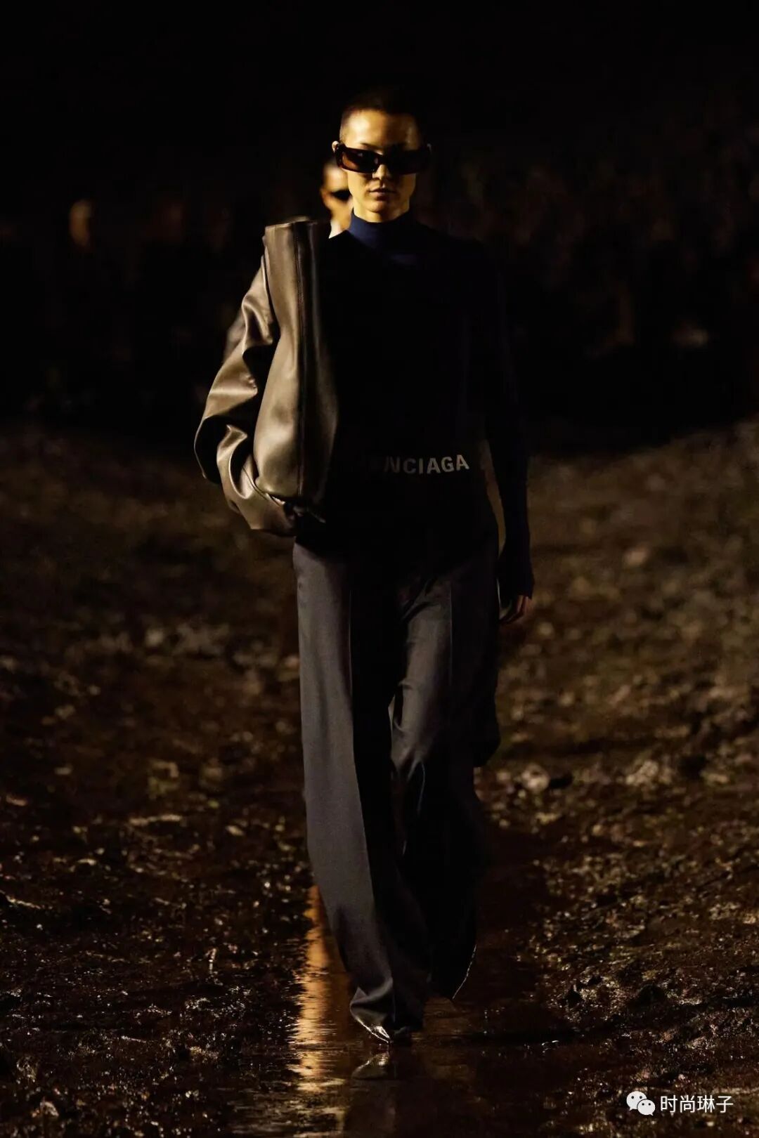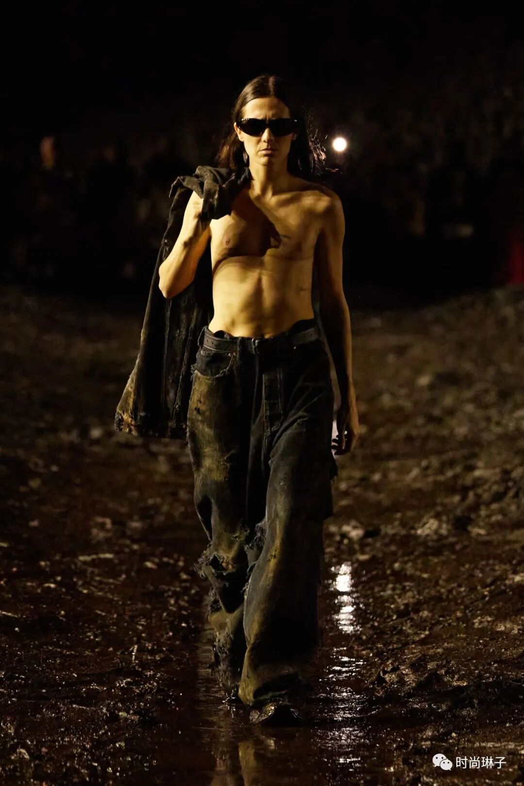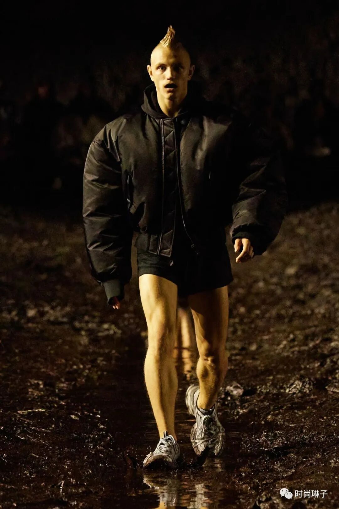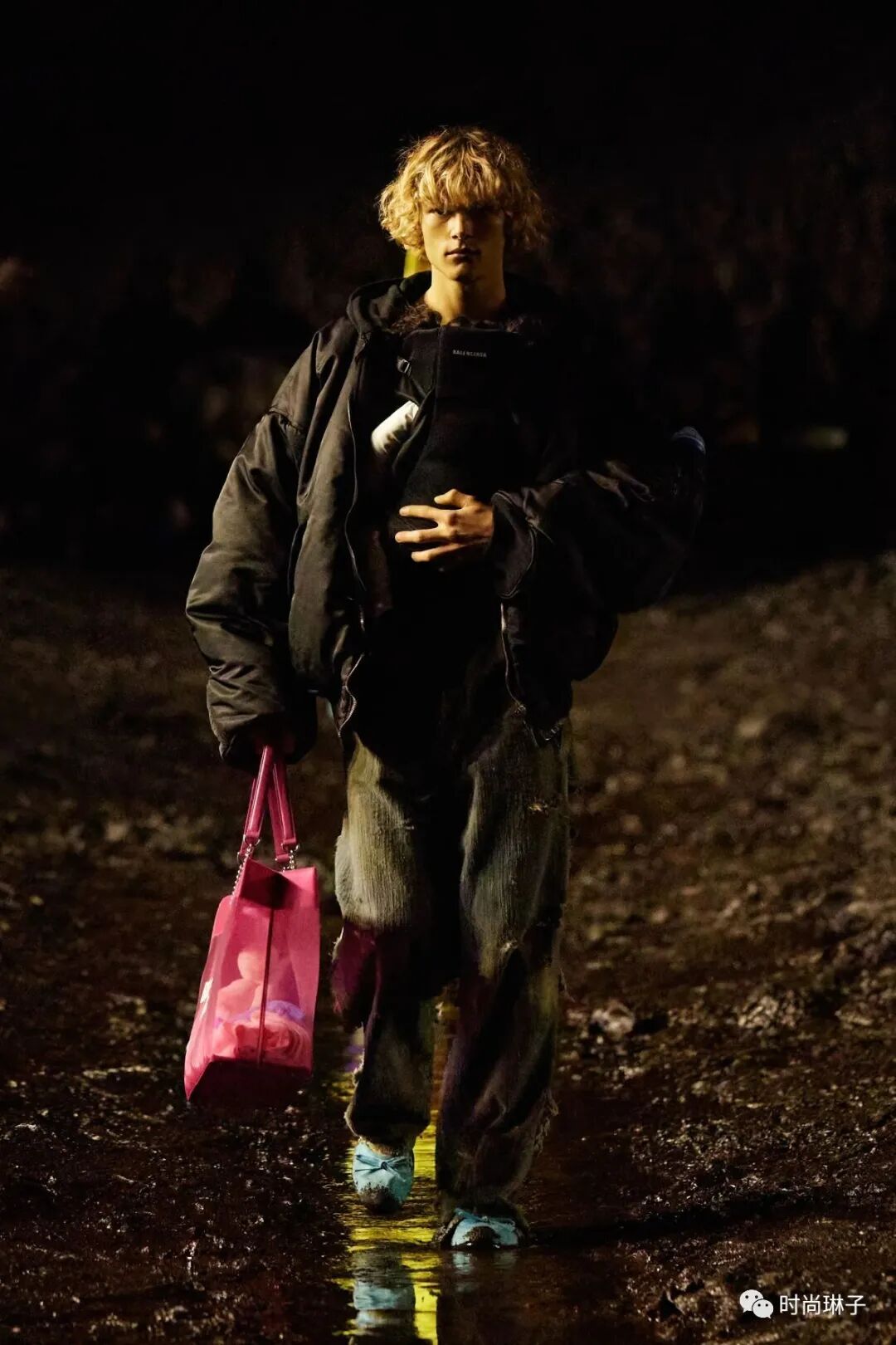 巴黎世家2023夏季大秀秀场以泥泞的路面为T台,被现实打击的“鼻青脸肿”的模特们,穿着夹克、牛仔裤、运动衫、长裙........,依然在生活这条道路上勇往直前。