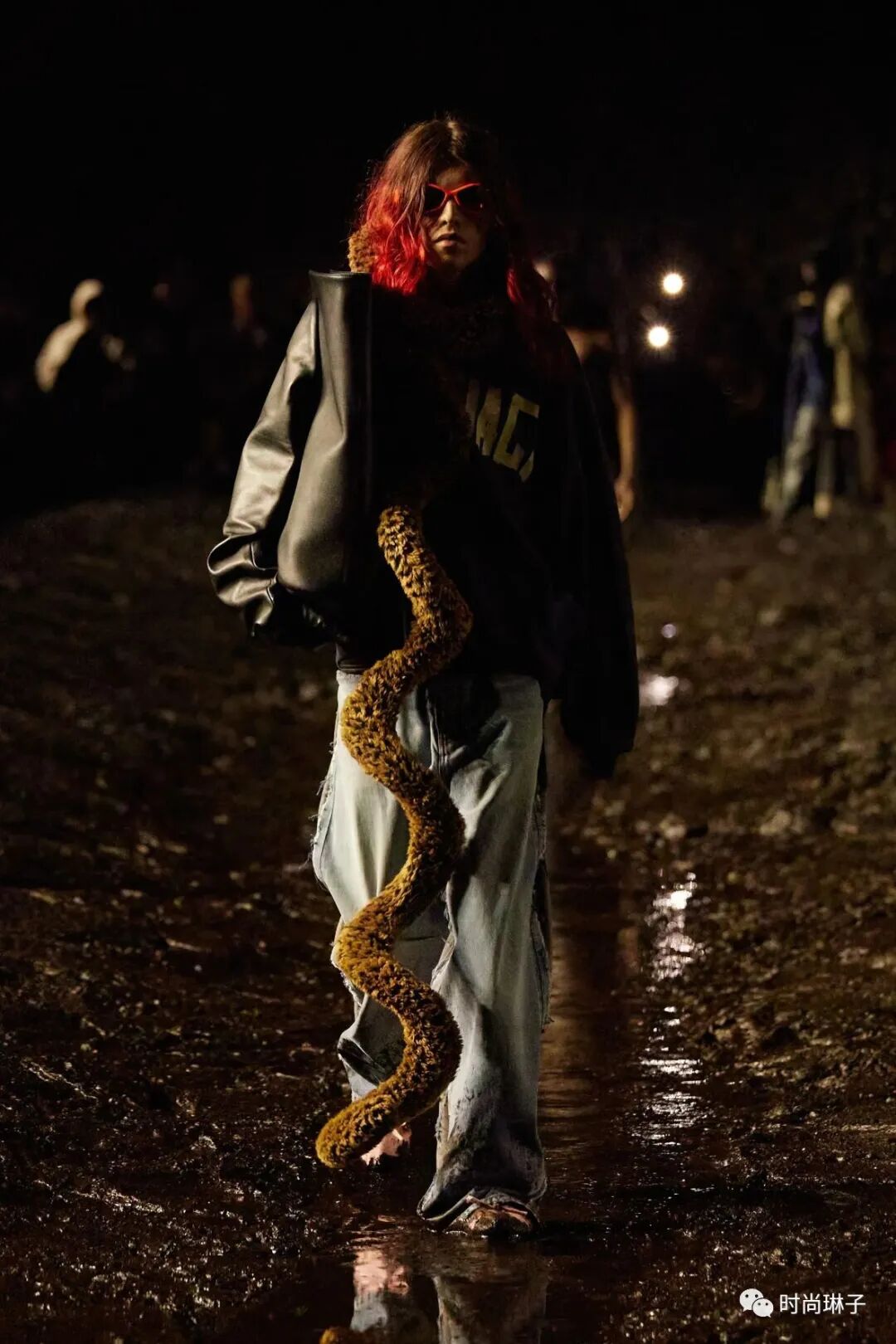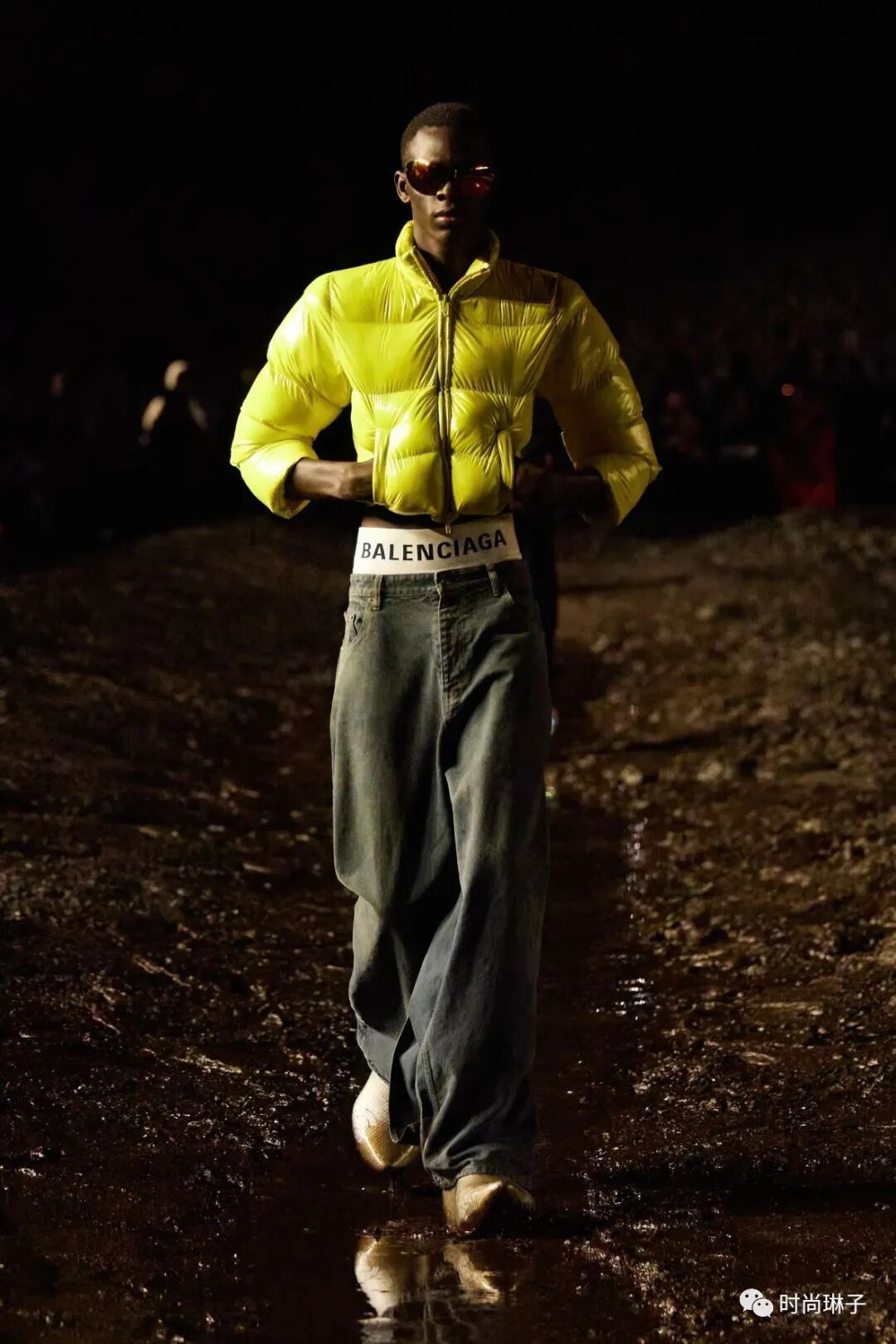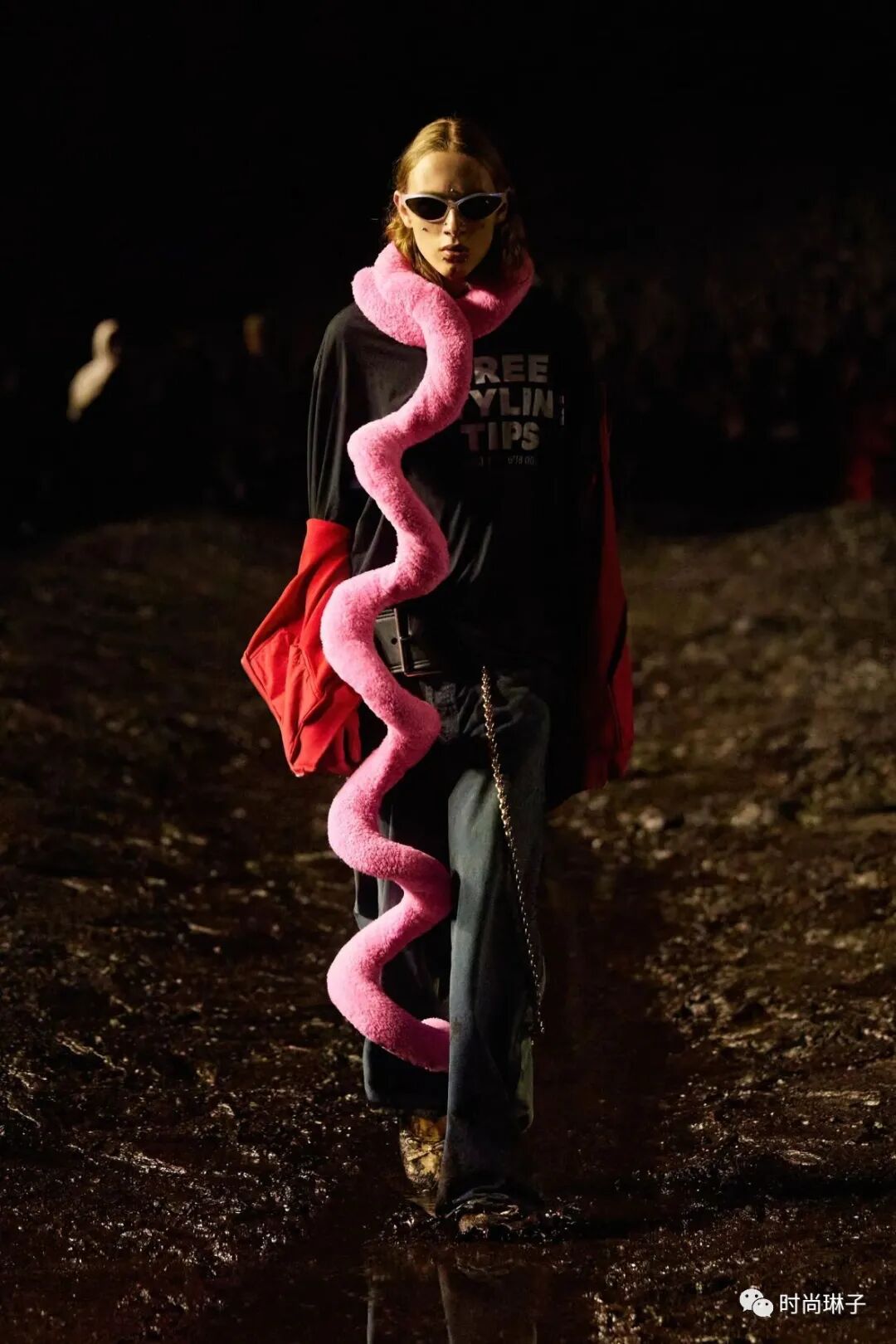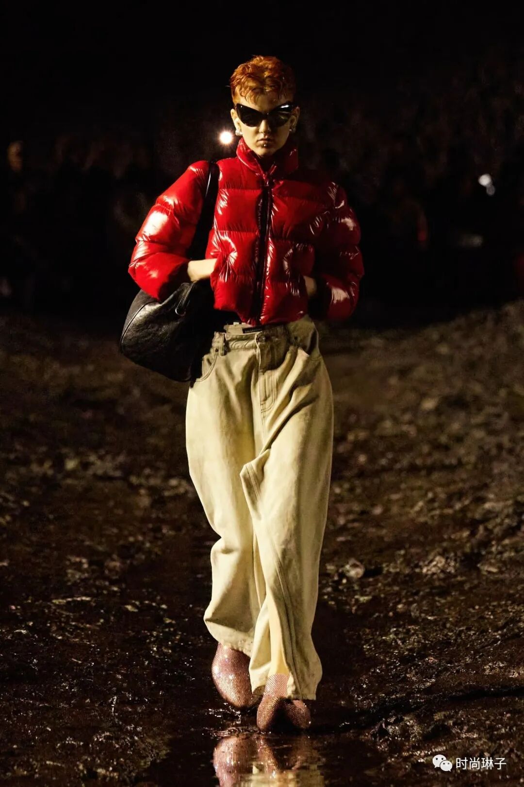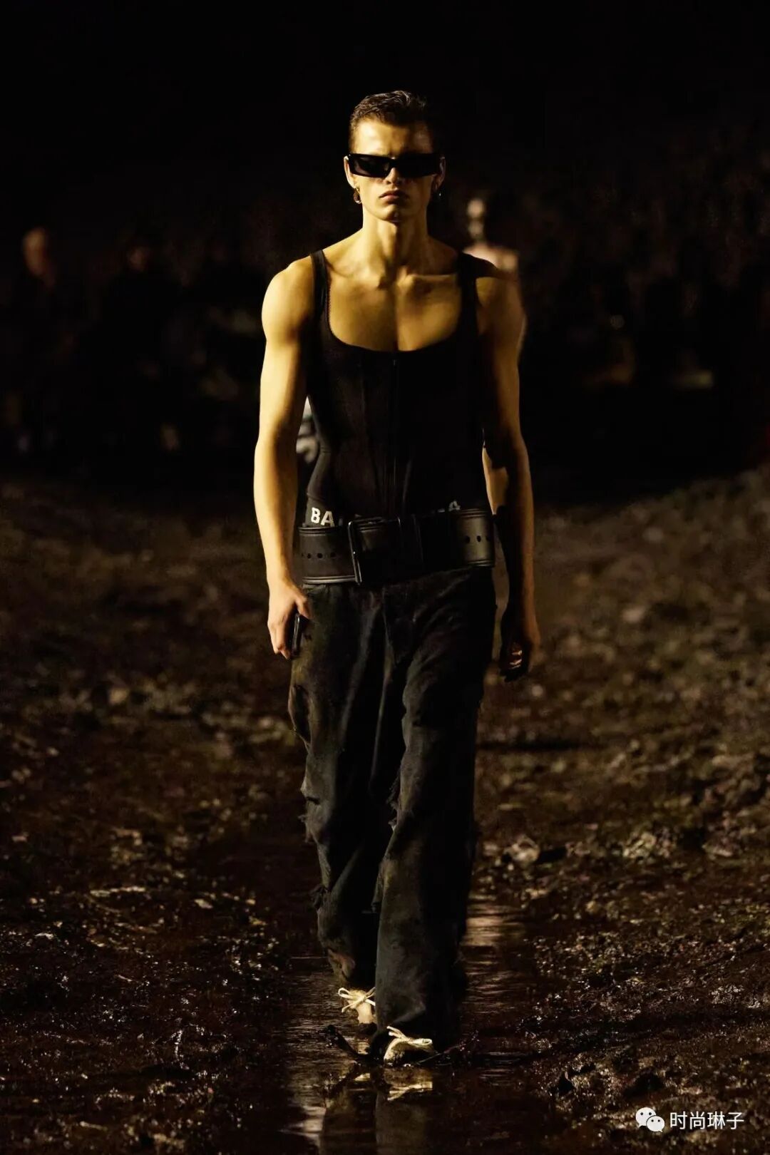 巴黎世家2023夏季大秀秀场以泥泞的路面为T台,被现实打击的“鼻青脸肿”的模特们,穿着夹克、牛仔裤、运动衫、长裙........,依然在生活这条道路上勇往直前。
