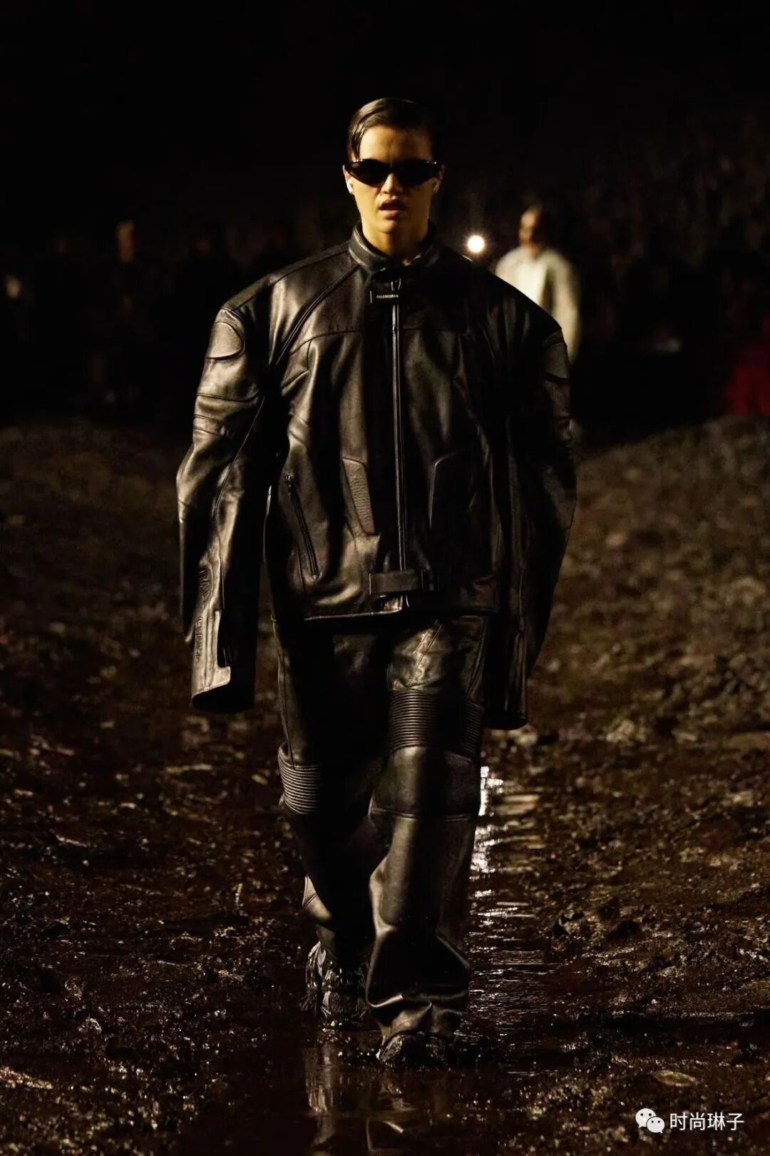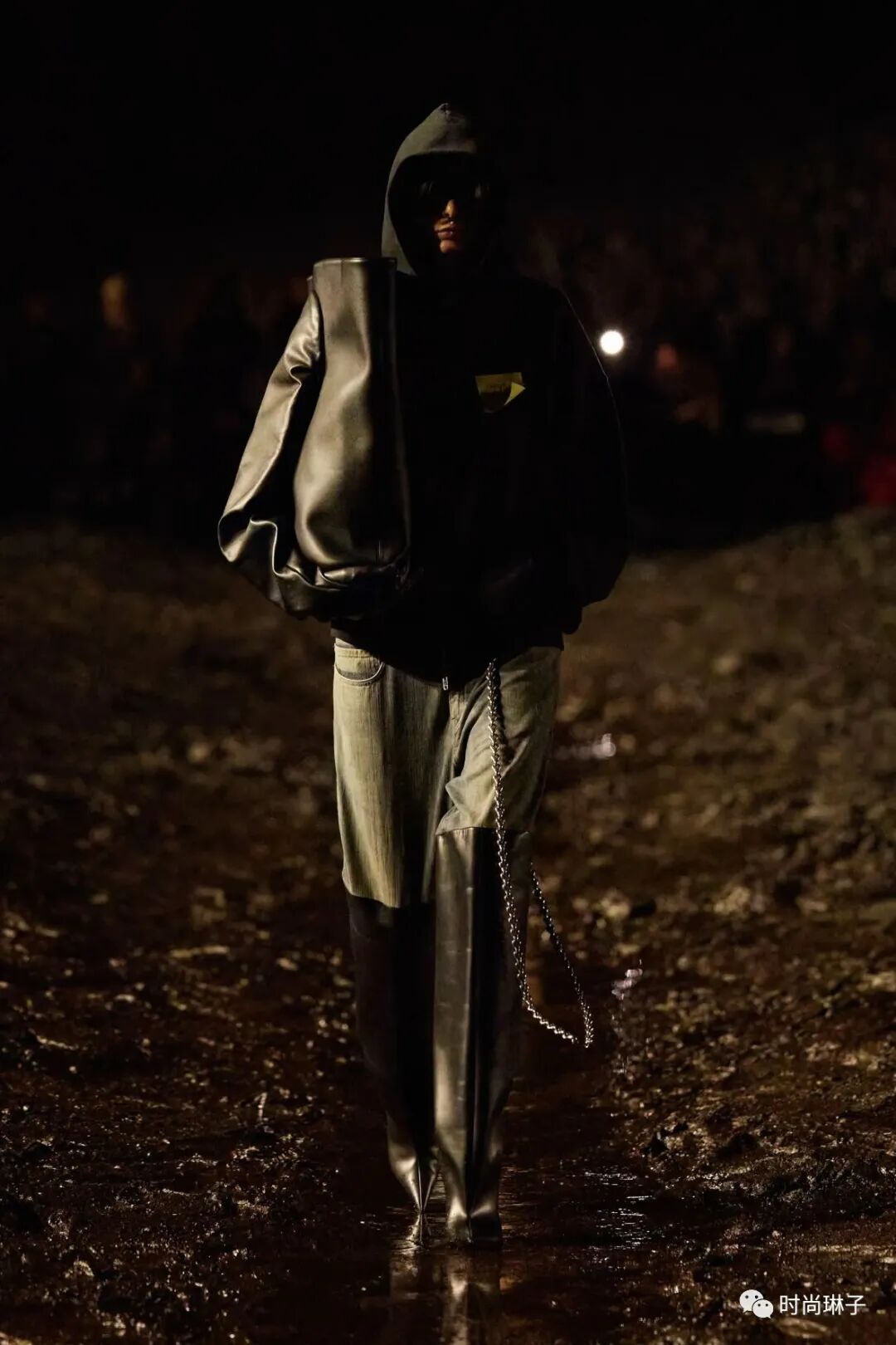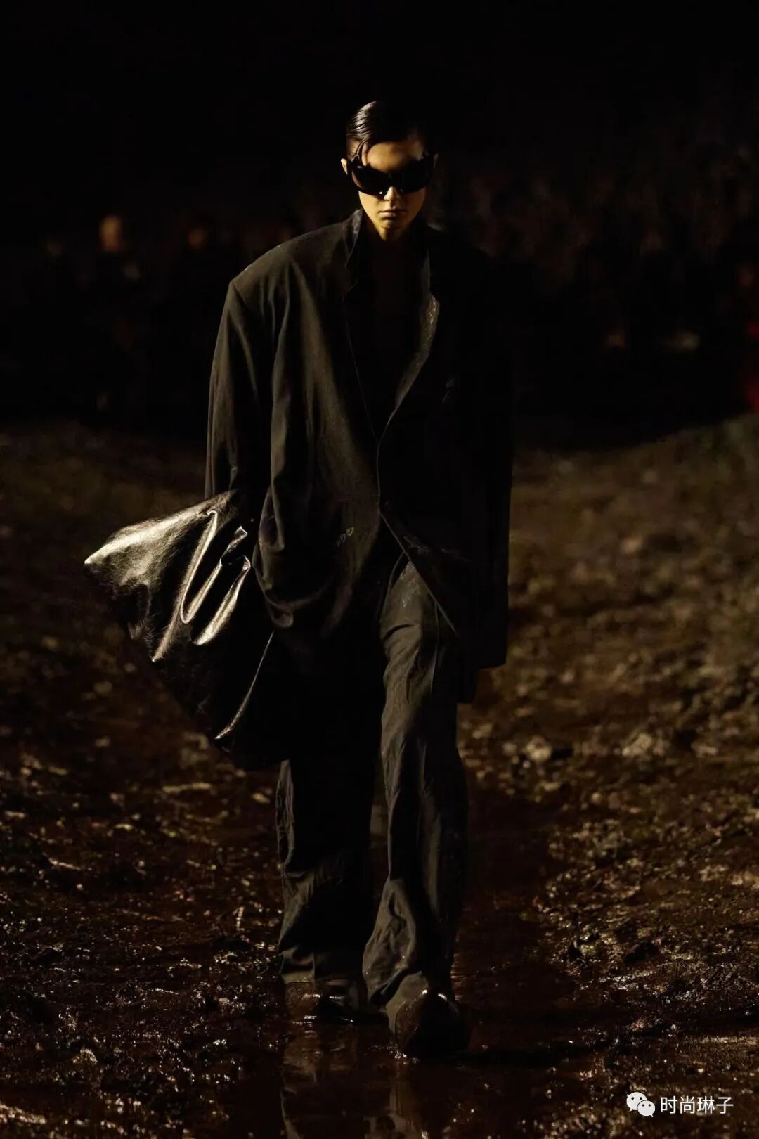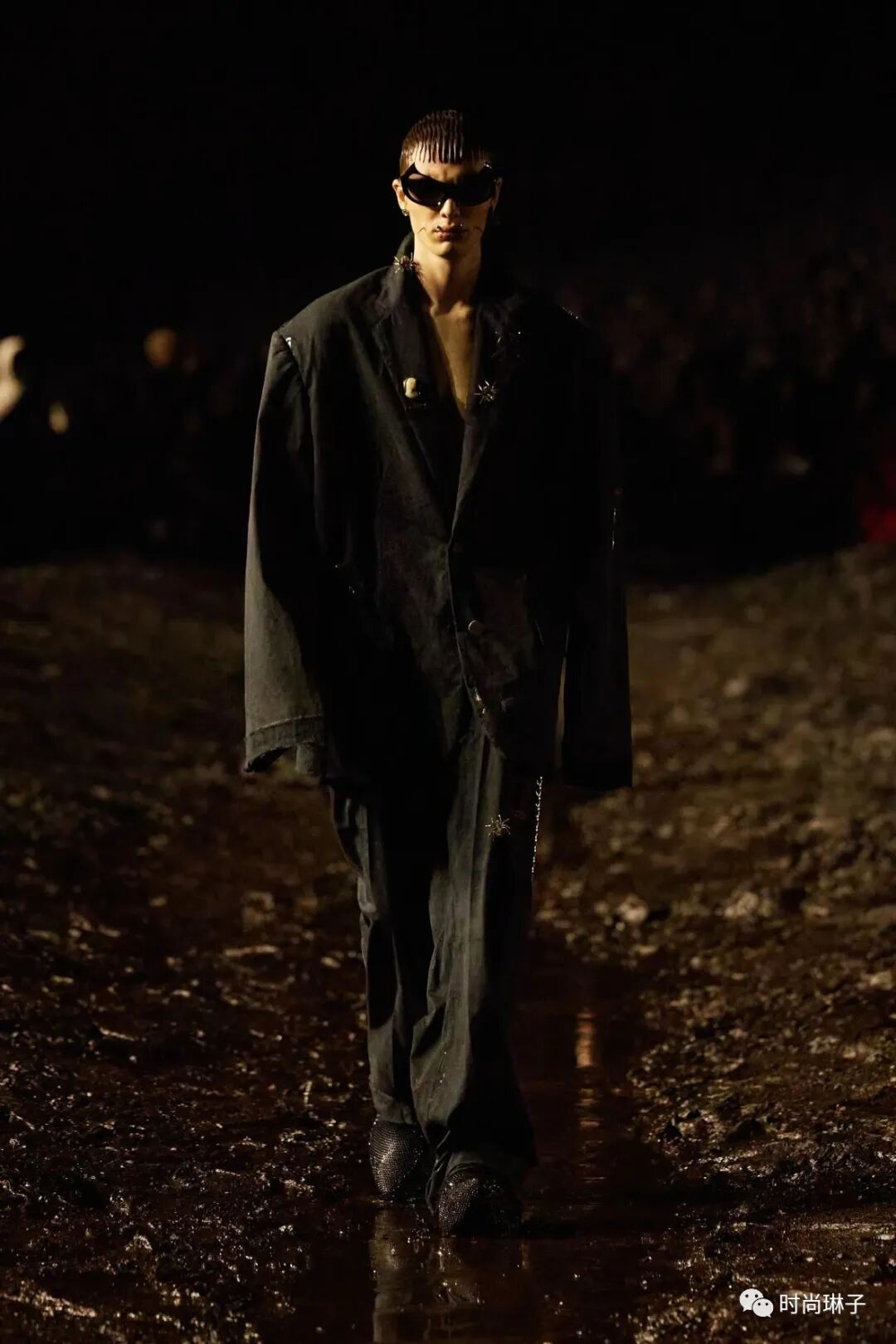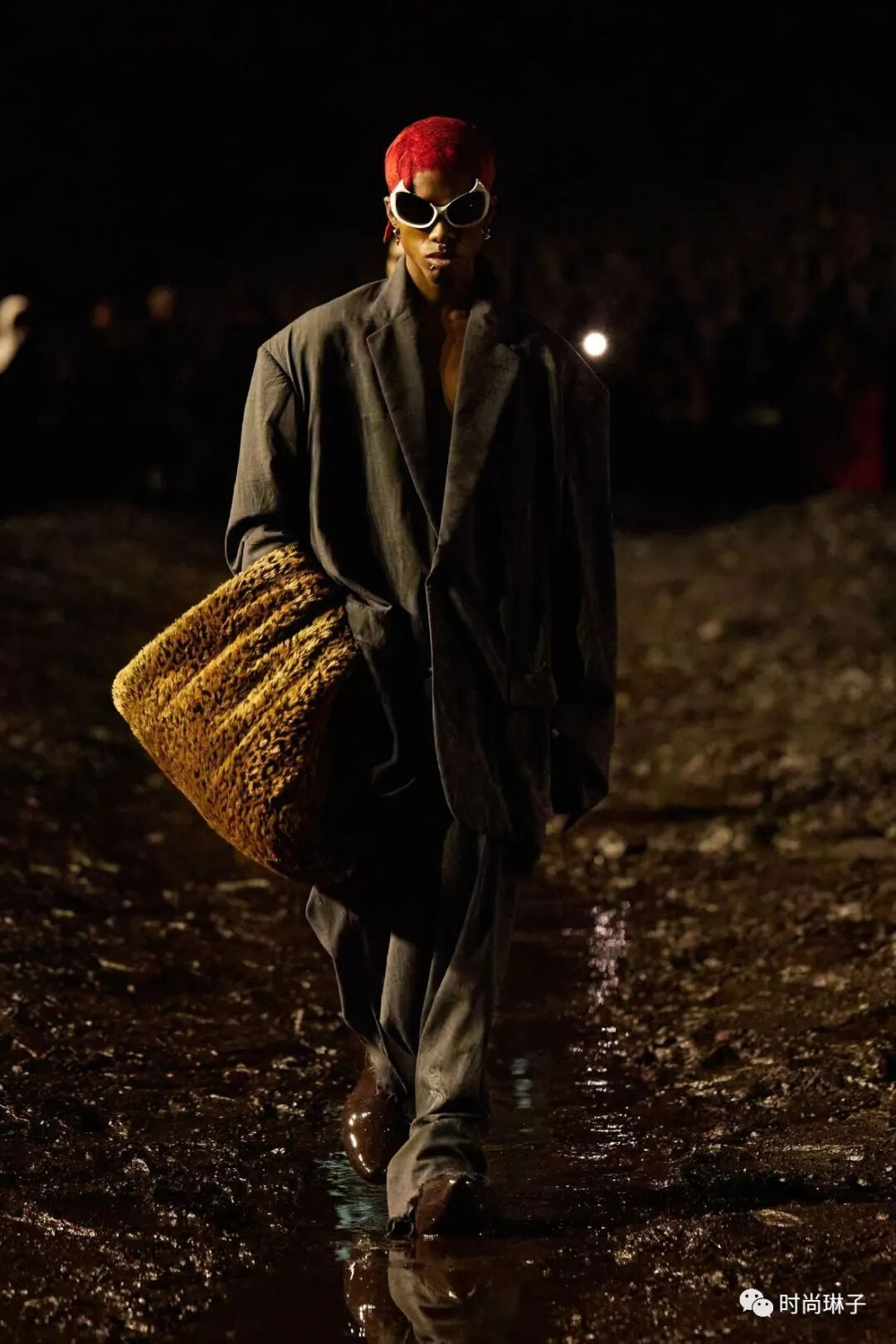 巴黎世家2023夏季大秀秀场以泥泞的路面为T台,被现实打击的“鼻青脸肿”的模特们,穿着夹克、牛仔裤、运动衫、长裙........,依然在生活这条道路上勇往直前。