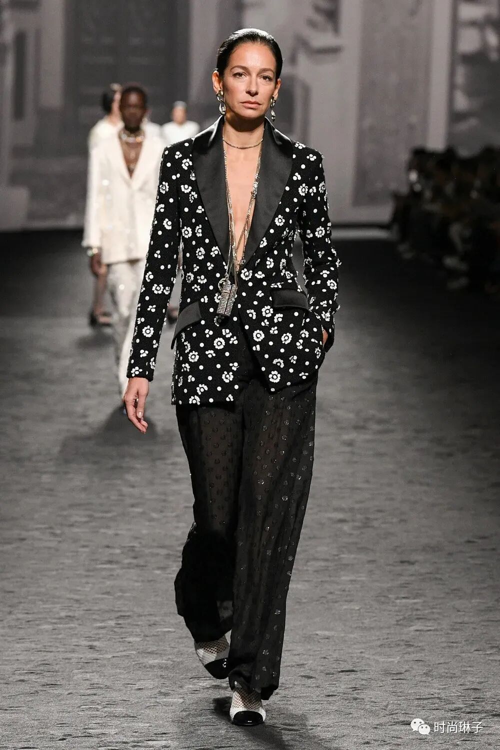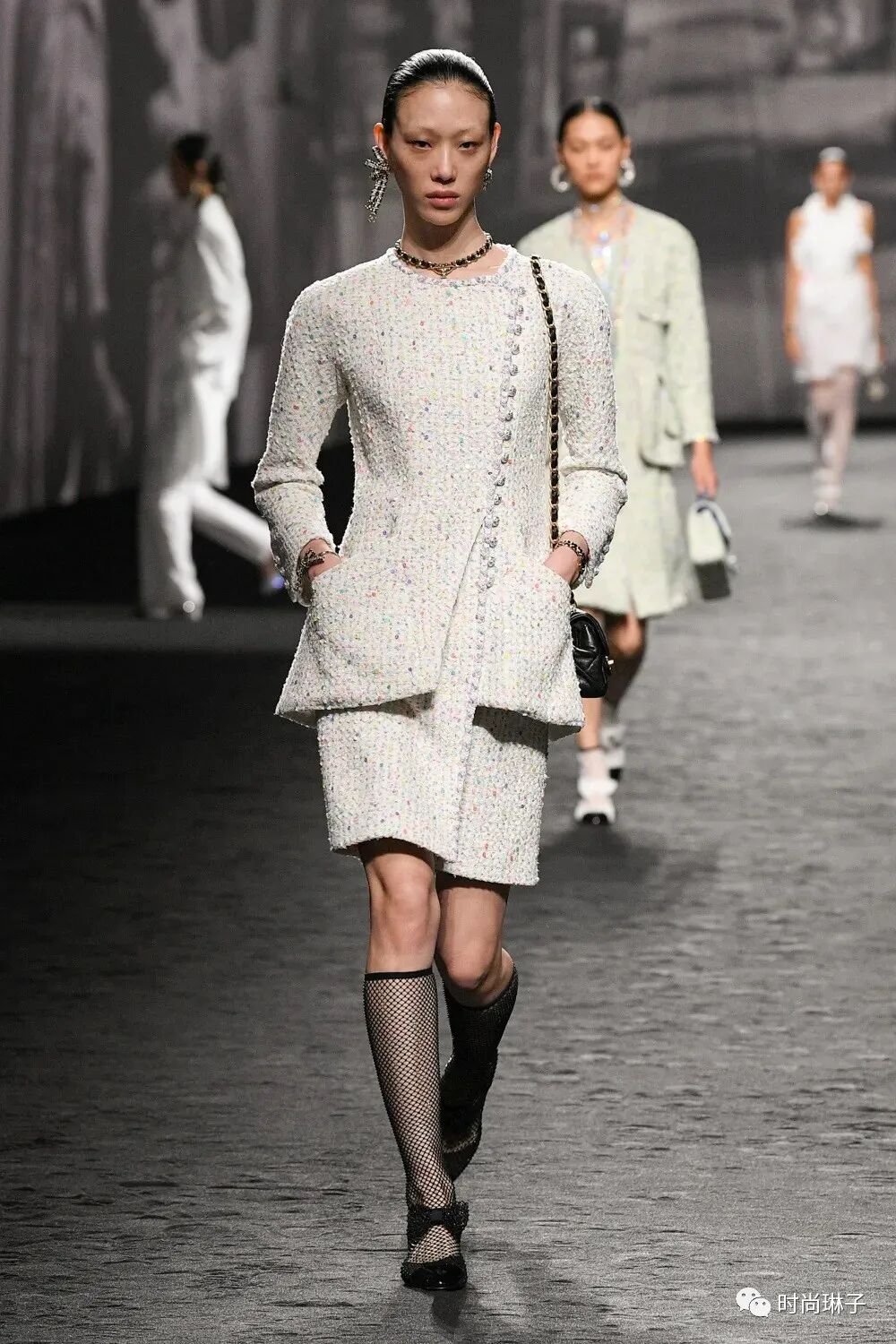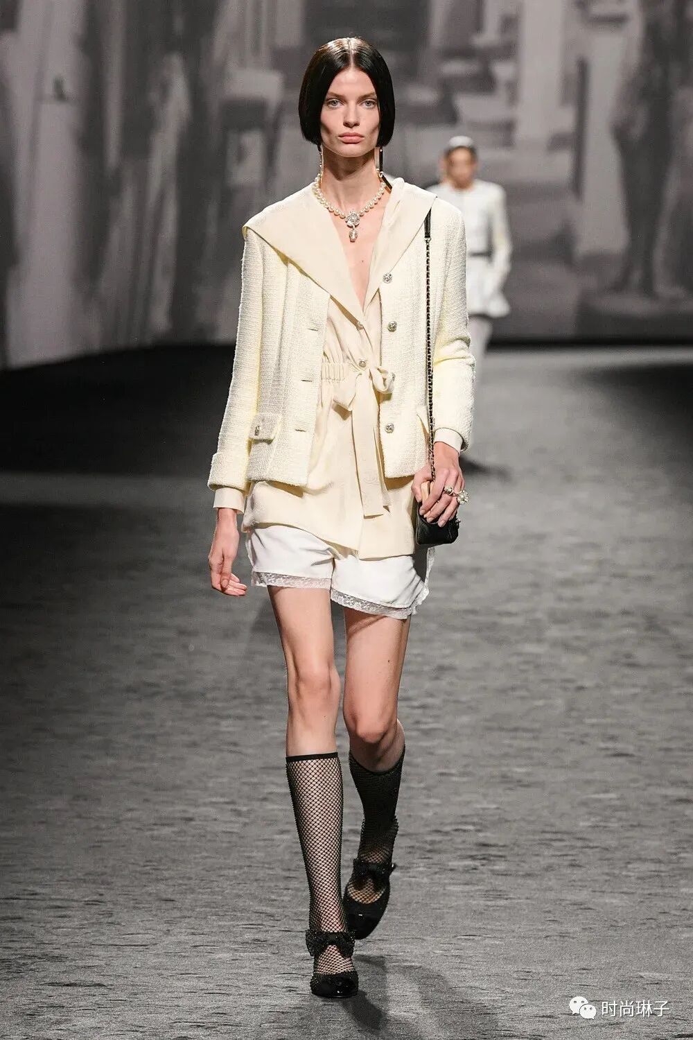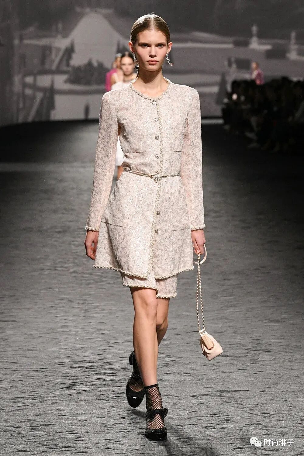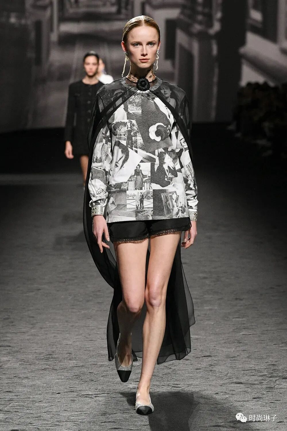 香奈儿2023 春夏时装秀以电影《去年在马里昂巴德》剧照印花上衣开场,致敬创始人香奈儿女士的优雅设计。