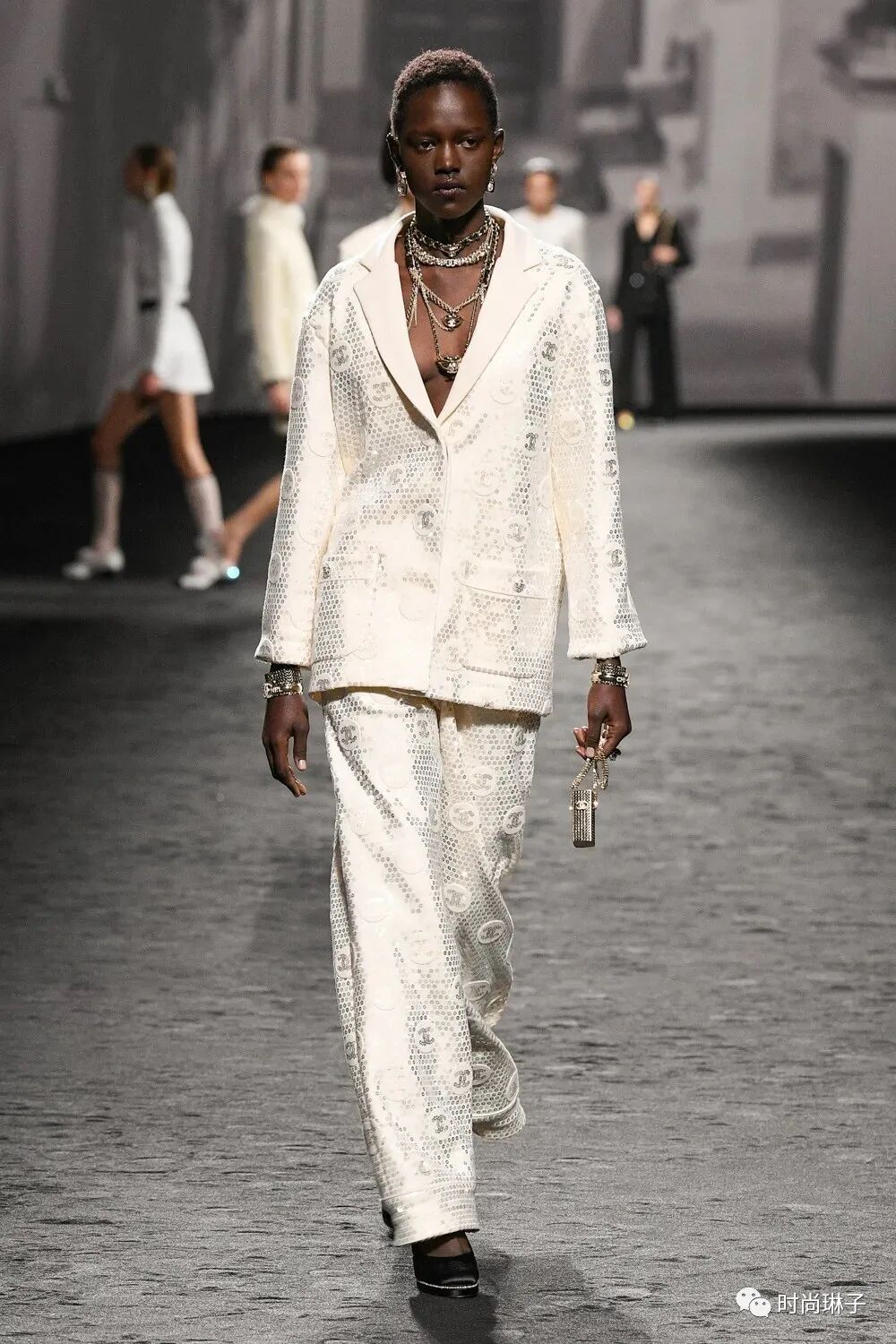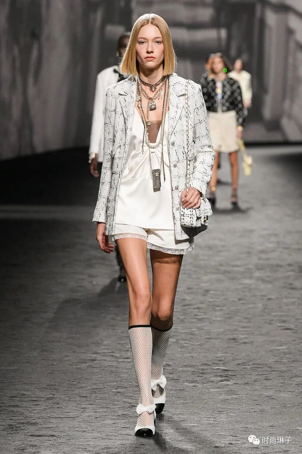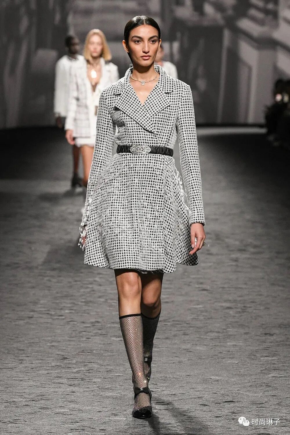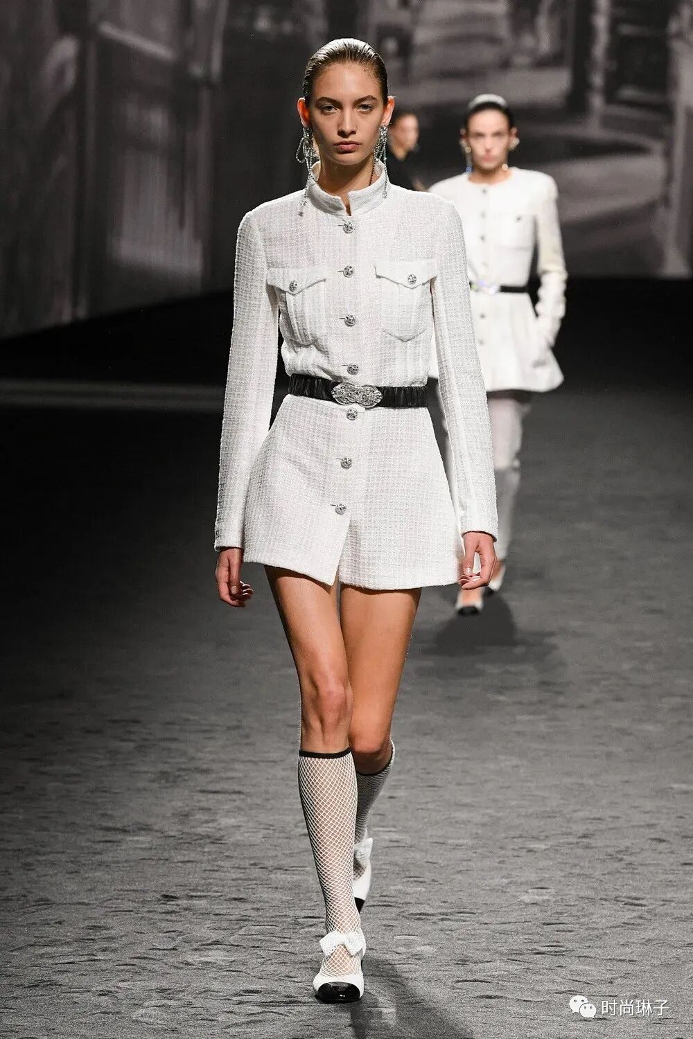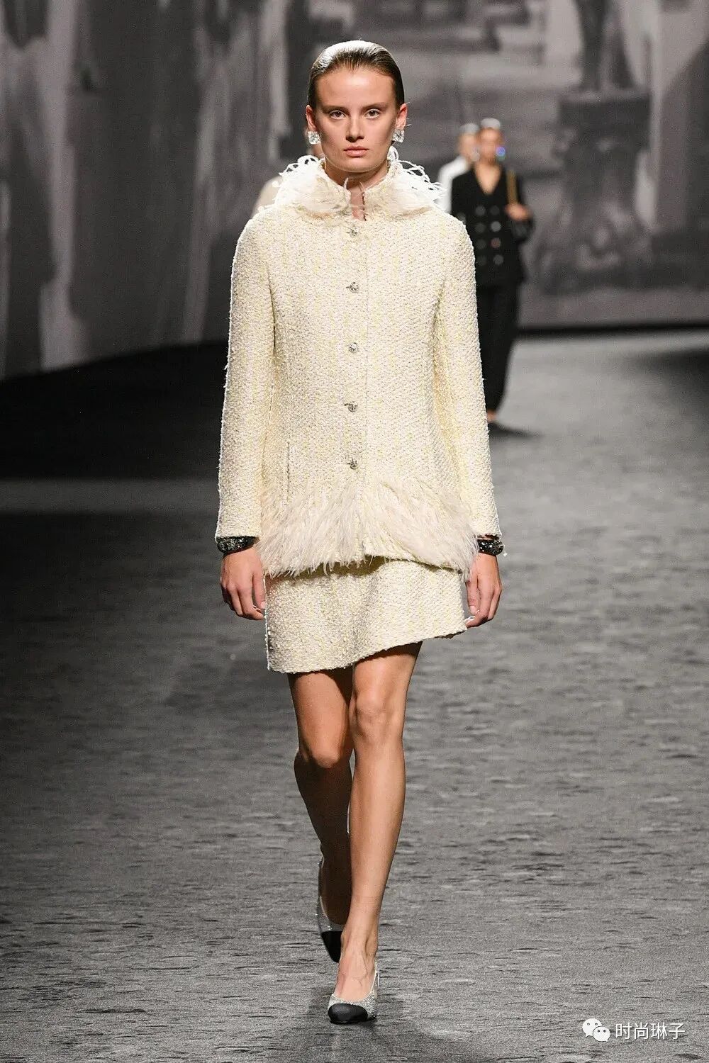 香奈儿2023 春夏时装秀以电影《去年在马里昂巴德》剧照印花上衣开场,致敬创始人香奈儿女士的优雅设计。