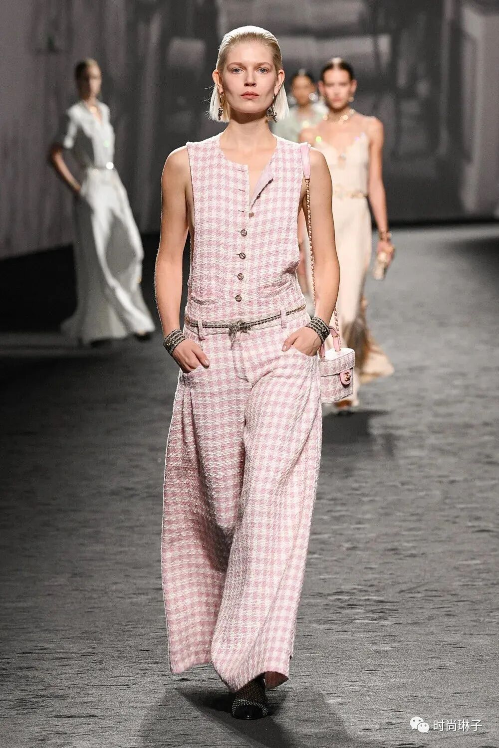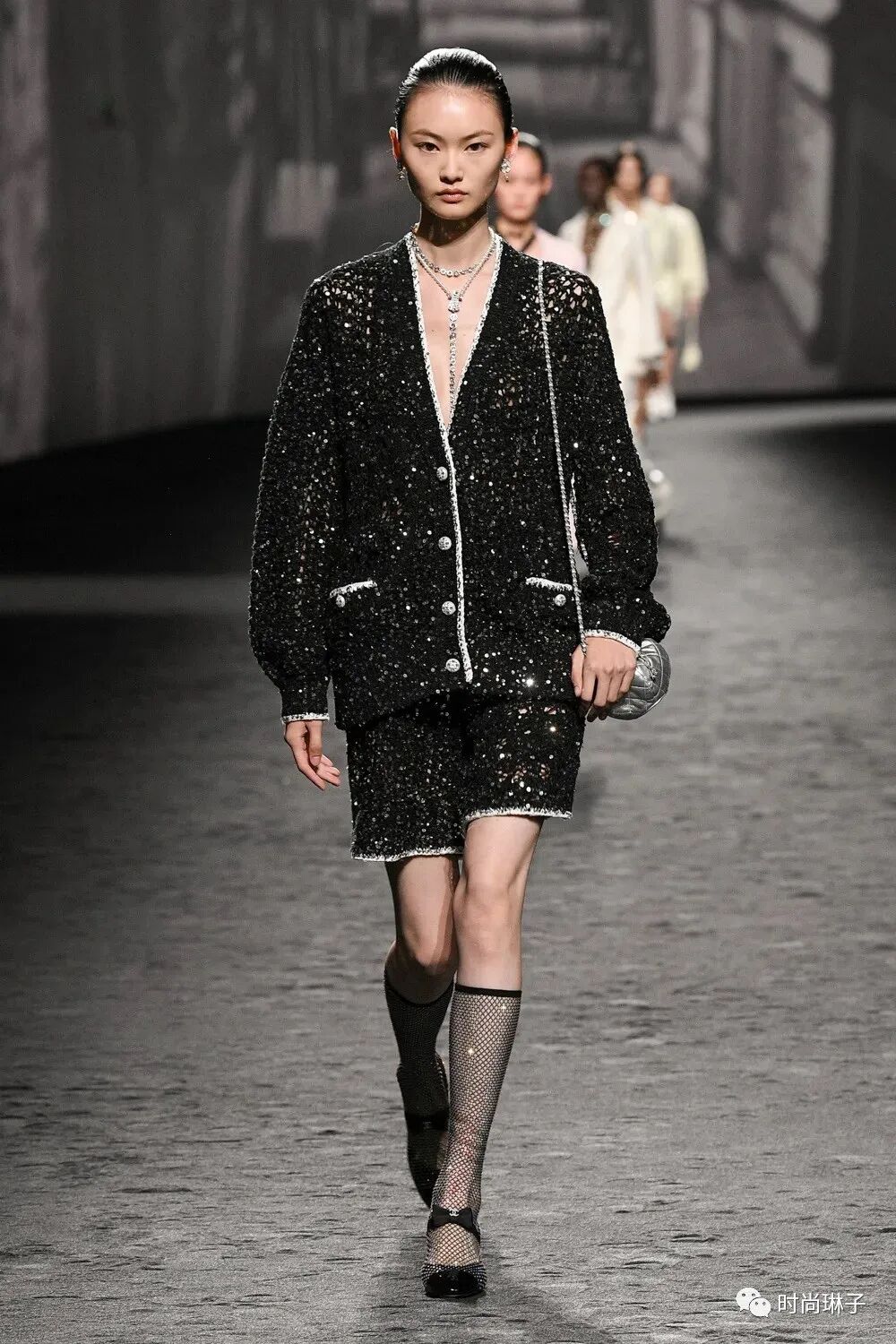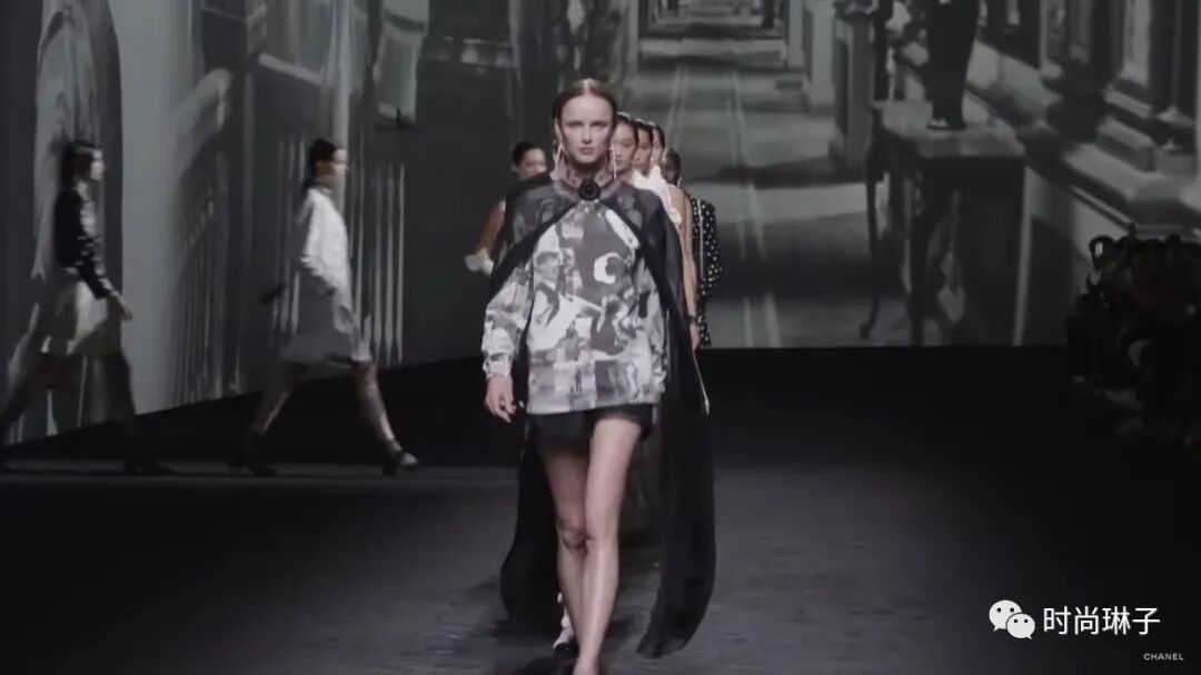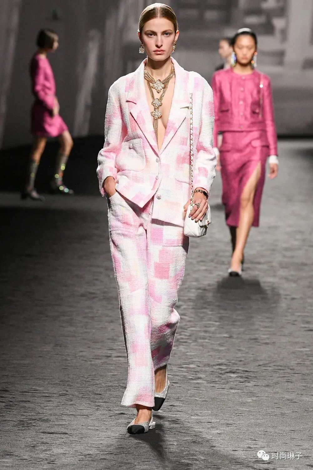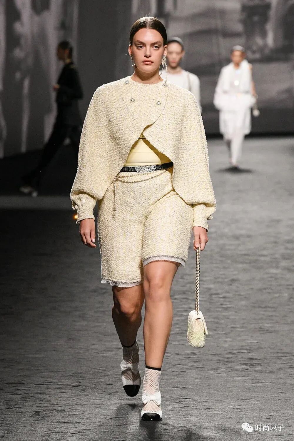 香奈儿2023 春夏时装秀以电影《去年在马里昂巴德》剧照印花上衣开场,致敬创始人香奈儿女士的优雅设计。