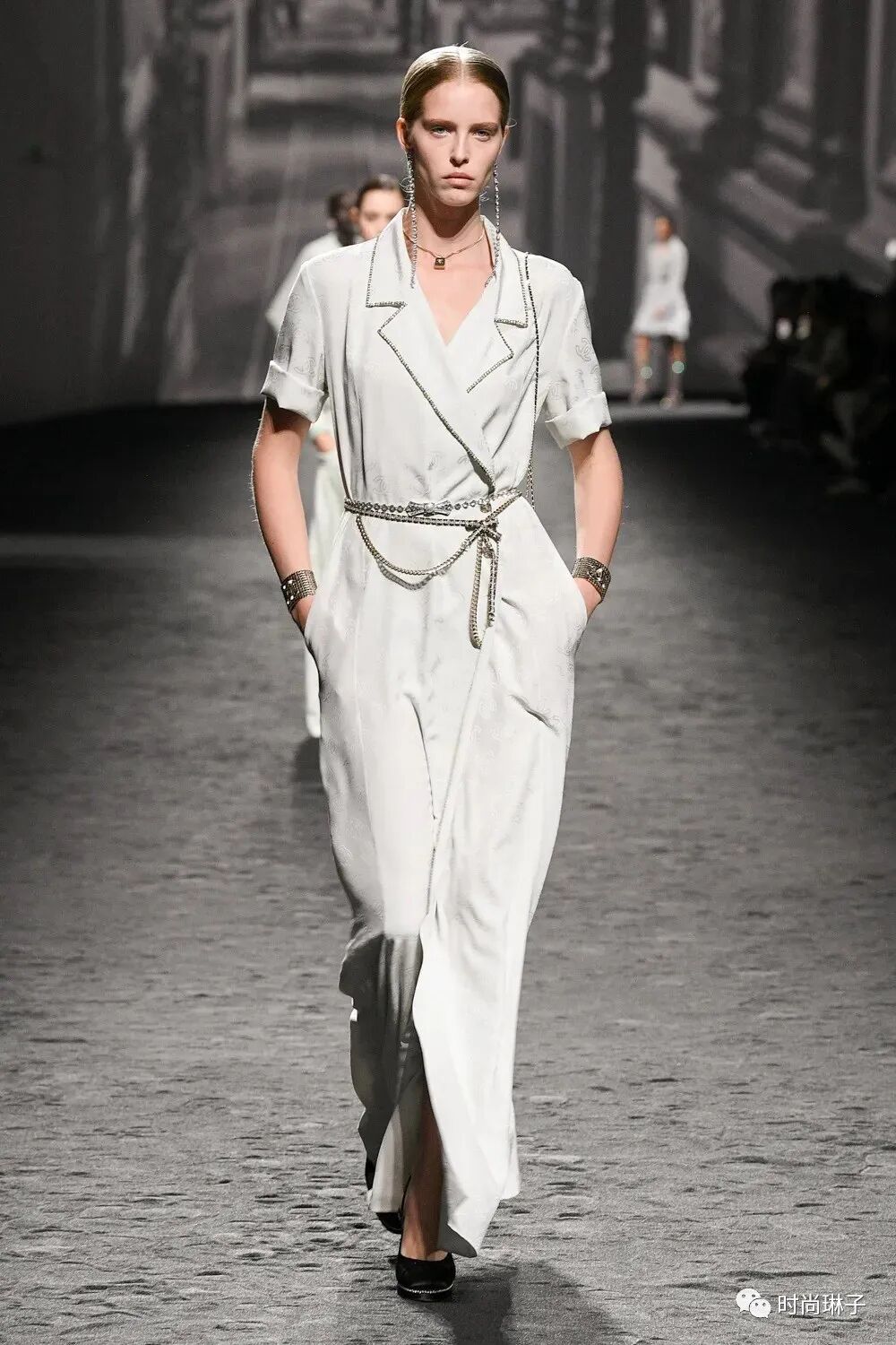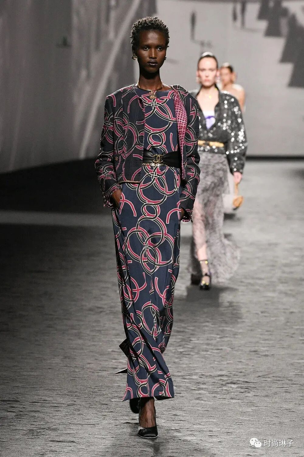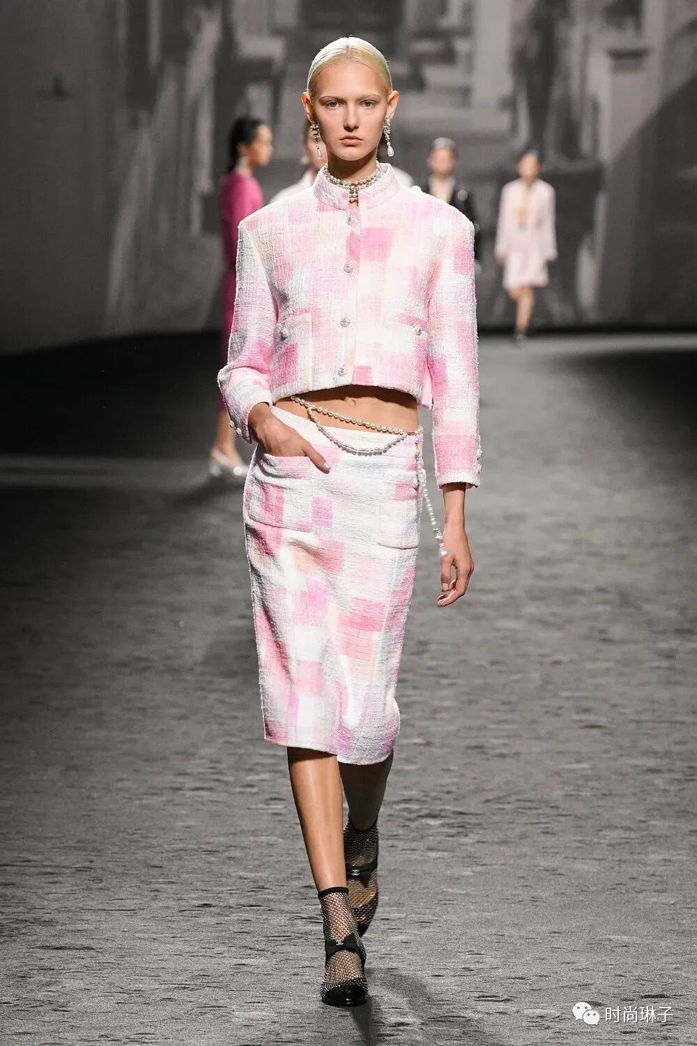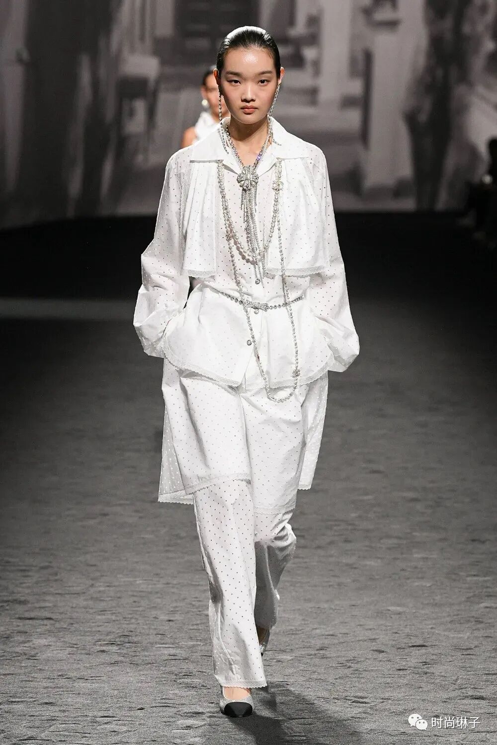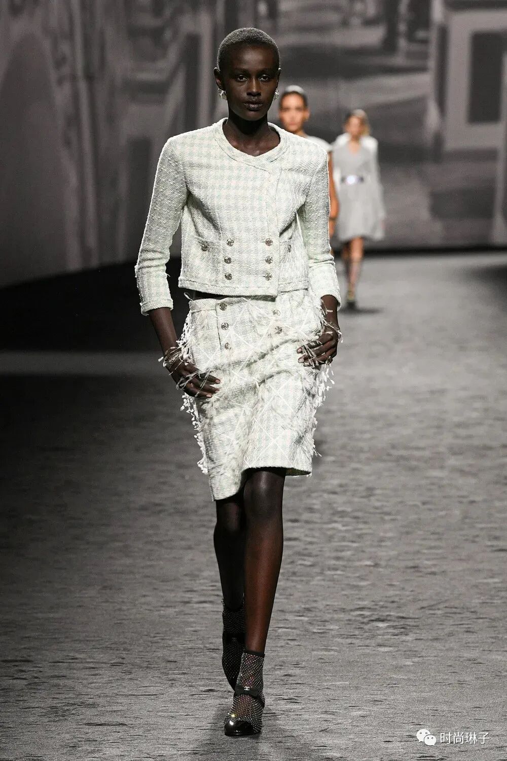香奈儿2023 春夏时装秀以电影《去年在马里昂巴德》剧照印花上衣开场,致敬创始人香奈儿女士的优雅设计。