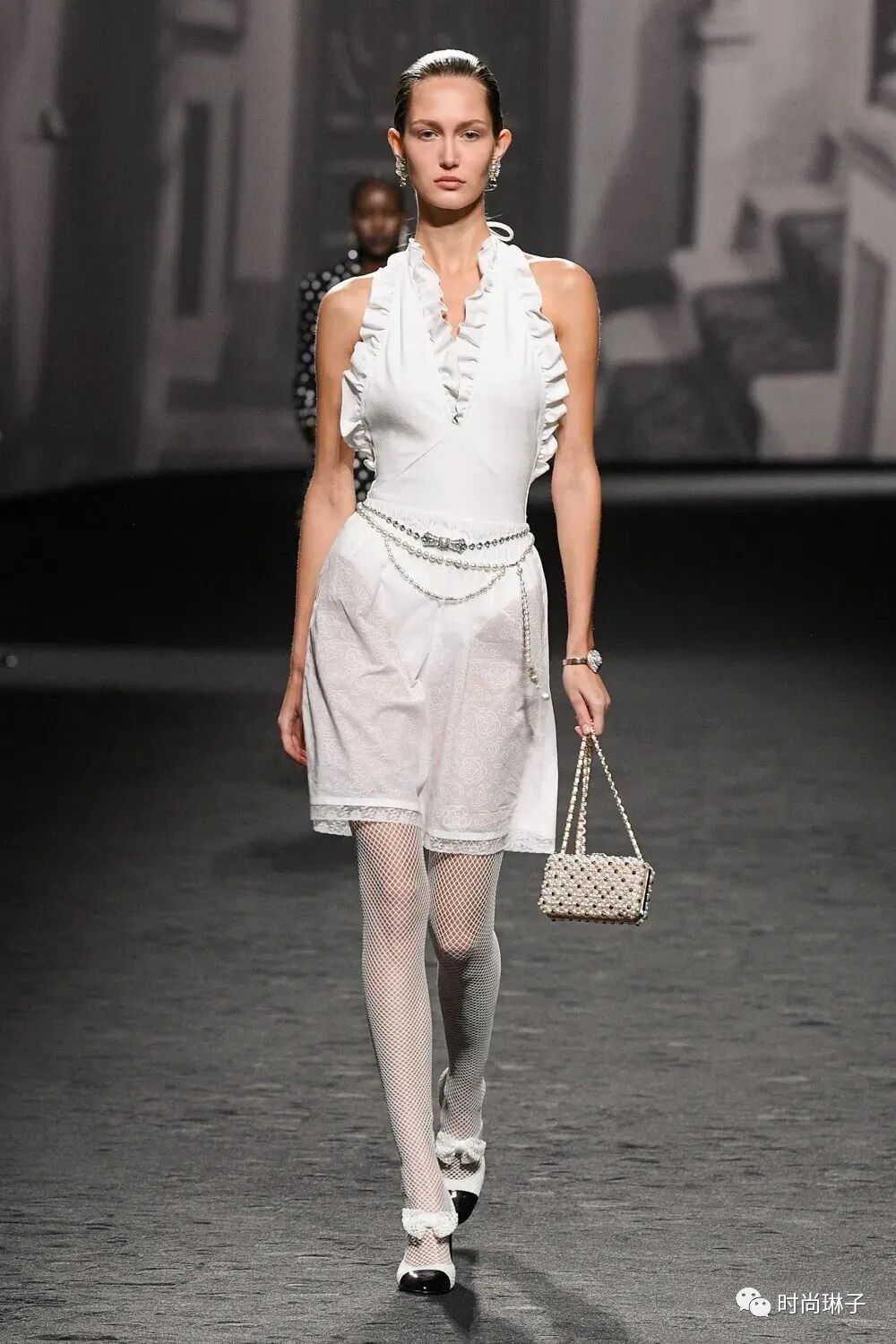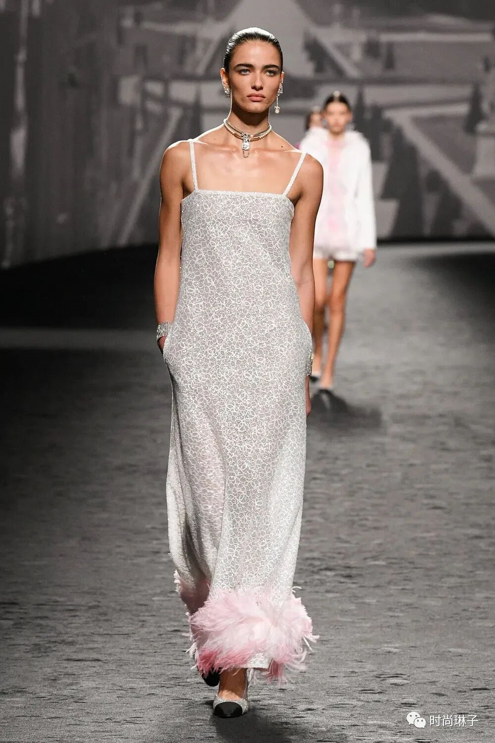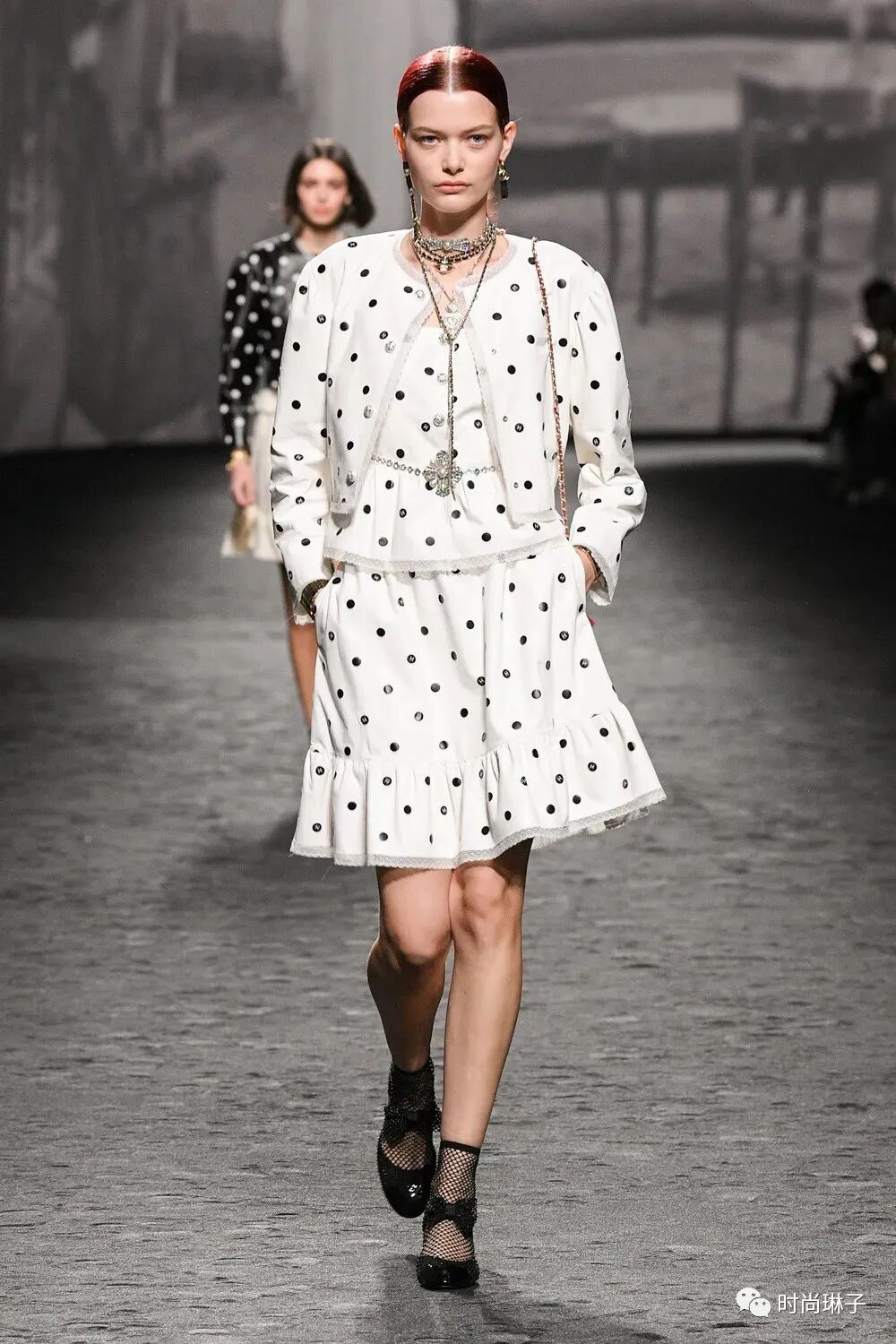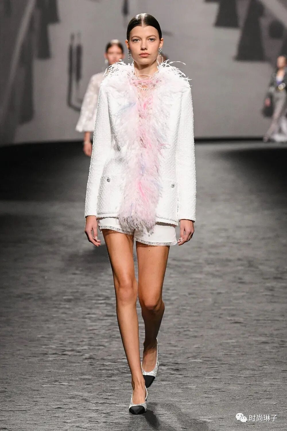 系列中的荷叶边,波尔卡圆点,亮片,羽毛,蝴蝶结,双C标志,以及花卉印花...... 等细节丰盈了该季服装的女性特质。