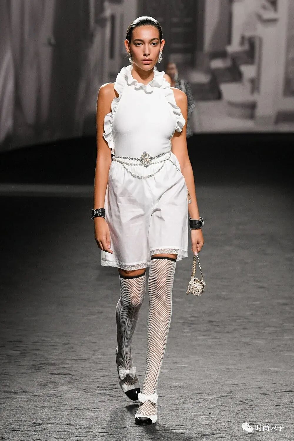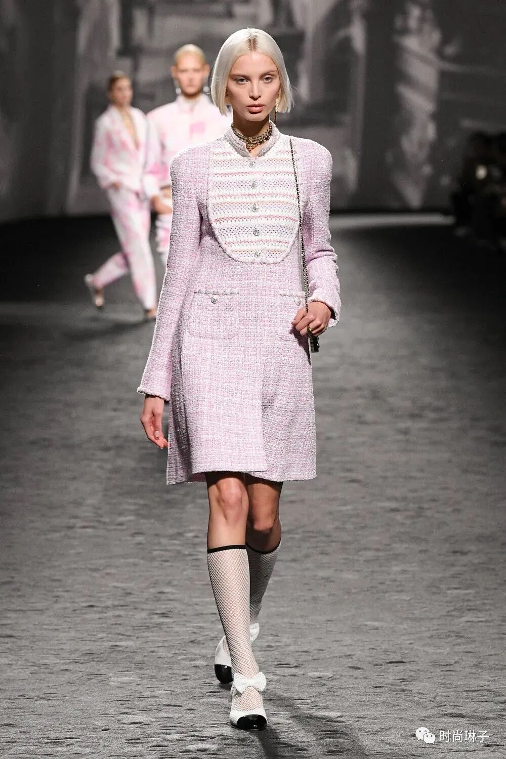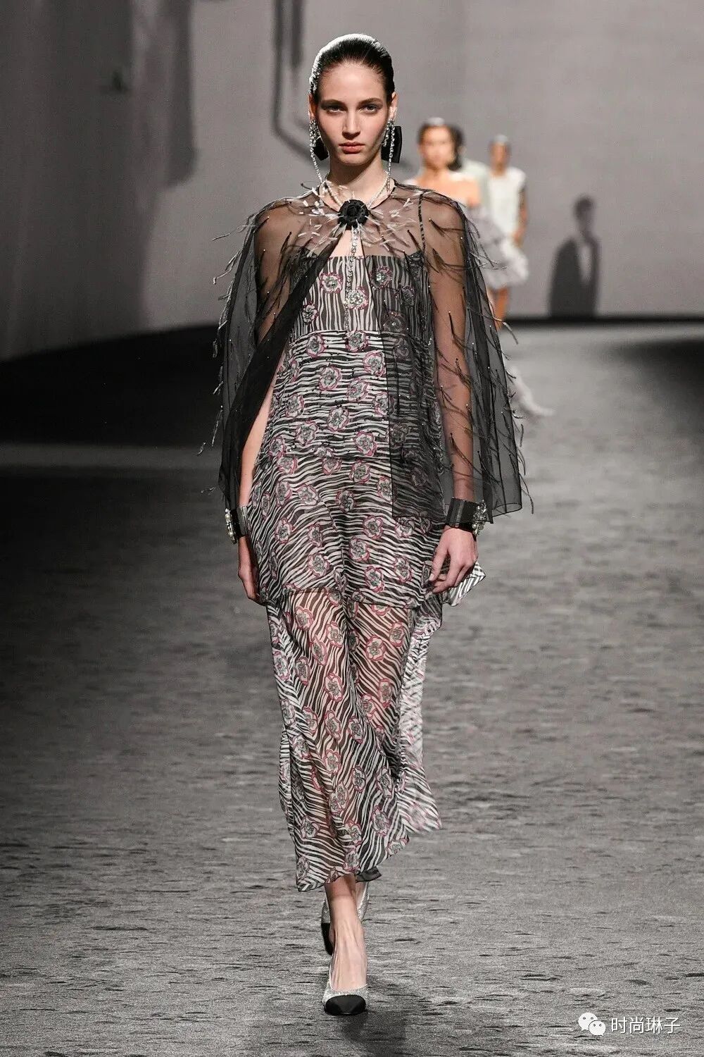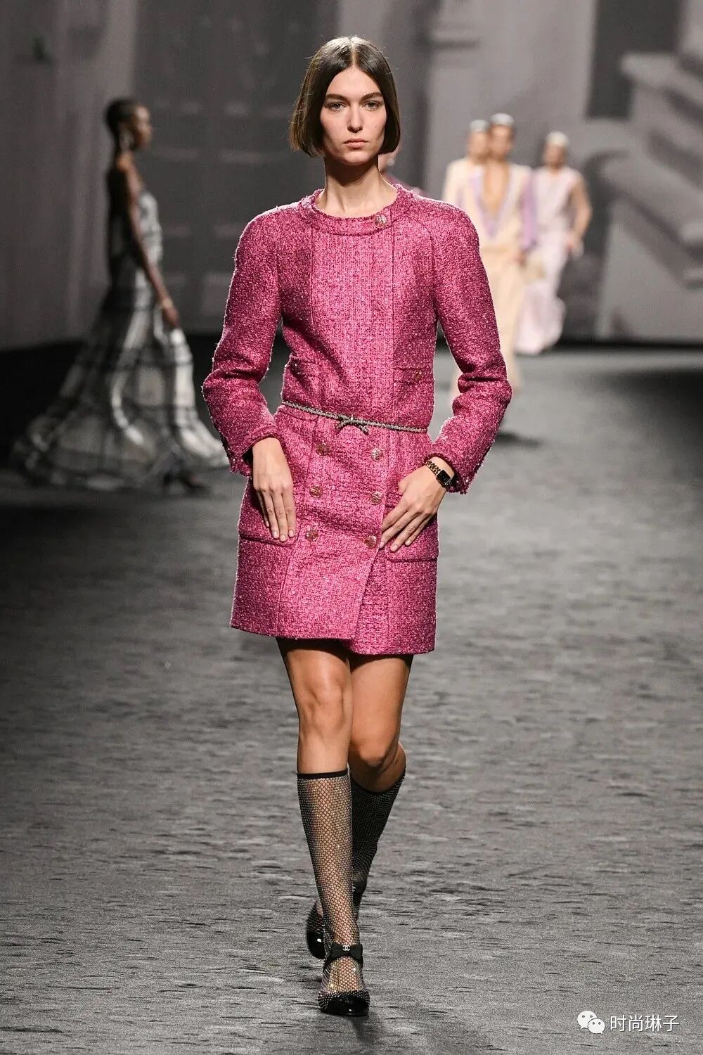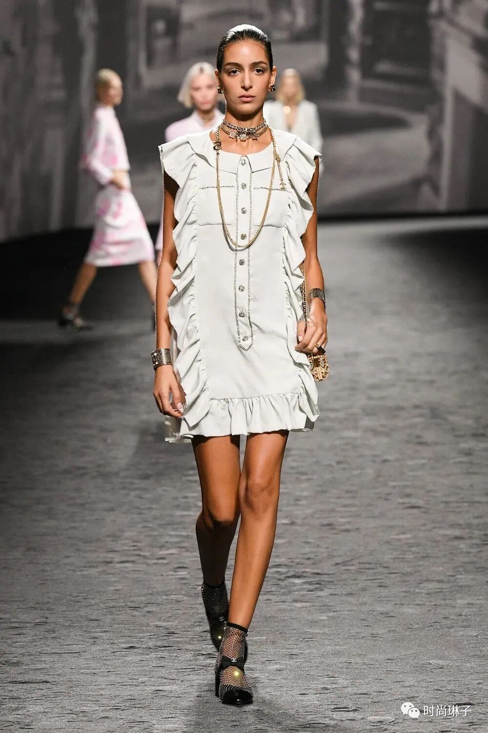 系列中的荷叶边,波尔卡圆点,亮片,羽毛,蝴蝶结,双C标志,以及花卉印花...... 等细节丰盈了该季服装的女性特质。
