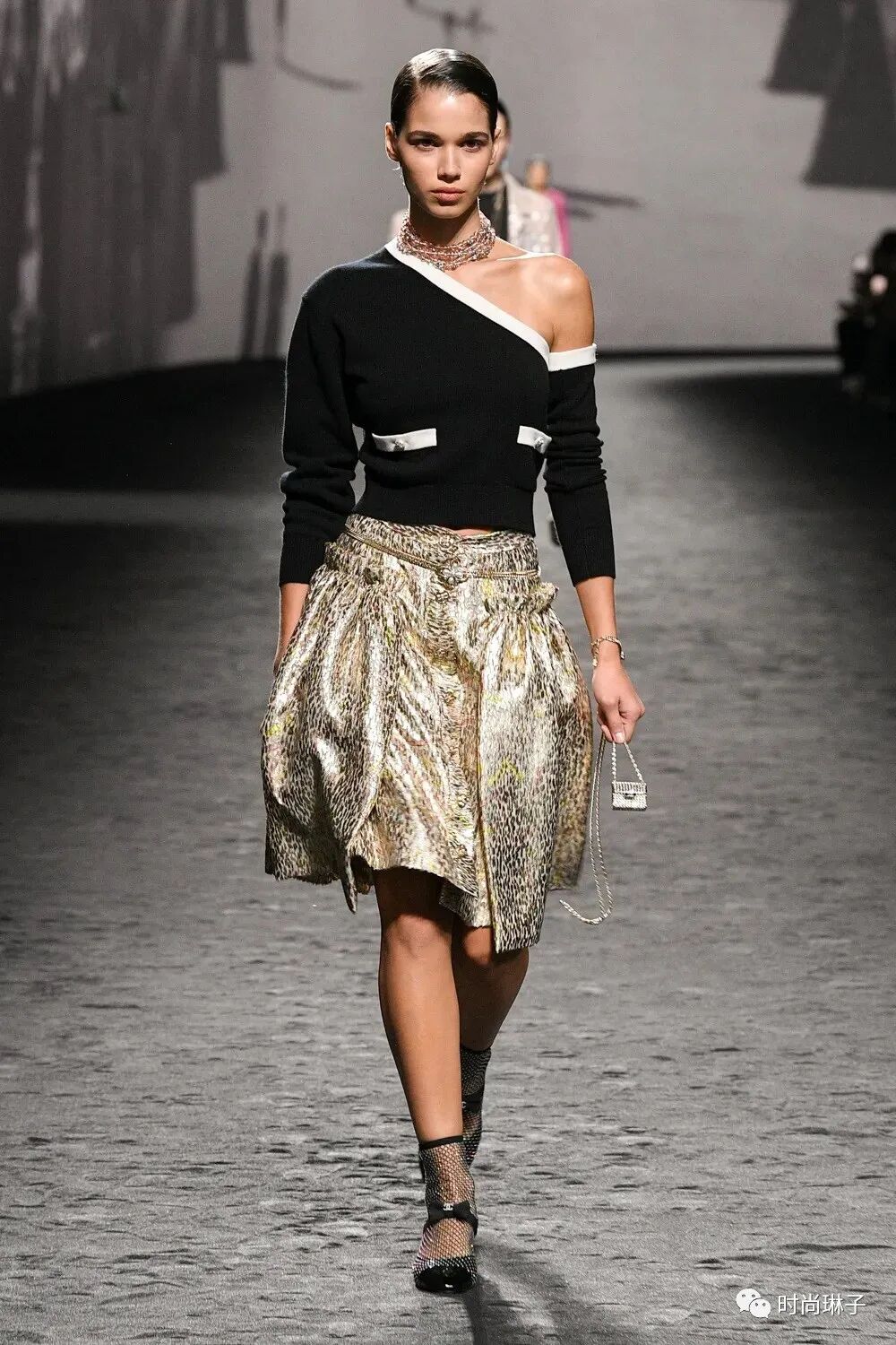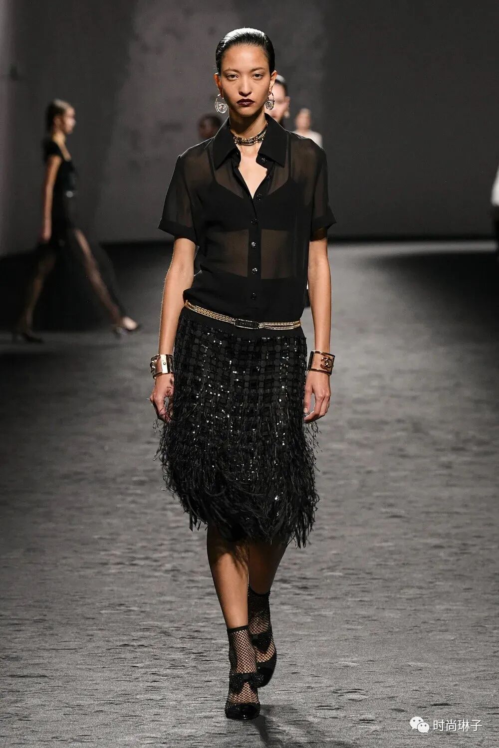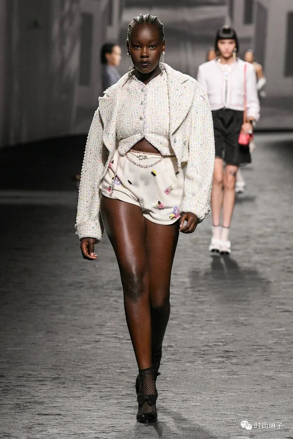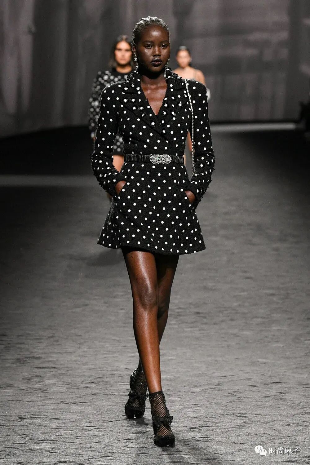 系列中的荷叶边,波尔卡圆点,亮片,羽毛,蝴蝶结,双C标志,以及花卉印花...... 等细节丰盈了该季服装的女性特质。