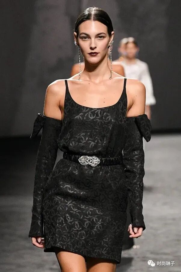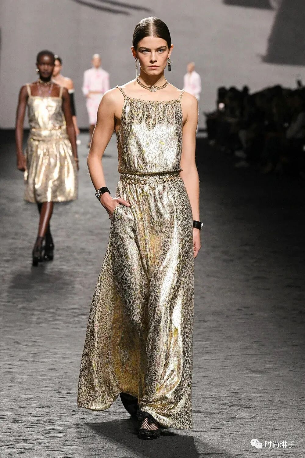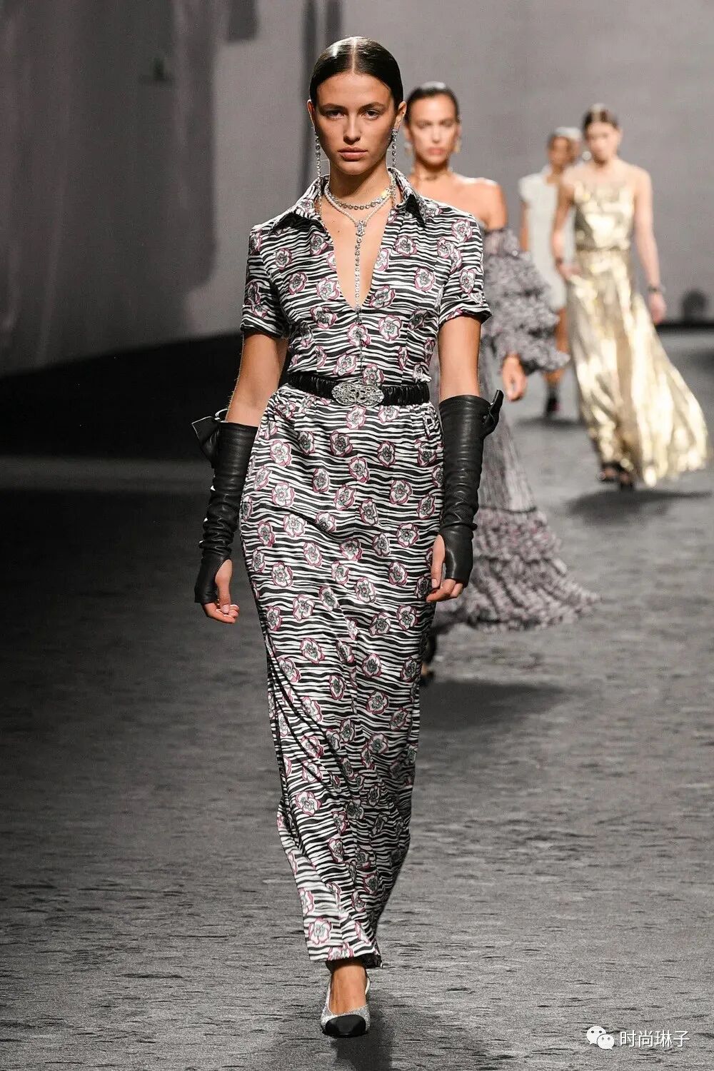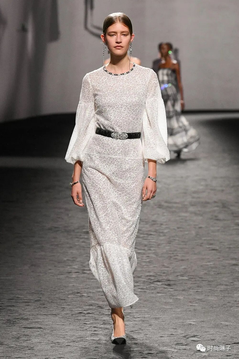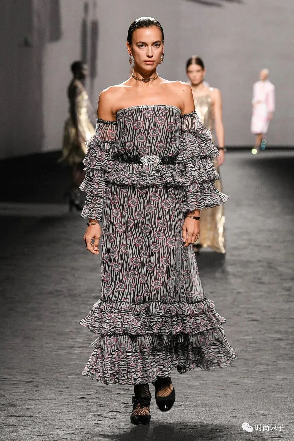 系列中的荷叶边,波尔卡圆点,亮片,羽毛,蝴蝶结,双C标志,以及花卉印花...... 等细节丰盈了该季服装的女性特质。