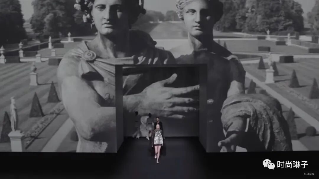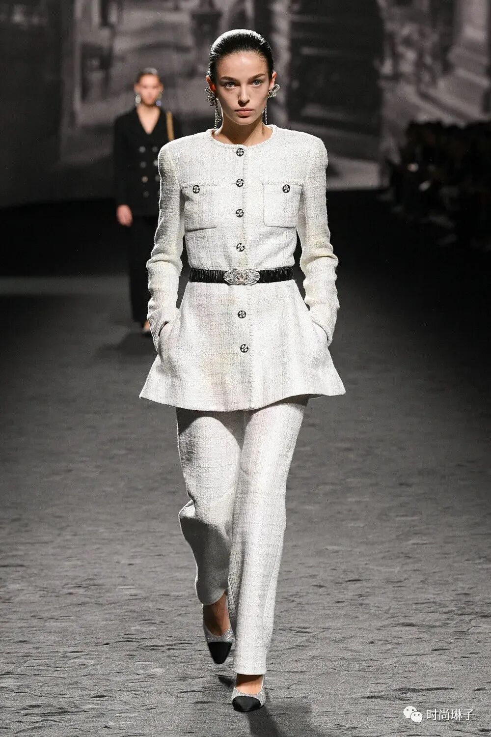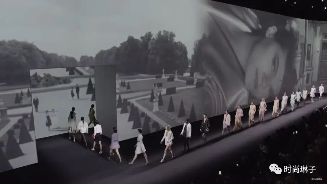 香奈儿2023 春夏时装秀于10月4日在巴黎大皇宫临时馆举行,黑白电影《去年在马里昂巴德》的剧照作为背景墙装饰着该季秀场。
