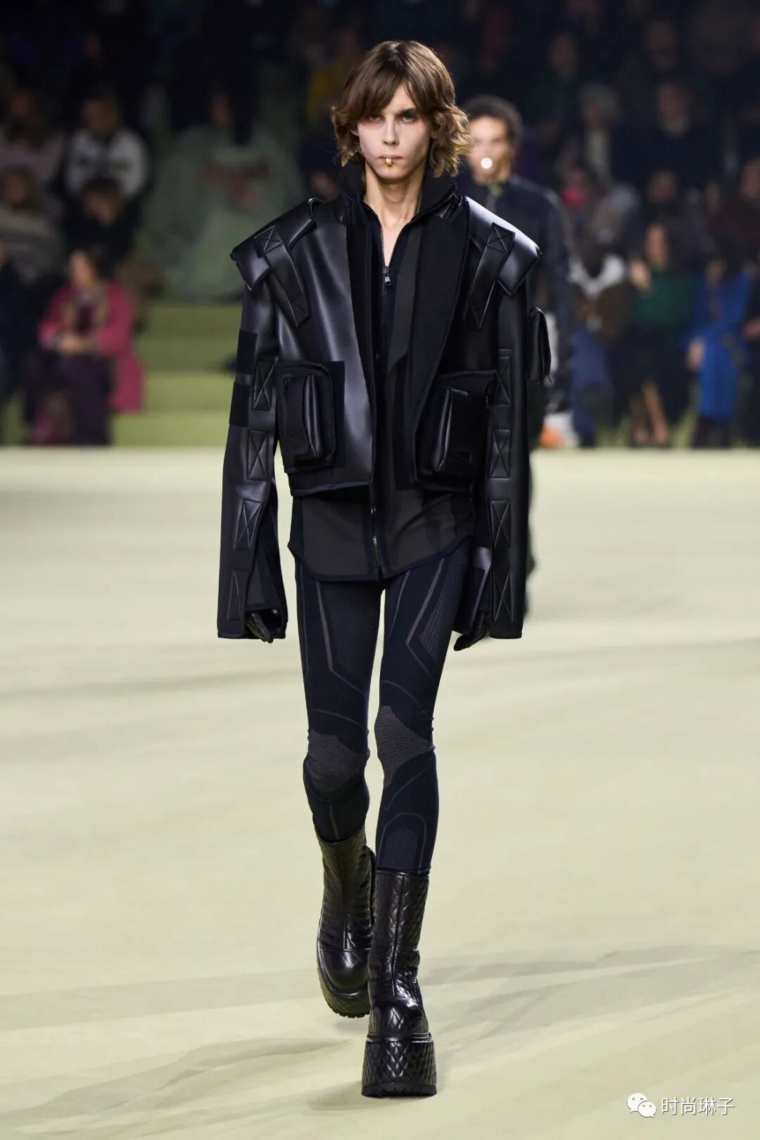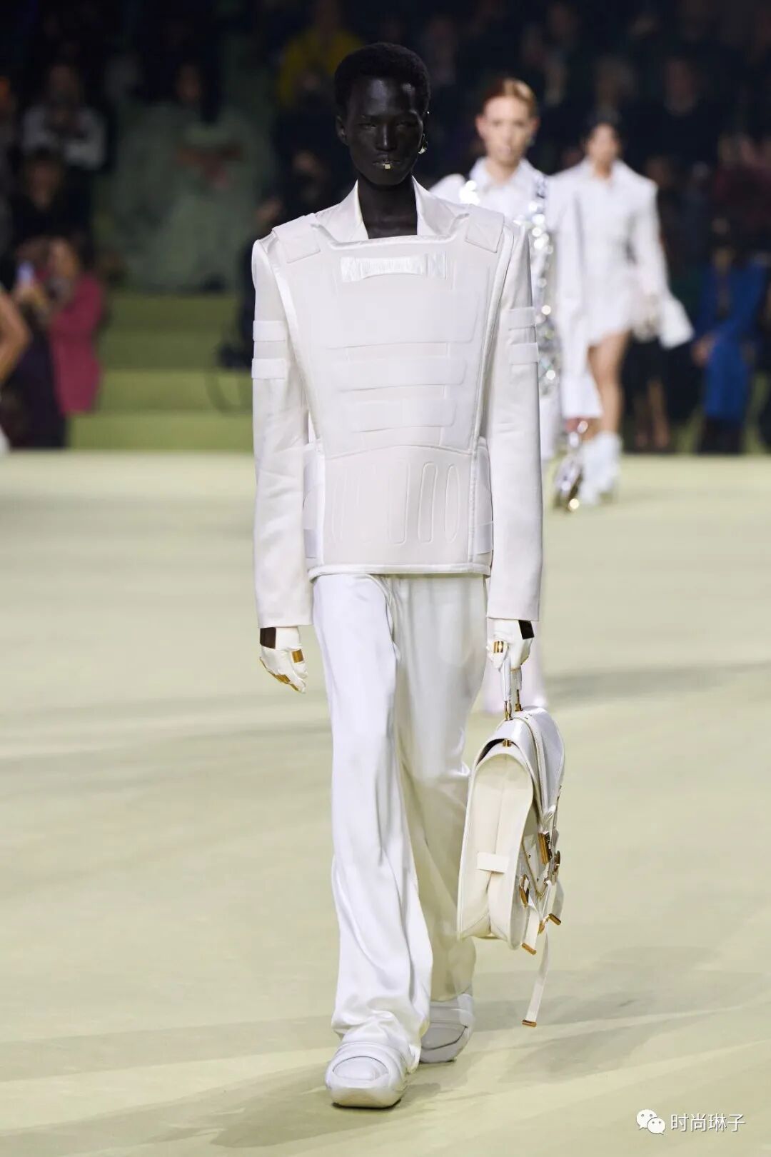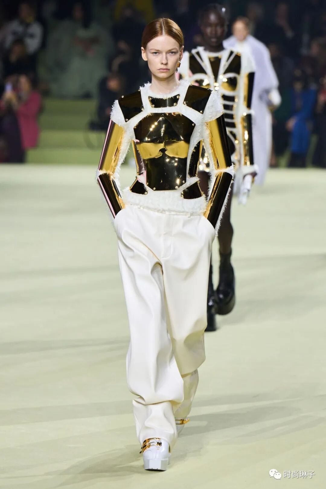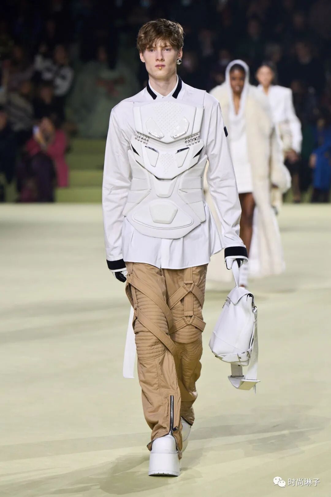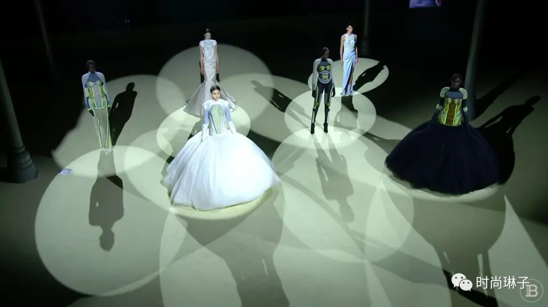 该季时装秀开始前,一群身着盔甲装扮的舞者上演了一场互相攻击的表演,但最后在两名舞者戏剧性地接吻下结束,或许化解一切冲突的只有爱和理解吧。