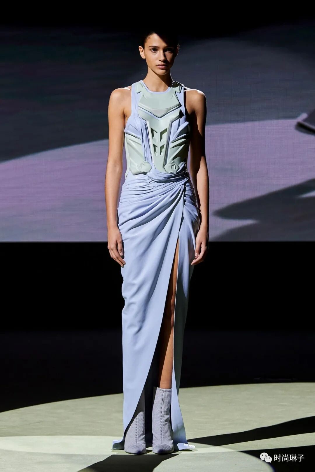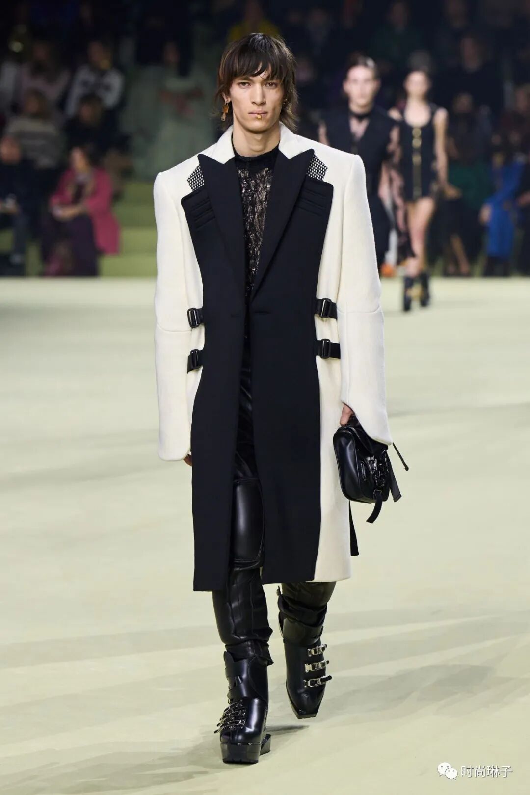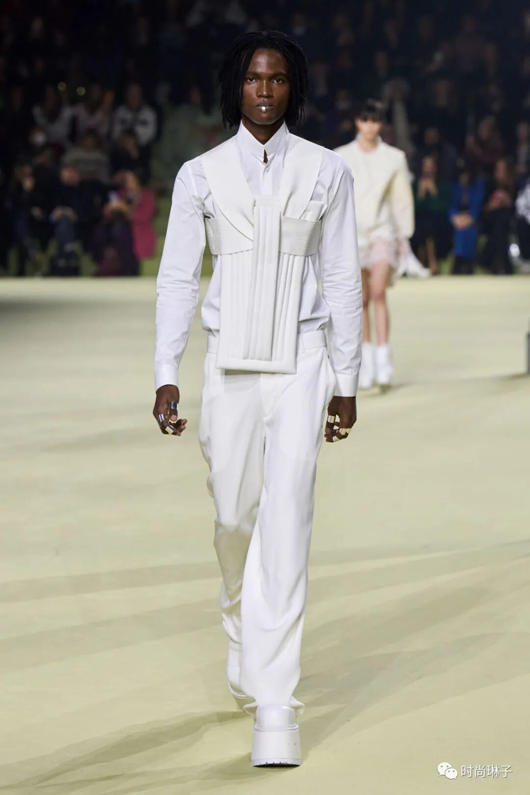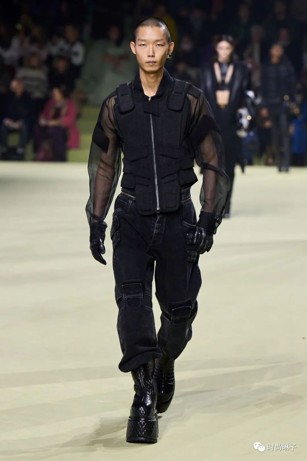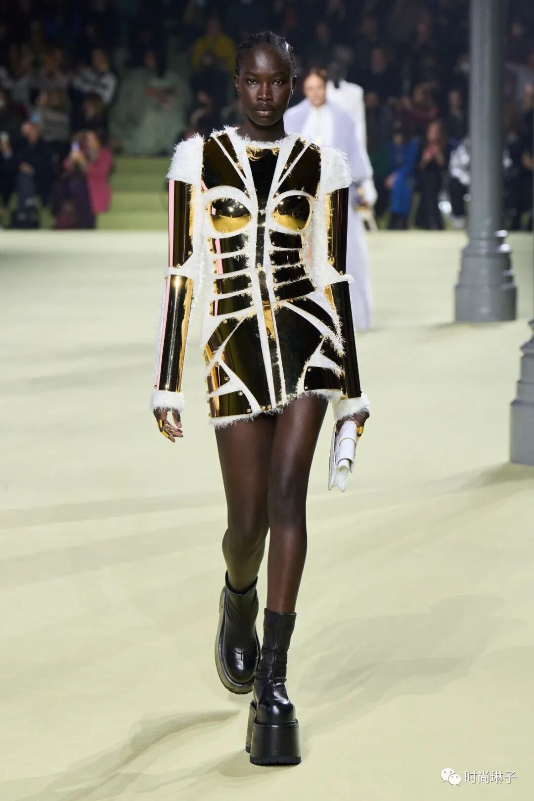该季时装秀开始前,一群身着盔甲装扮的舞者上演了一场互相攻击的表演,但最后在两名舞者戏剧性地接吻下结束,或许化解一切冲突的只有爱和理解吧。