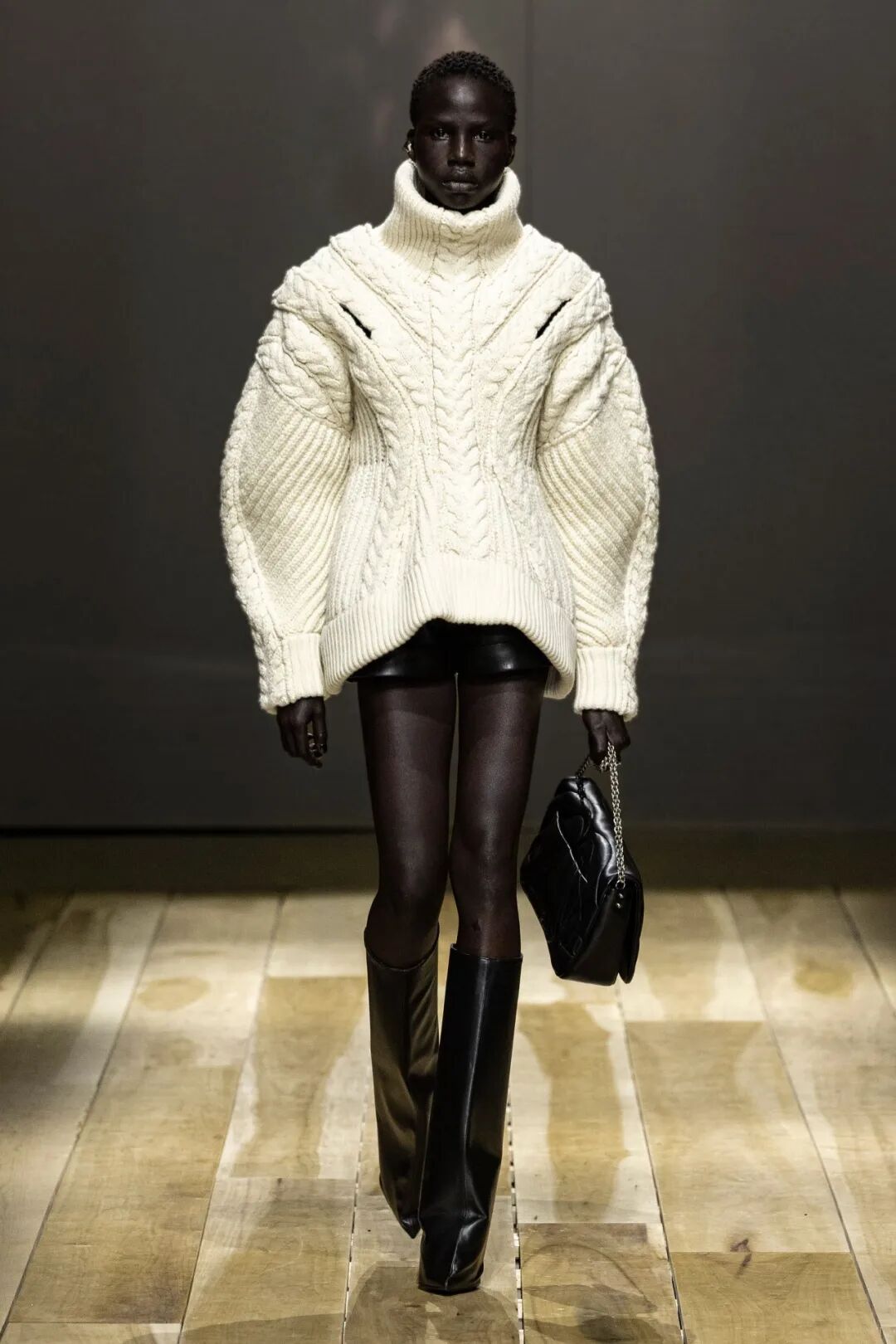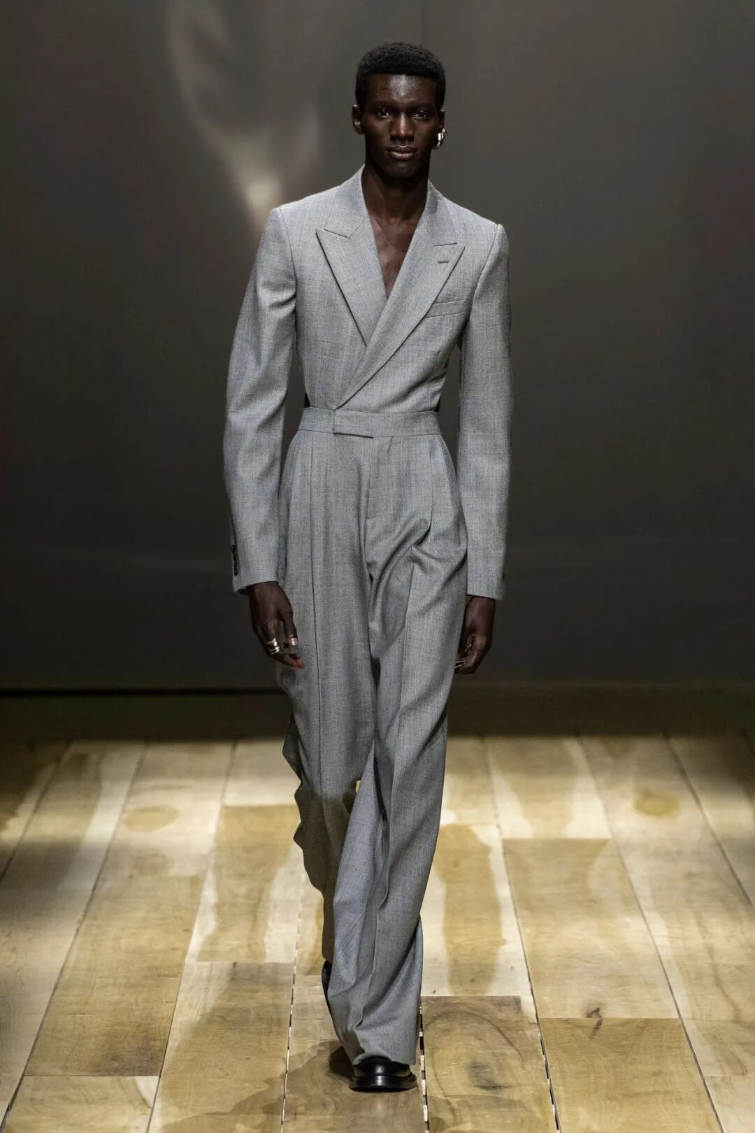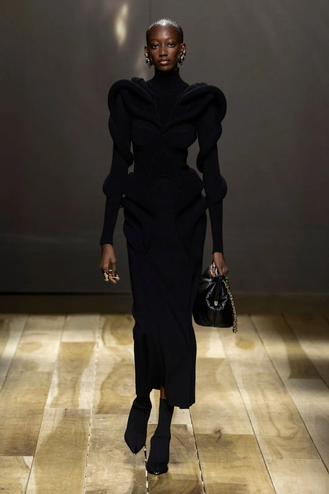 Alexander McQueen2023 AW仿佛回到了麦昆在萨维尔街的开端,专注于剪裁、比例和轮廓,借助精裁技艺与精细面料(如皮质、黑色羊毛巴拉西厄面料、羊绒、光洁厚实的聚酯罗缎等)探寻美与力量。