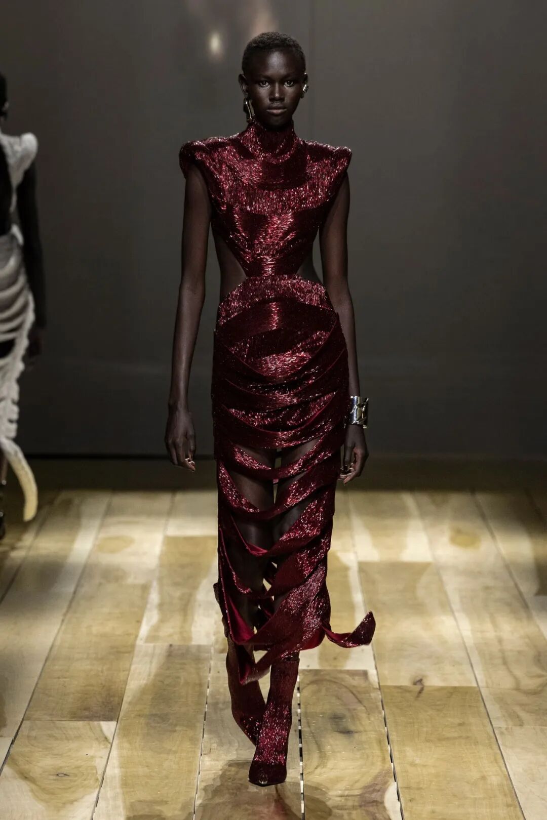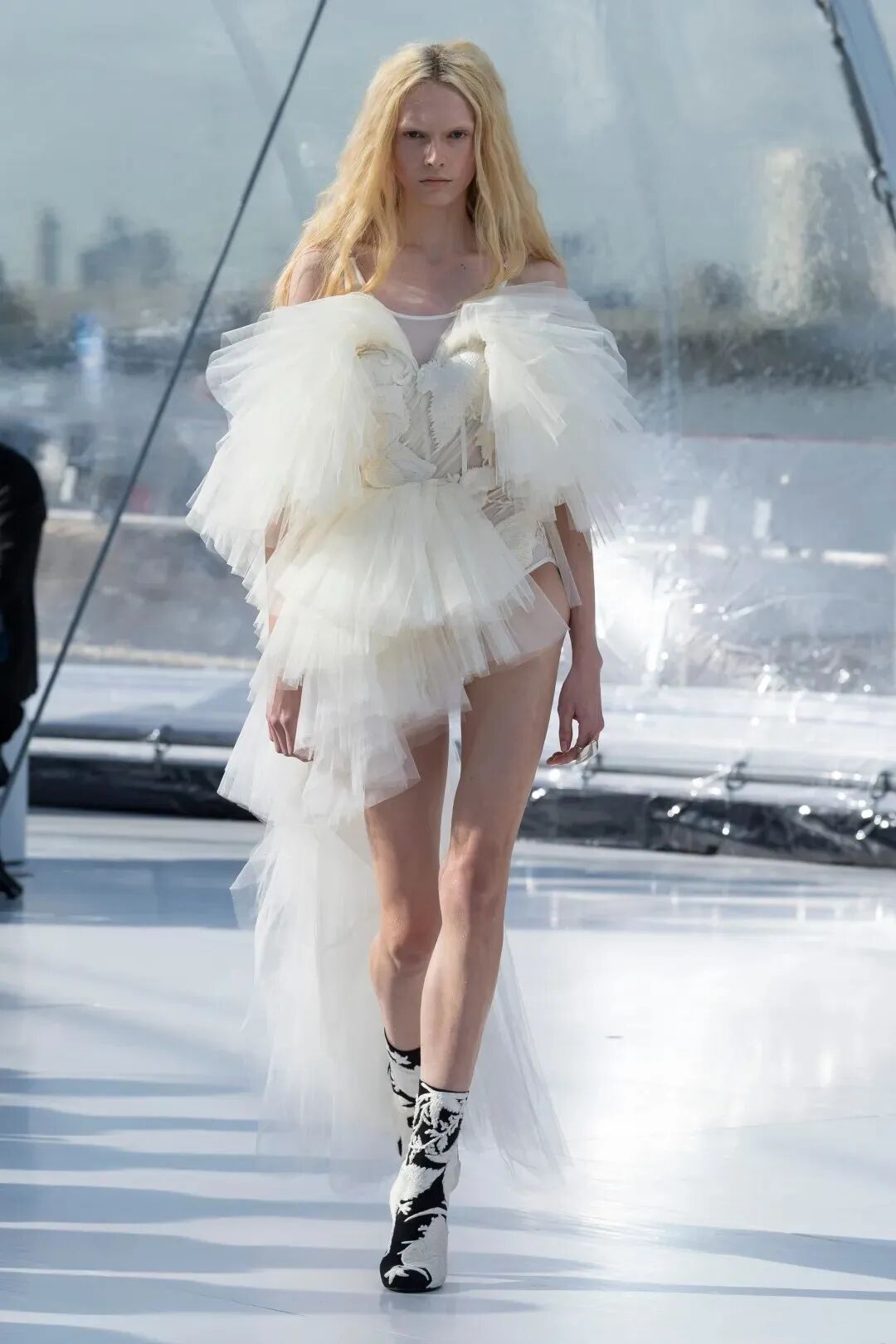 2023SS系列“第一眼!”是关于寻找人性和人文联系的。在Sarah Burton的创意指导下,古典又朋克,优雅浪漫。锐利、富有创意的剪裁,雕塑般的解剖、切割、不对称轮廓,正如Sarah Burton所说“我们的服装是为了赋予力量而设计的”。