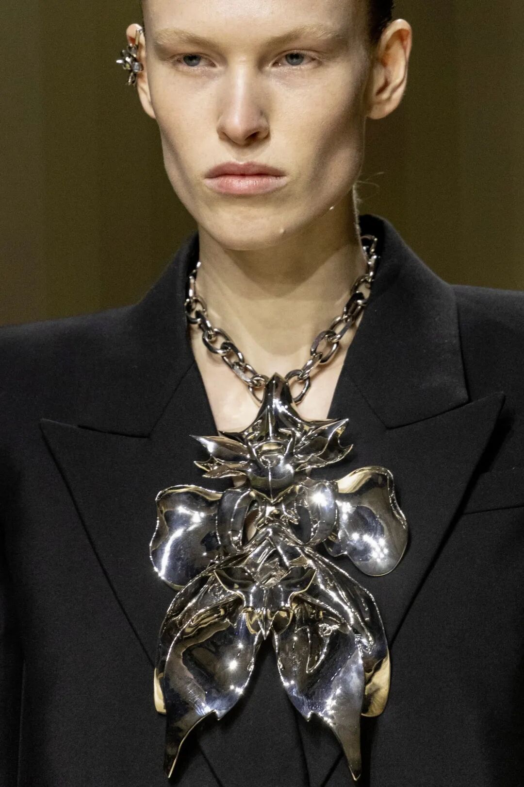 2023黎时装周,后麦昆时代创意总监莎拉·伯顿发布Alexander McQueen23秋冬“Anatomy”系列,借助精裁技艺与精细面料探寻美与力量,专注剪裁、比例和轮廓。并将经典的单品通过内外翻转或者上下倒置等方式进行解构与创新,兰花作为贯穿系列的一大元素,兼具美丽与神秘。
