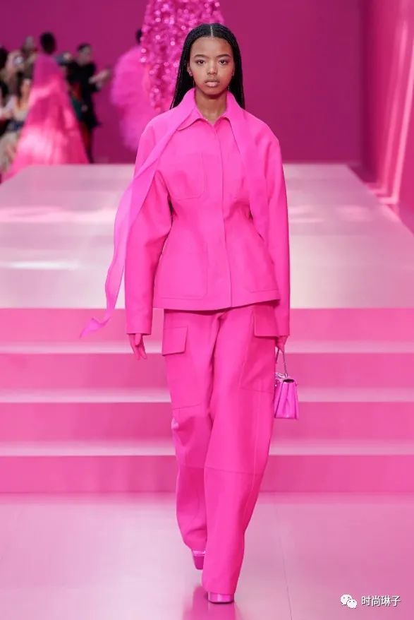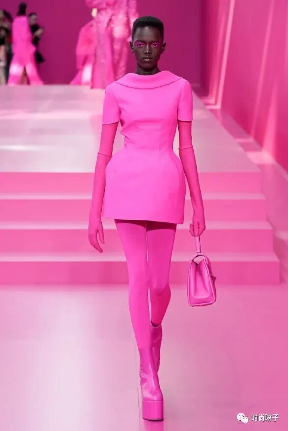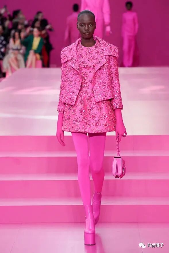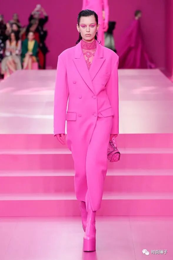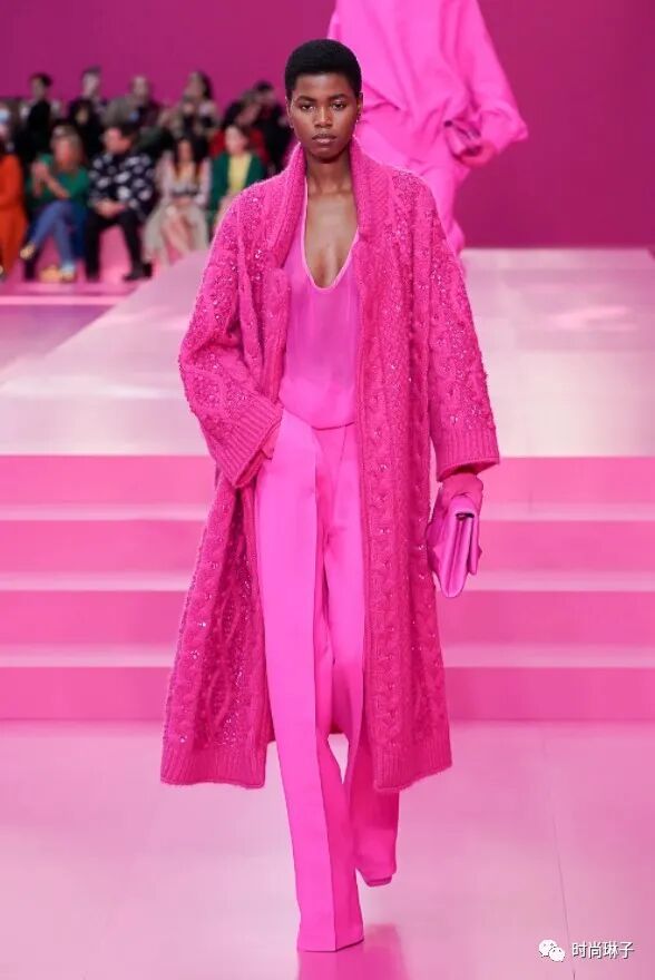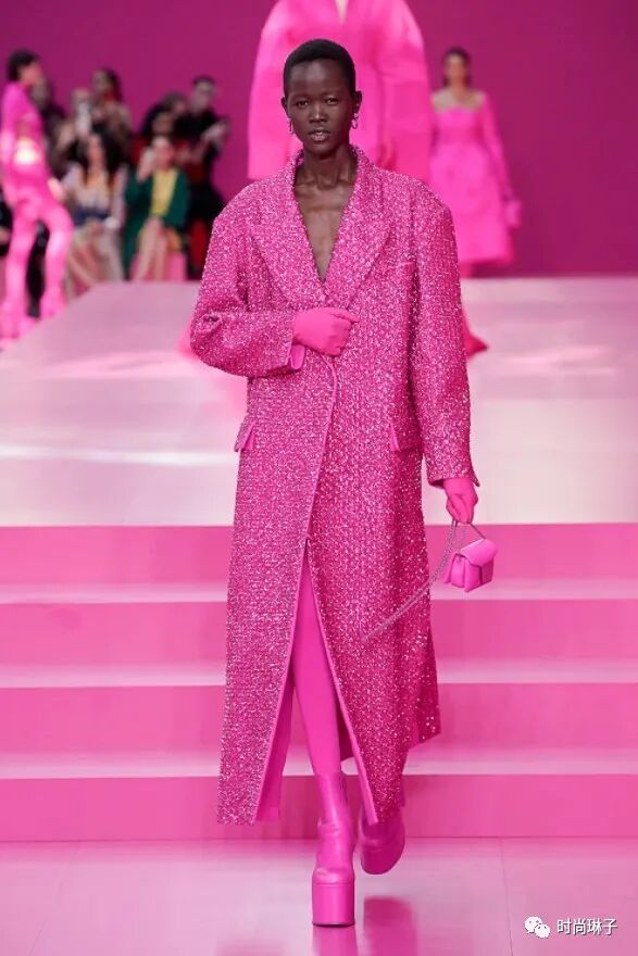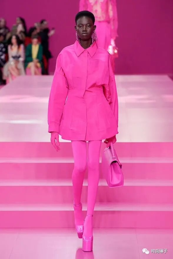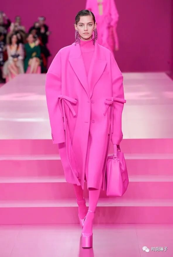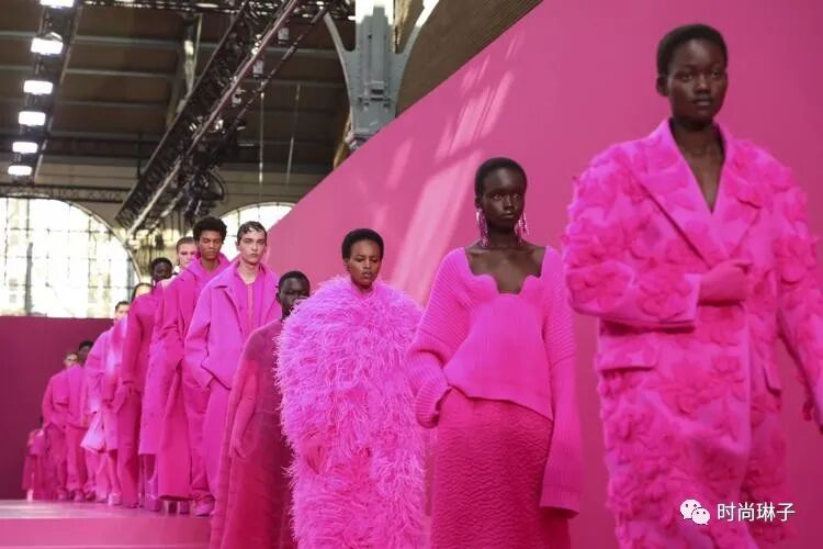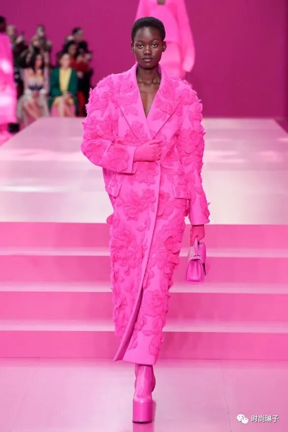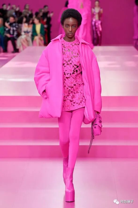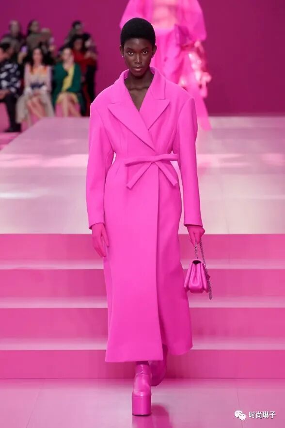 Valentino华伦天奴2022秋冬系列没有五颜六色的调色板,除了中性的黑色,弥漫整个眼球的只有迷人的粉红色。