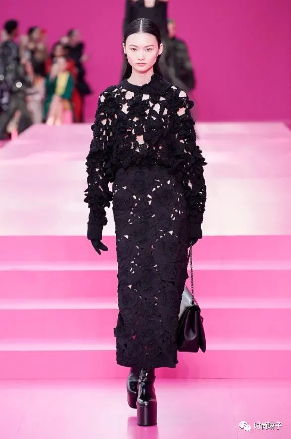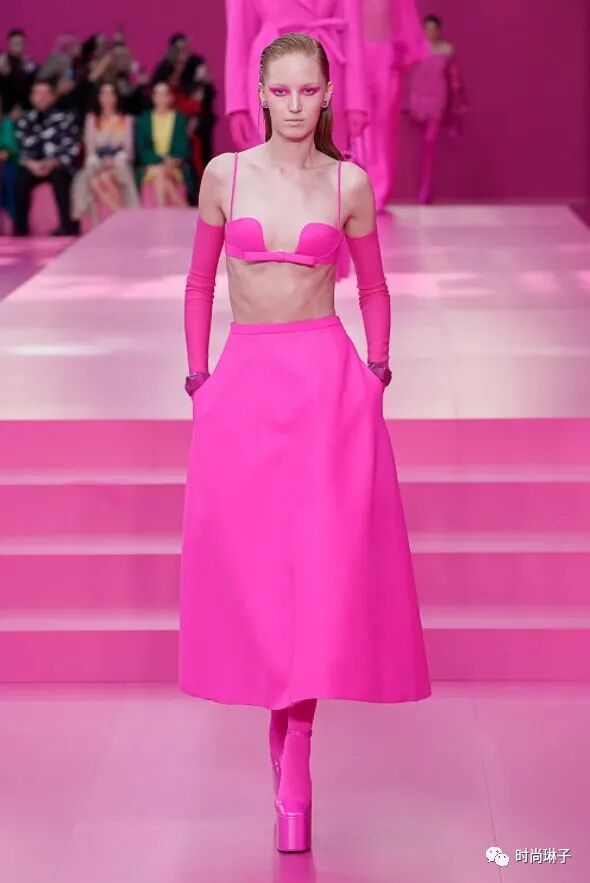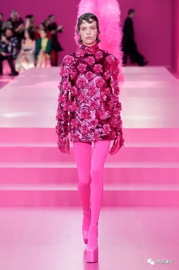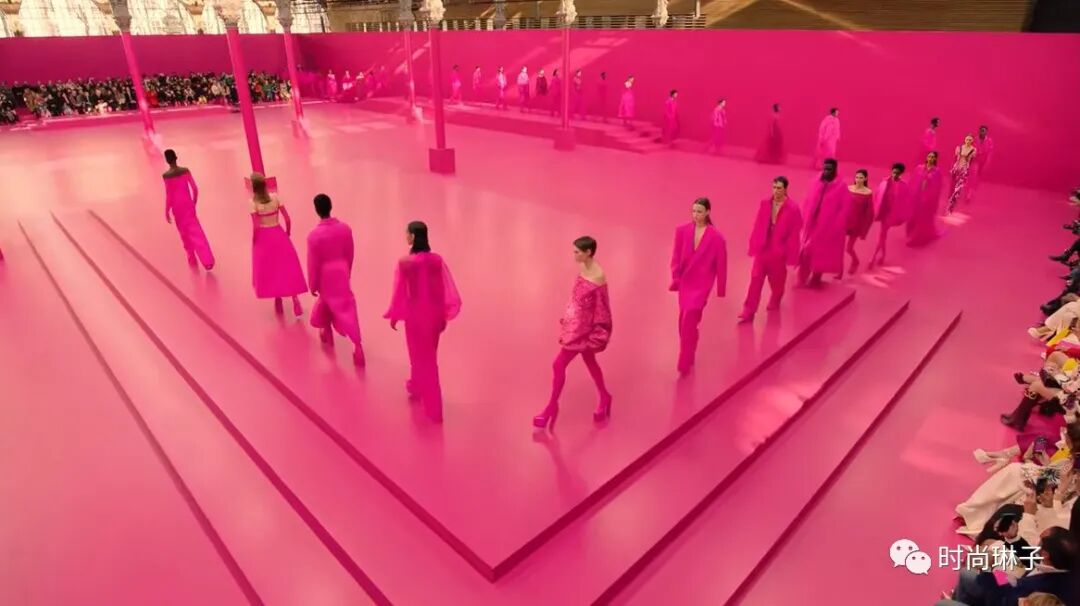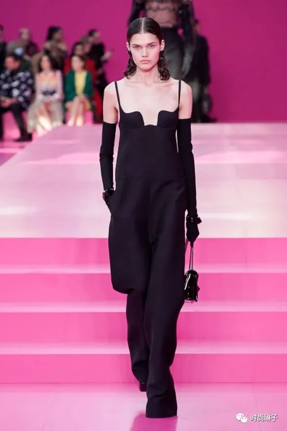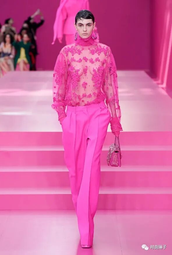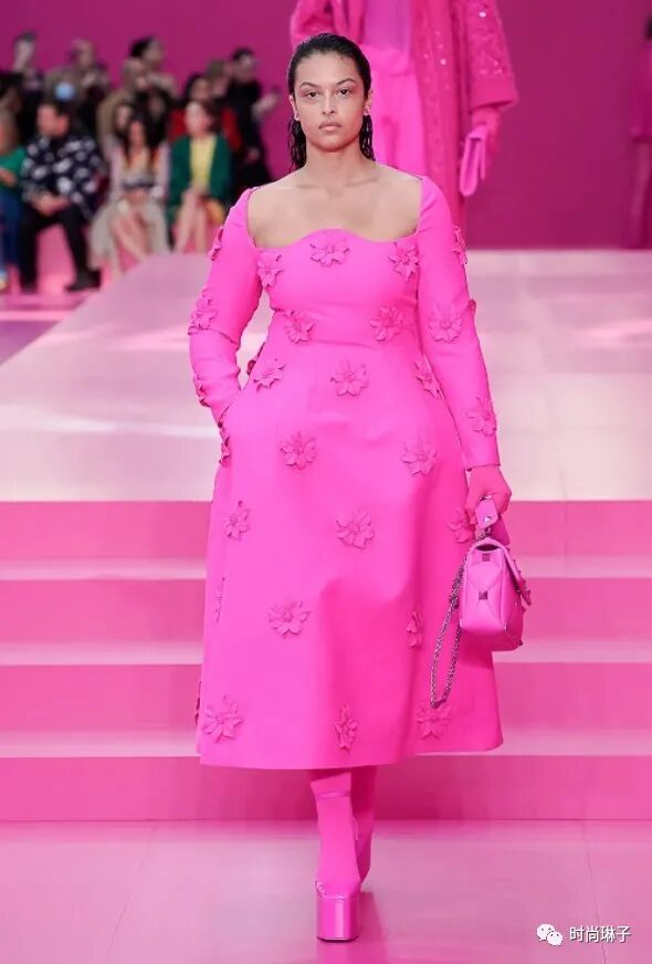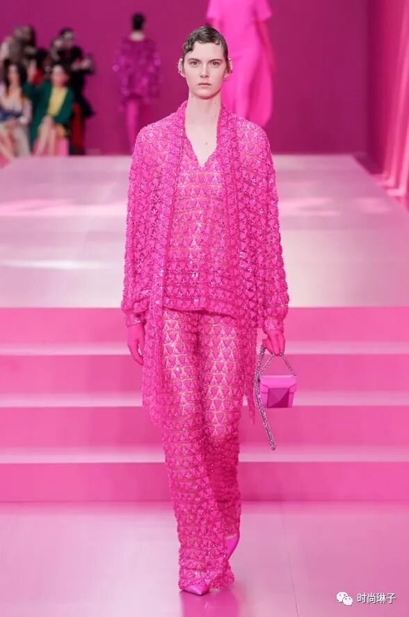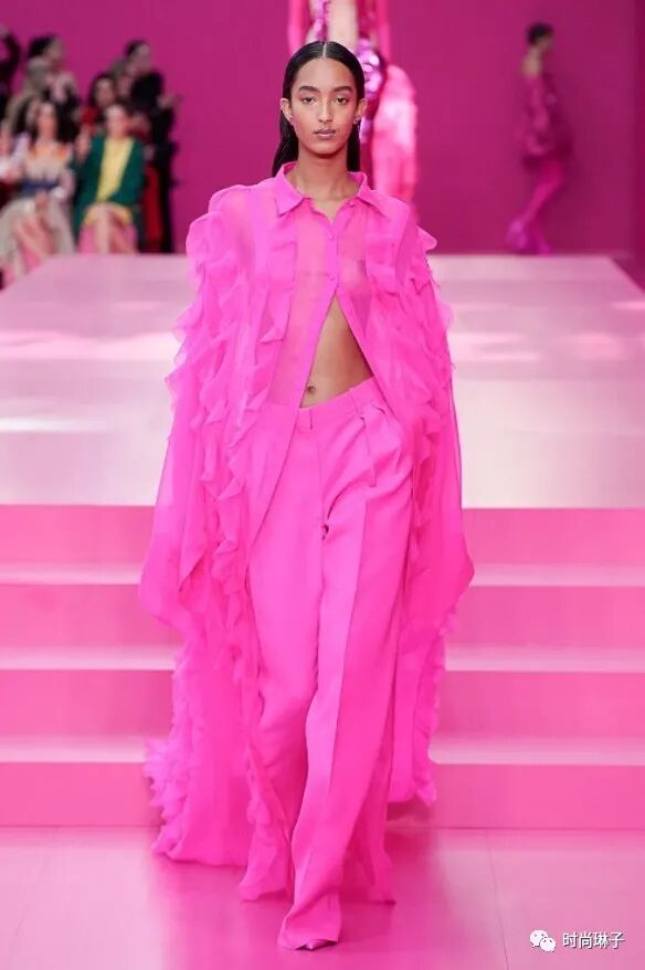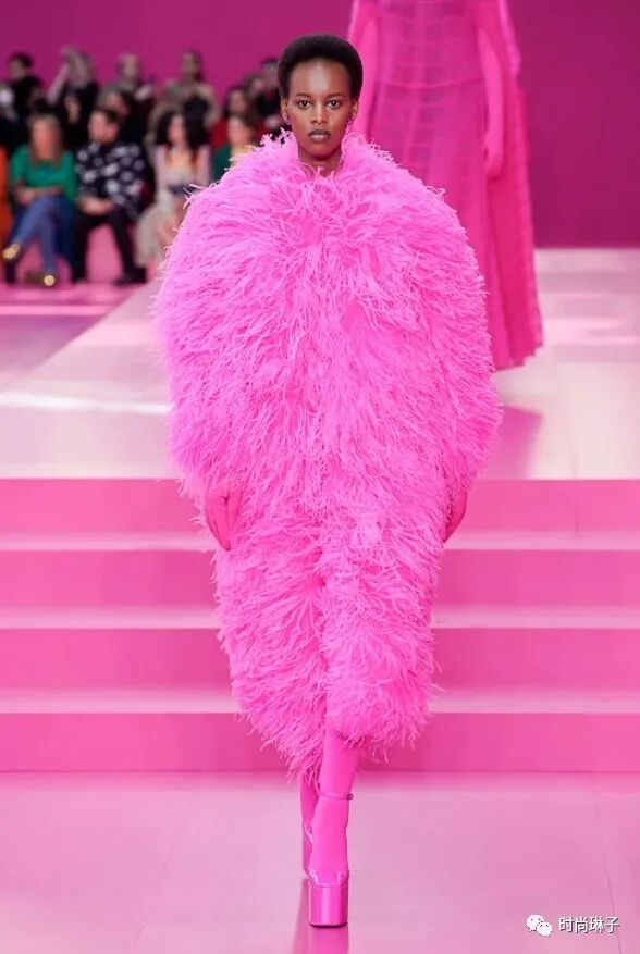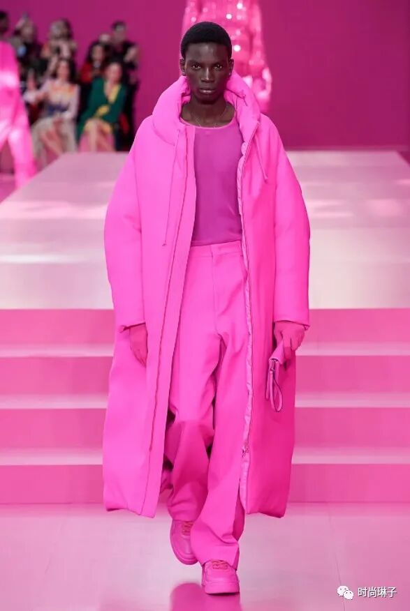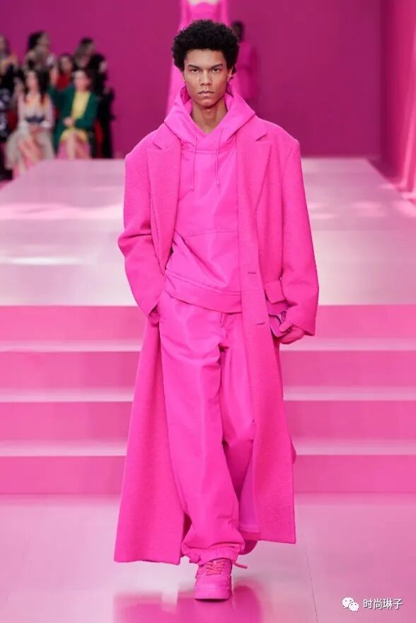 Valentino华伦天奴2022秋冬系列没有五颜六色的调色板,除了中性的黑色,弥漫整个眼球的只有迷人的粉红色。