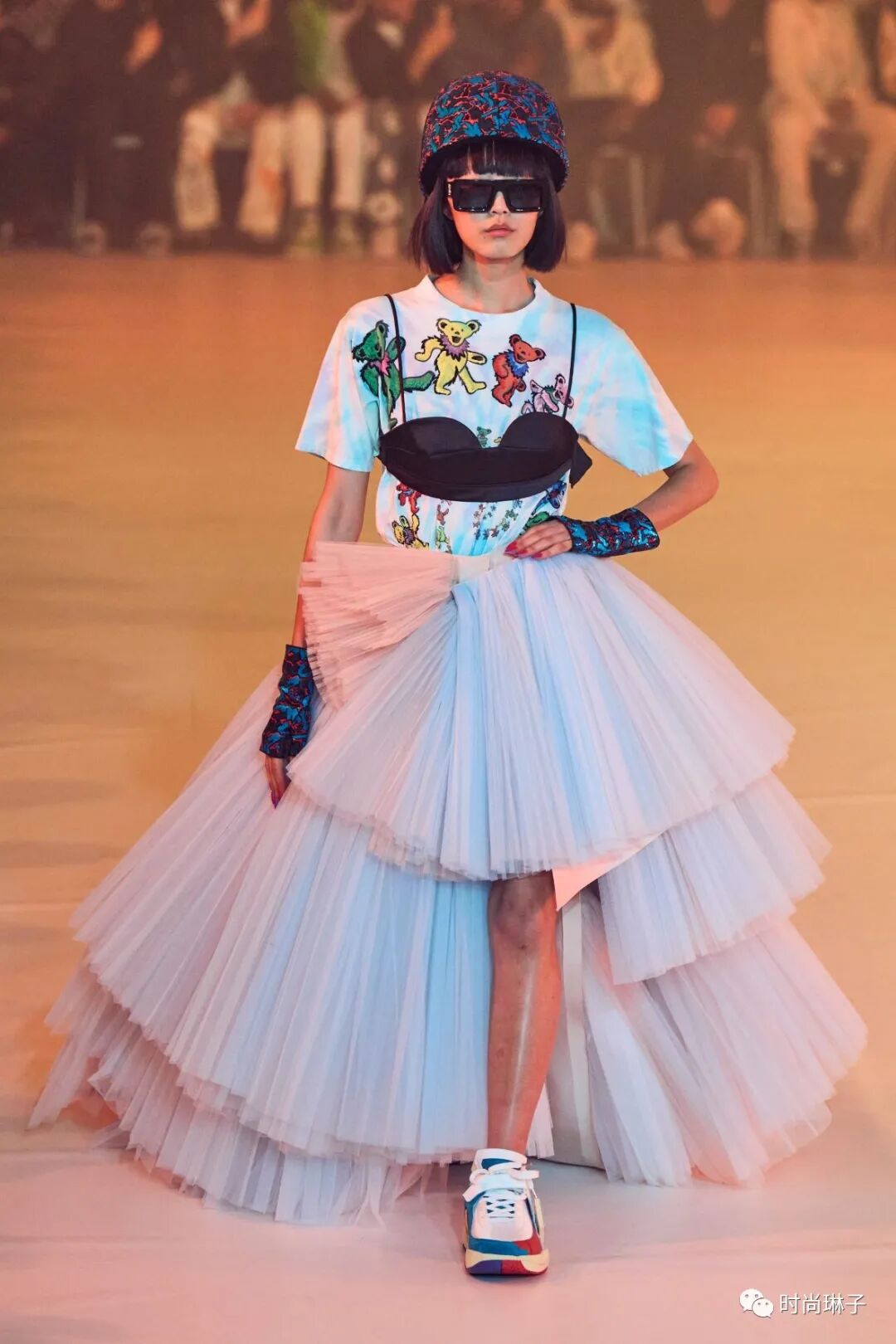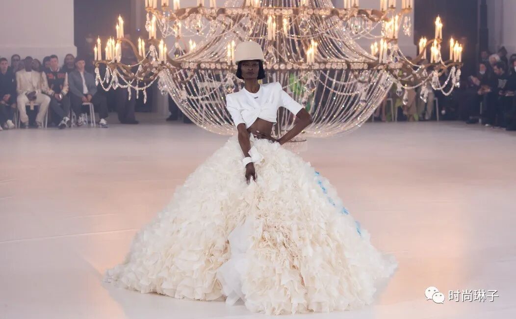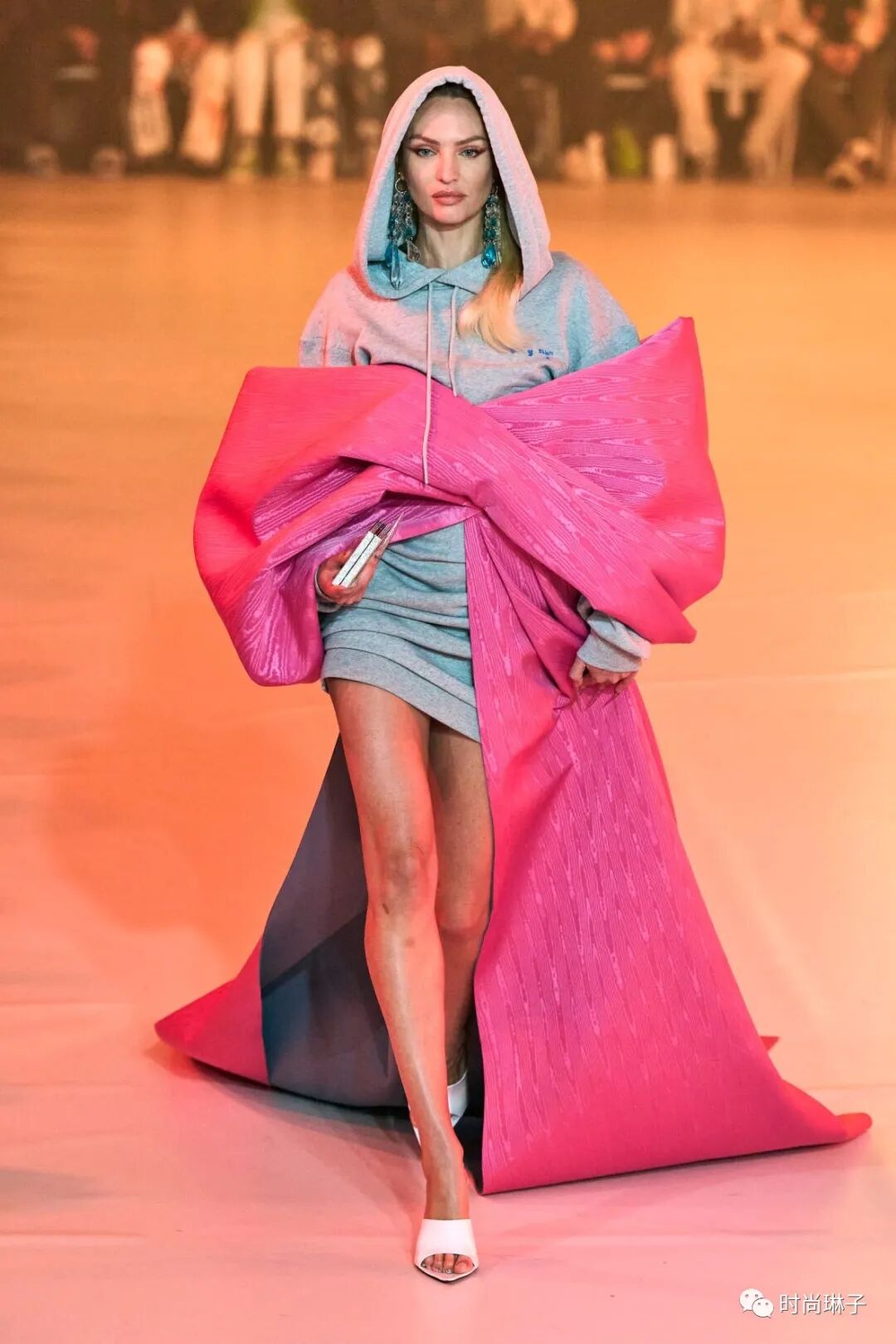 T恤,针织衫,外套搭配层次分明的薄纱裙,灰色连帽卫衣系上粉红缎面蝴蝶结,仙气十足的白色羽毛裙搭配街头风的露脐上衣压轴出场,将Off-White 街头服饰的酷感和高级时装的DNA相结合,赋予了礼服裙独特的个性。