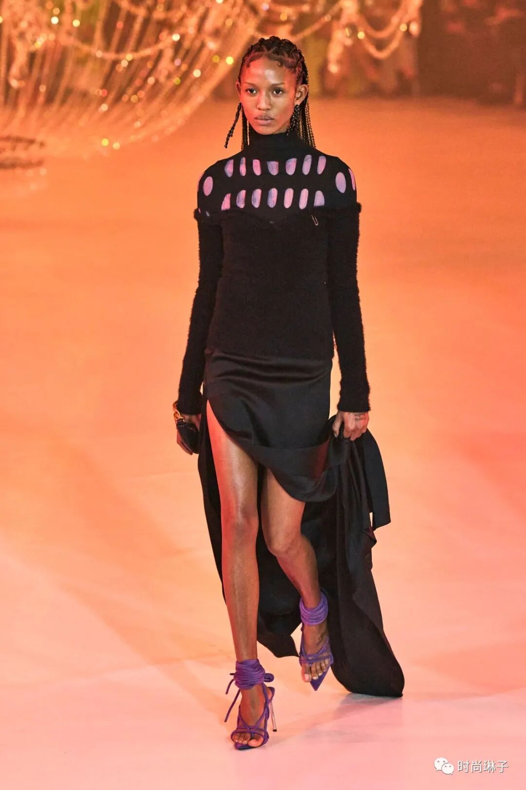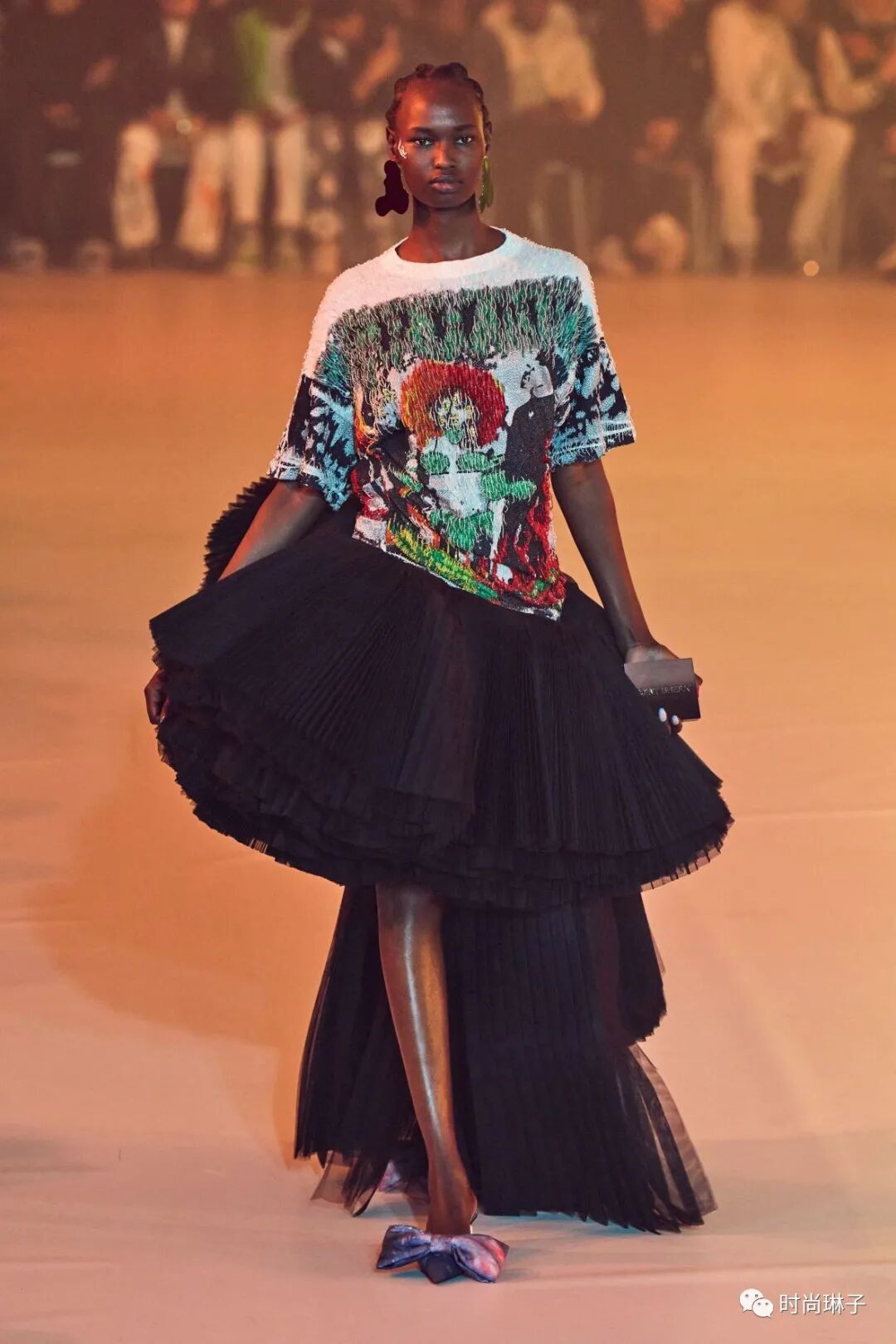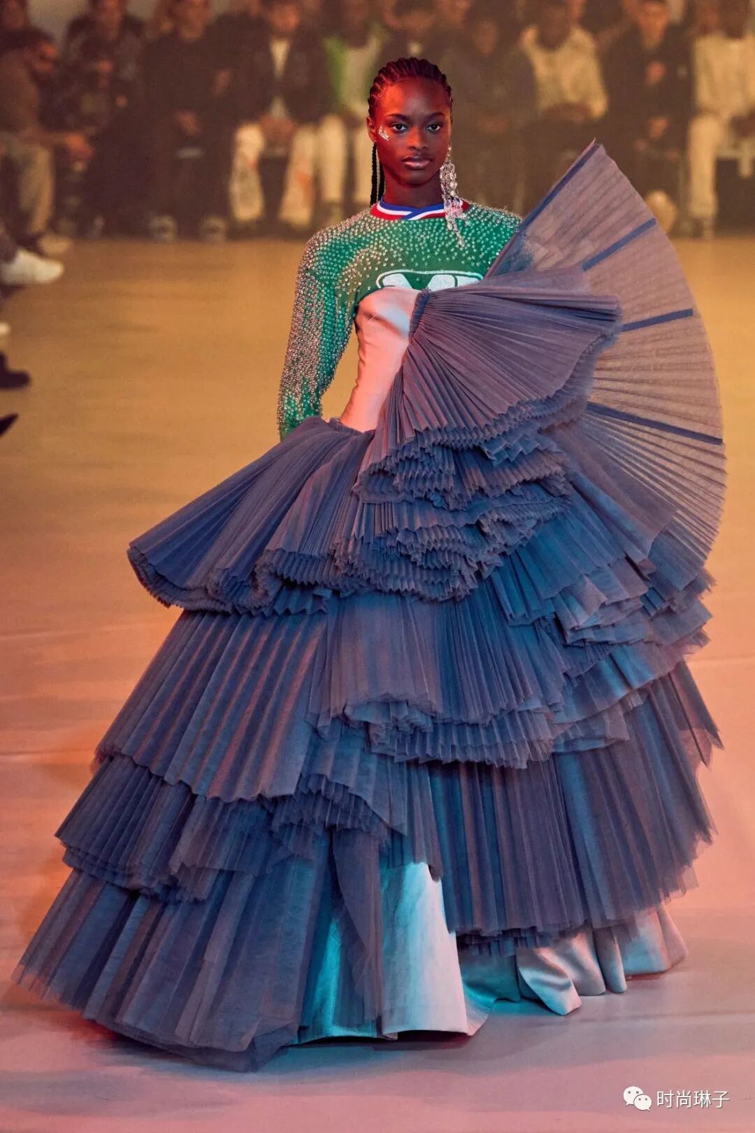 T恤,针织衫,外套搭配层次分明的薄纱裙,灰色连帽卫衣系上粉红缎面蝴蝶结,仙气十足的白色羽毛裙搭配街头风的露脐上衣压轴出场,将Off-White 街头服饰的酷感和高级时装的DNA相结合,赋予了礼服裙独特的个性。
