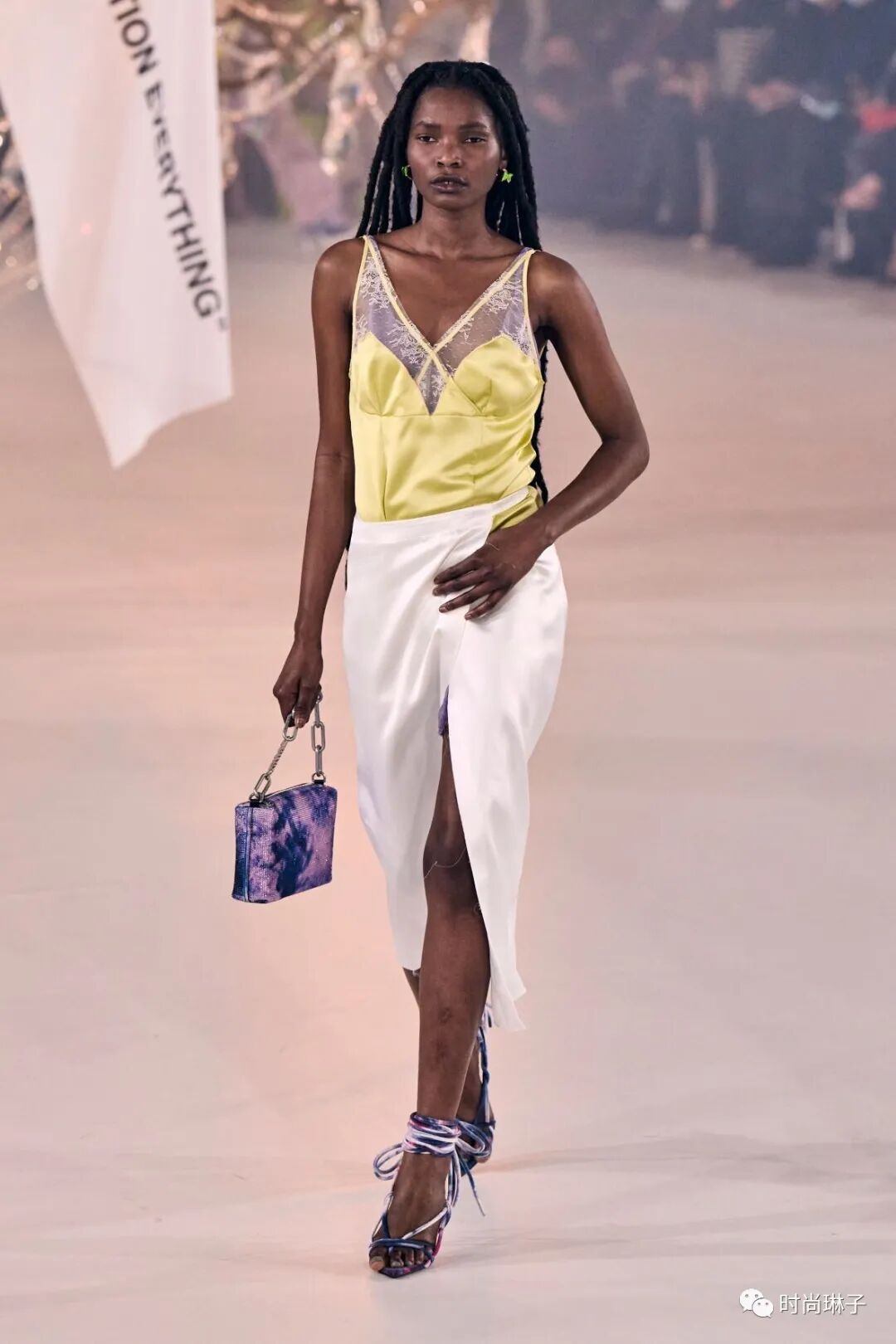 超模Bella Hadid穿着白色宽袖礼服为高级时装秀开场,Cindy和Kaia母女惊喜同台走秀,其中Cindy的两个手拿包藏着Off-White创始人Virgil Abloh和病魔斗争的信息 ,其中一个包上印有MORE LIFE的字样,另一个则装满了红白色药丸。
