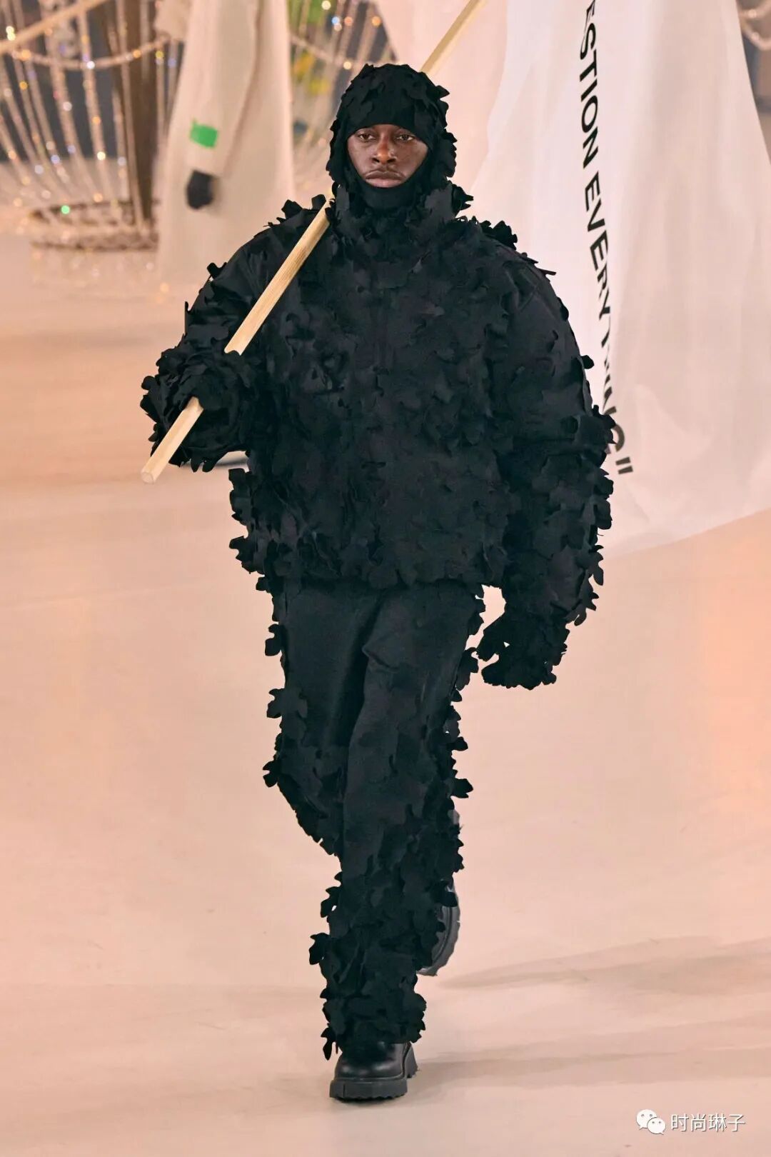 模特手举一面印着标语的白旗,【QUESTION EVERYTHING 质疑一切】 这是创始人Virgil Abloh的座右铭,也代表了街头潮牌叛逆且倔强的灵魂。