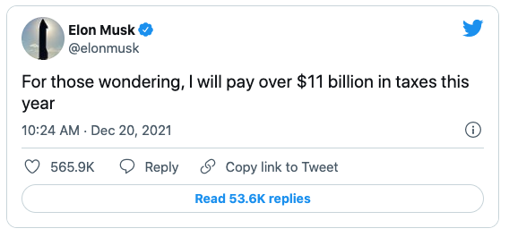 世界首富、电动汽车公司特斯拉的首席执行官埃隆·马斯克表示,他今年将缴纳超过 110 亿美元的税款——这可能是一个人每年缴纳的税款的最高纪录。
