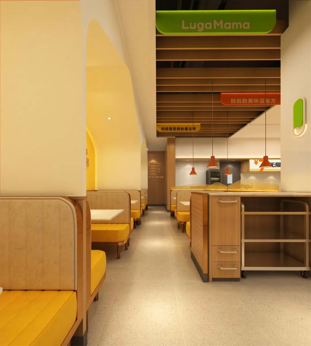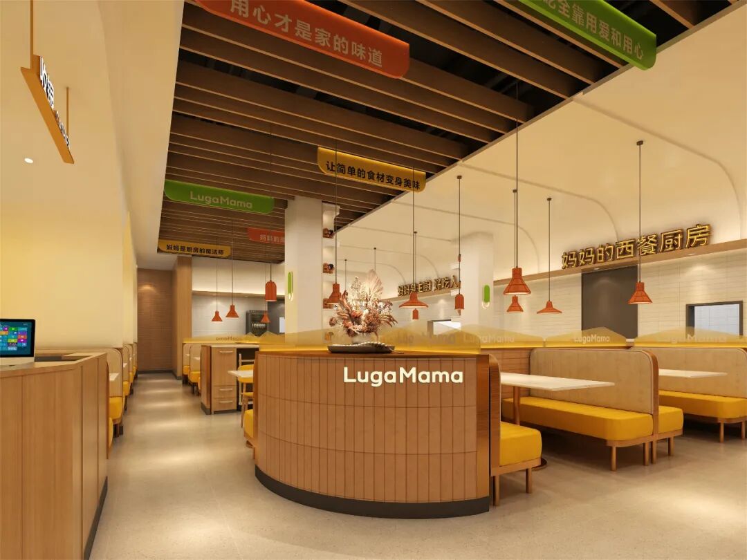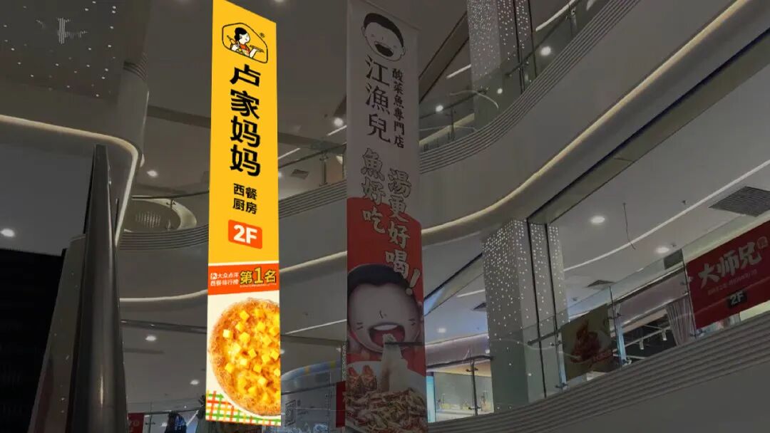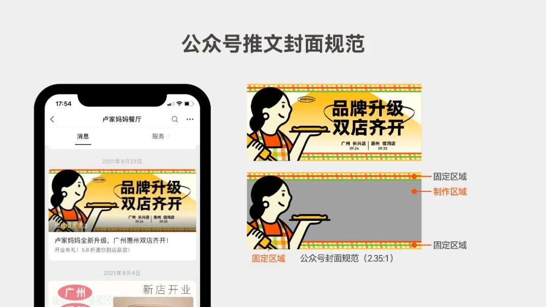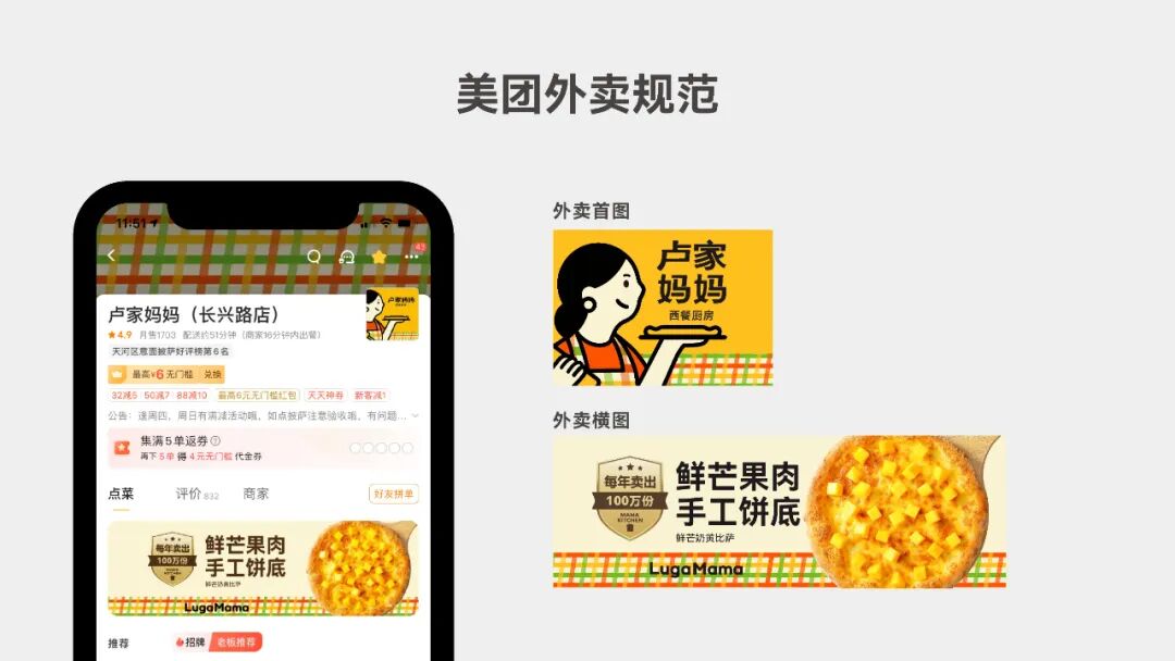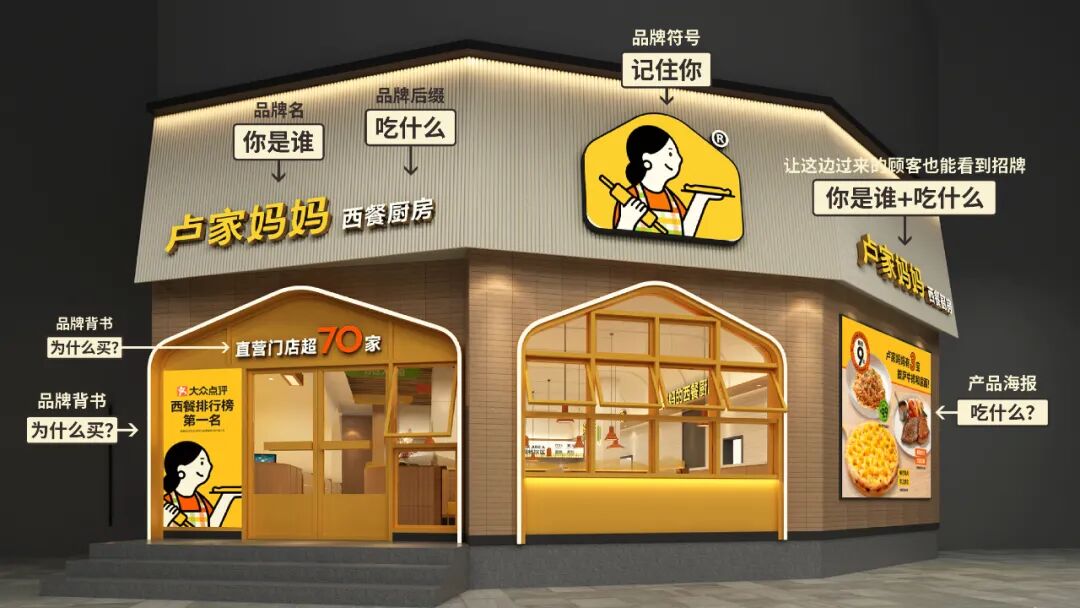 品牌需保持传播的一致性。所有线下物料:室内户外广告、吊幔、水牌、台卡、电梯广告、开业物料等全部有标准规范。卢家妈妈各门店将逐步更新,统一品牌调性。