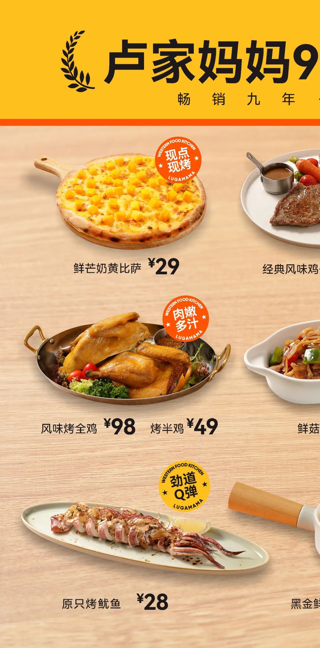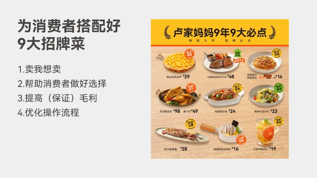 据九年来消费者对卢家妈妈餐品的消费频次、喜爱程度,分别从各个系列中提取一款最畅销餐品,组合为“卢家妈妈9年9大必点”。