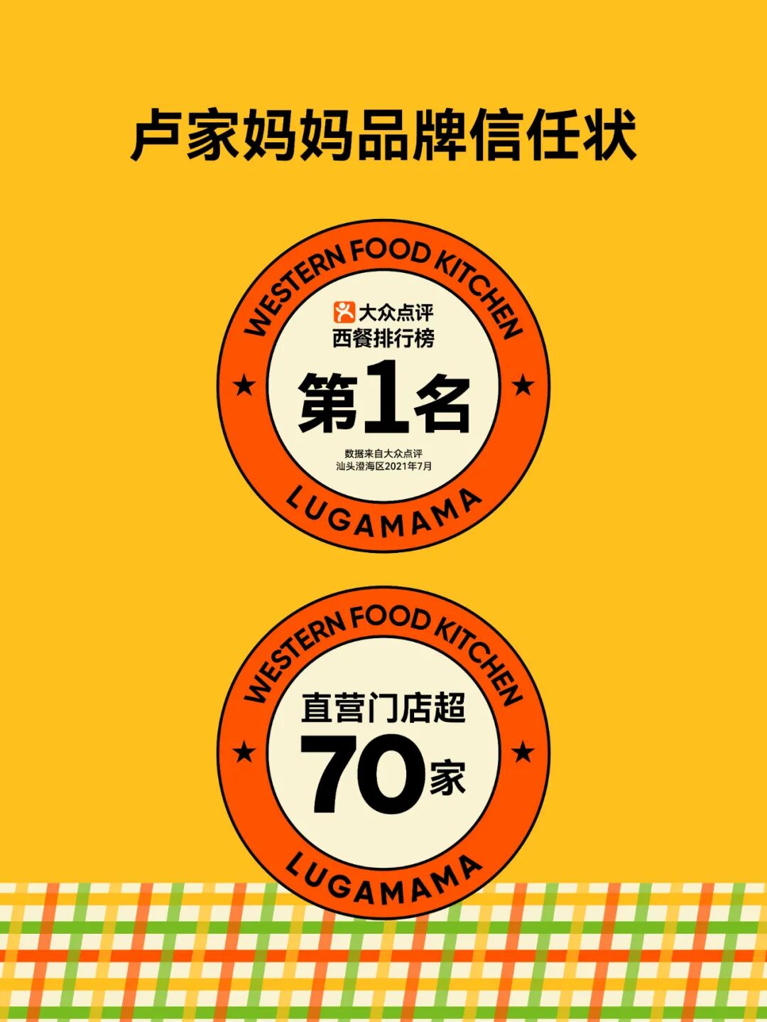 卢家妈妈两大品牌信任状:“全国直营门店超70家”、“大众点评西餐排行榜第1名”。通过强调品牌信任状,来提高品牌的可信度,为消费者提供购买品牌的理由。