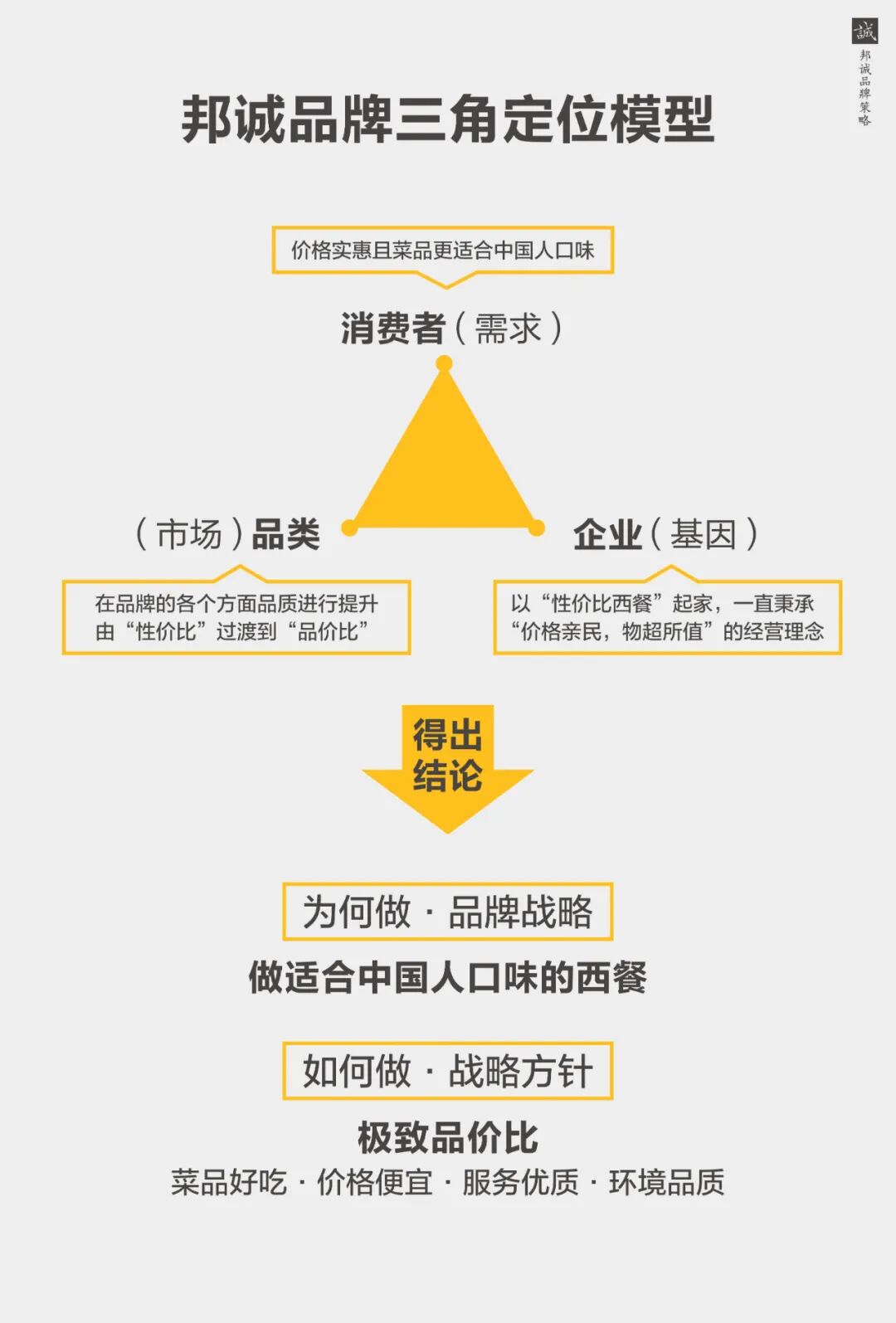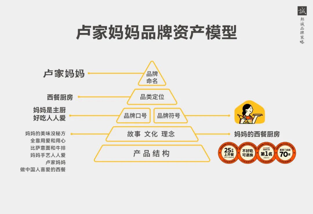 通过品牌三角定位模型分析,得出卢家妈妈的品牌战略定位:做适合中国人口味的西餐。这次品牌升级的核心课题:在品牌形象上做升级,让卢家妈妈成为真正的大品牌;坚持走极致品价比路线:菜品好吃、价格便宜、服务优质、环境品质,让顾客“既有面子,又有里子”。