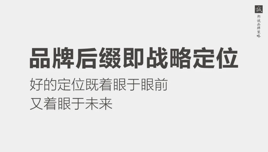 品牌后缀即品牌定位。“合适的品牌定位可以阐明品牌的内涵、独特性、与竞争品牌的相似性,以及消费者购买并使用本品牌的必要性。”