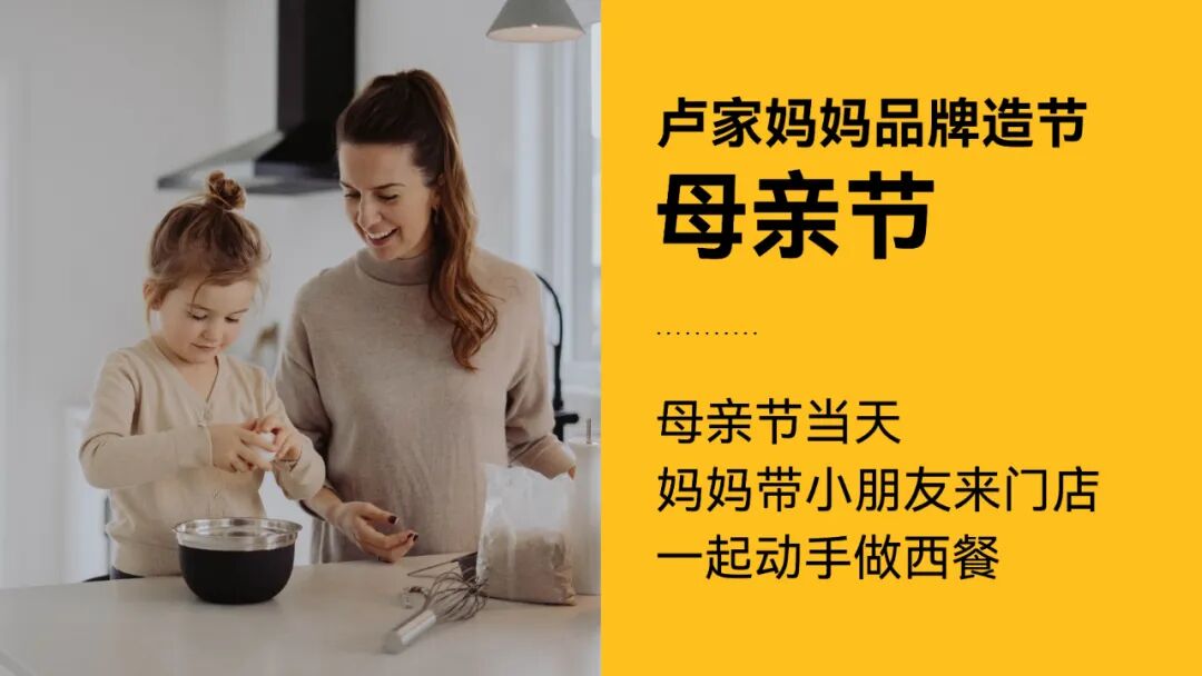 品牌造节的目的是提升门店业绩,积累品牌资产。我们计划为卢家妈妈打造品牌节,将母亲节打造成为品牌一年中最重大的节日。为消费者制造惊喜,每年重复做,被消费者喜爱和记住,最终积累成为品牌资产。
