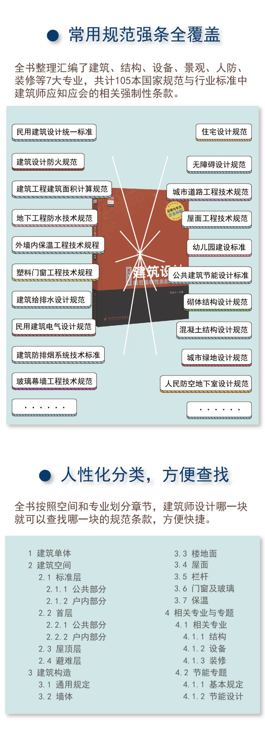 本书是地产建筑设计规范强制性条款的汇编解读,包含《统一标准》《防规》等等所有建筑师会用到的国标、行标规范中的强条,并按照空间区域划分章节,即设计哪个空间部位,就可以在哪个章节看到所有的规范强条,查找和应用都更方便,能有效提升建筑师工作效率。