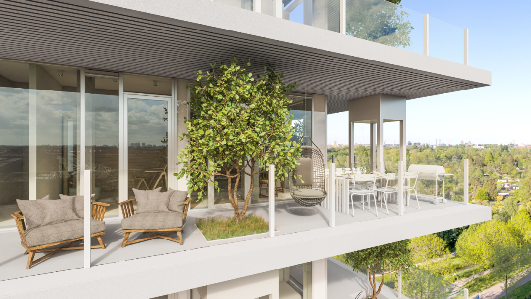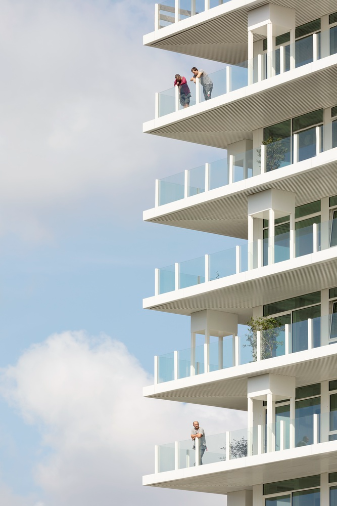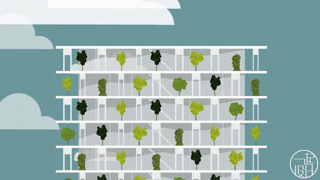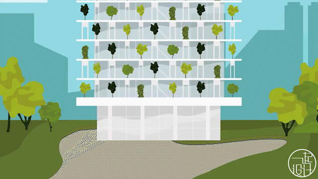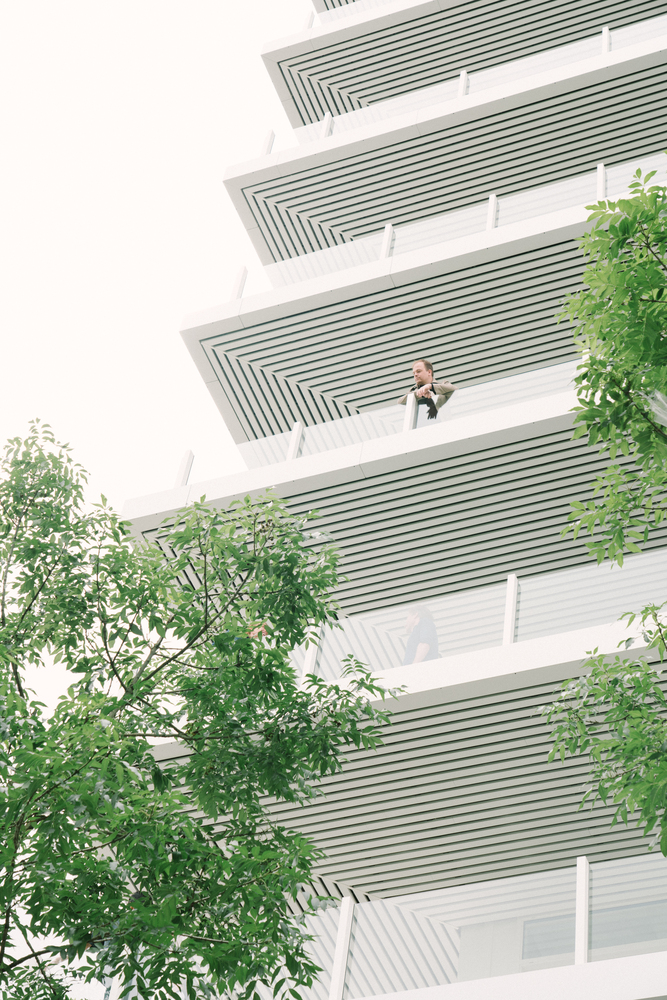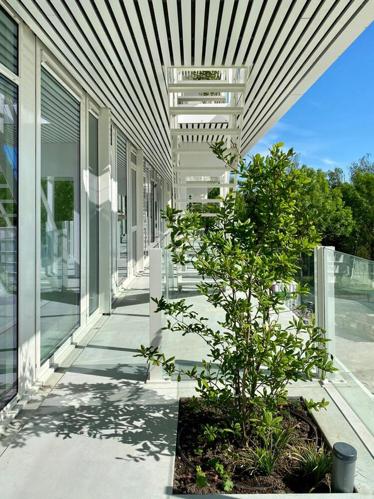 每一层阳台外做了独特「树箱」,花盆造型呼应了建筑结构,从下往上看犹如一根根支柱。
