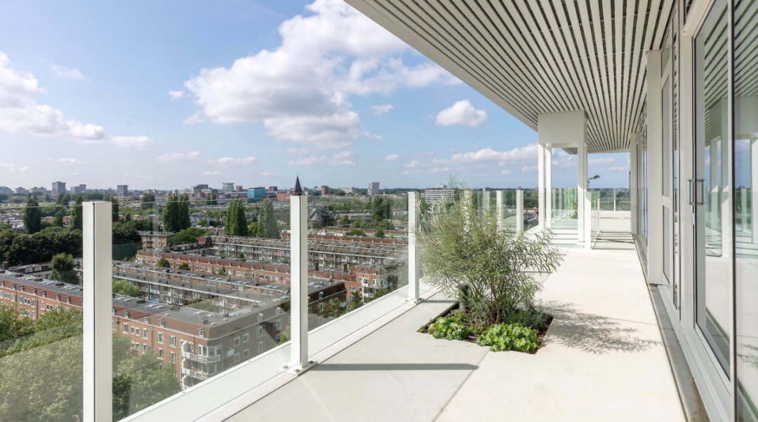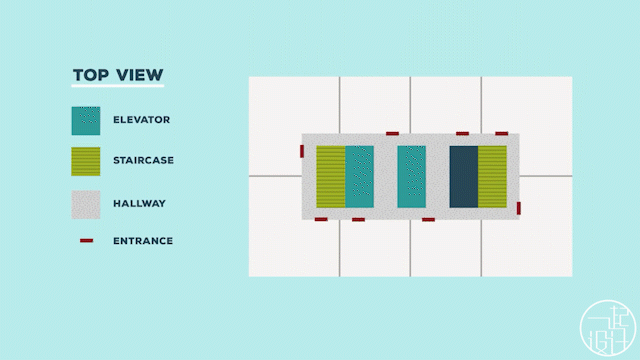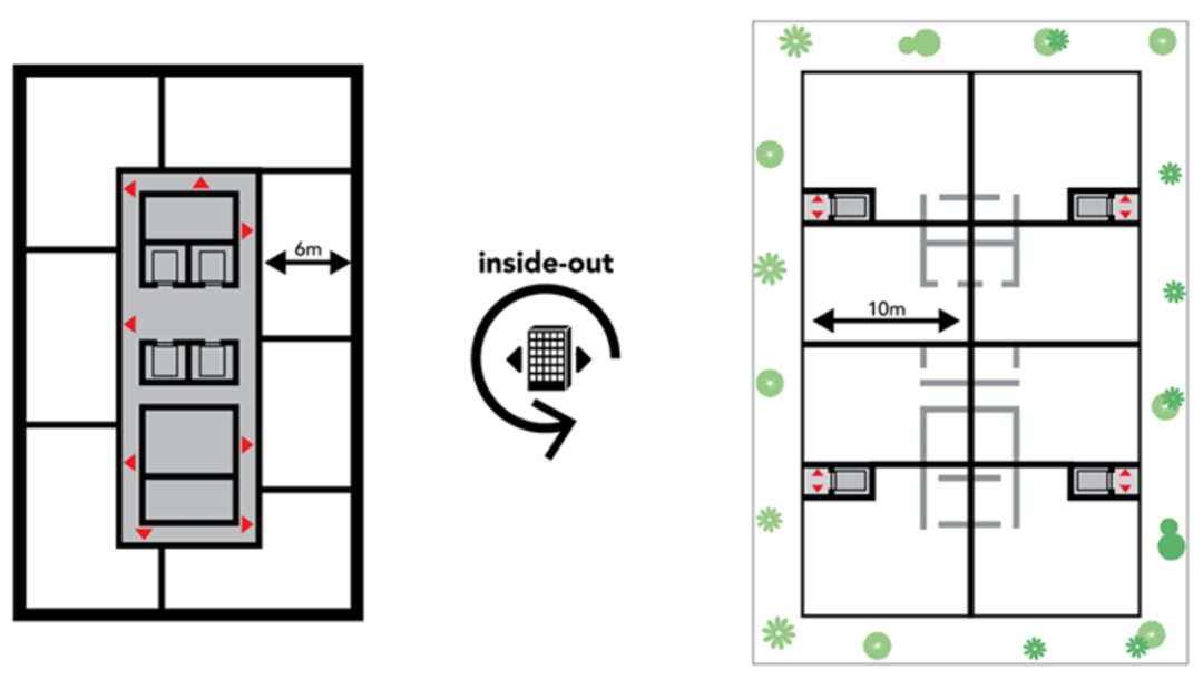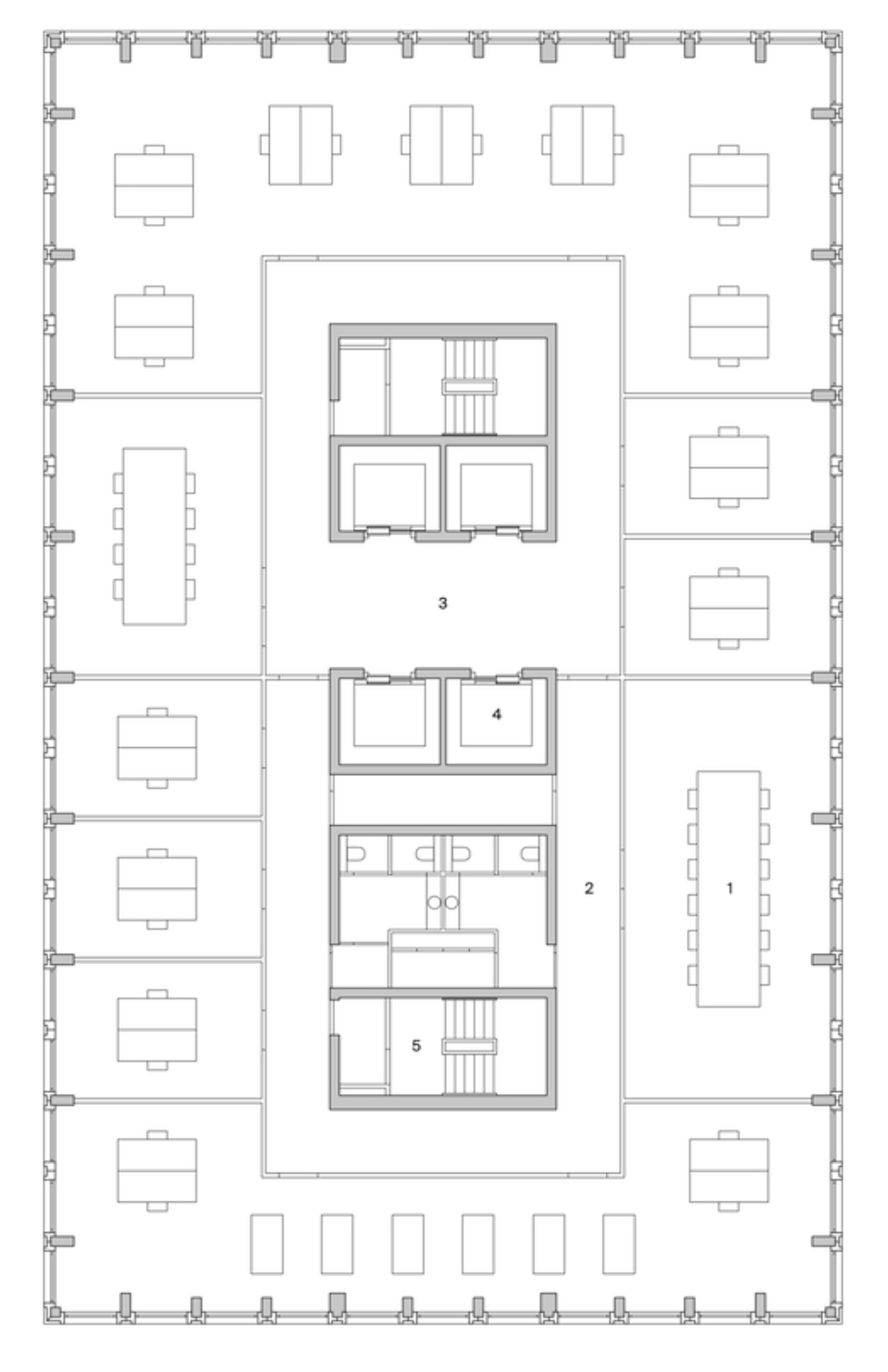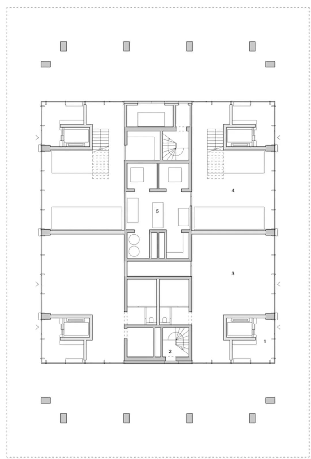首先把原建筑的外墙界面缩进,同时同时又增加了挑出去的露台,更加大胆的是,把一个核心筒在内部中心的布局,改成了 4 部电梯分别在平面的 4 个方位,直接通往露台。