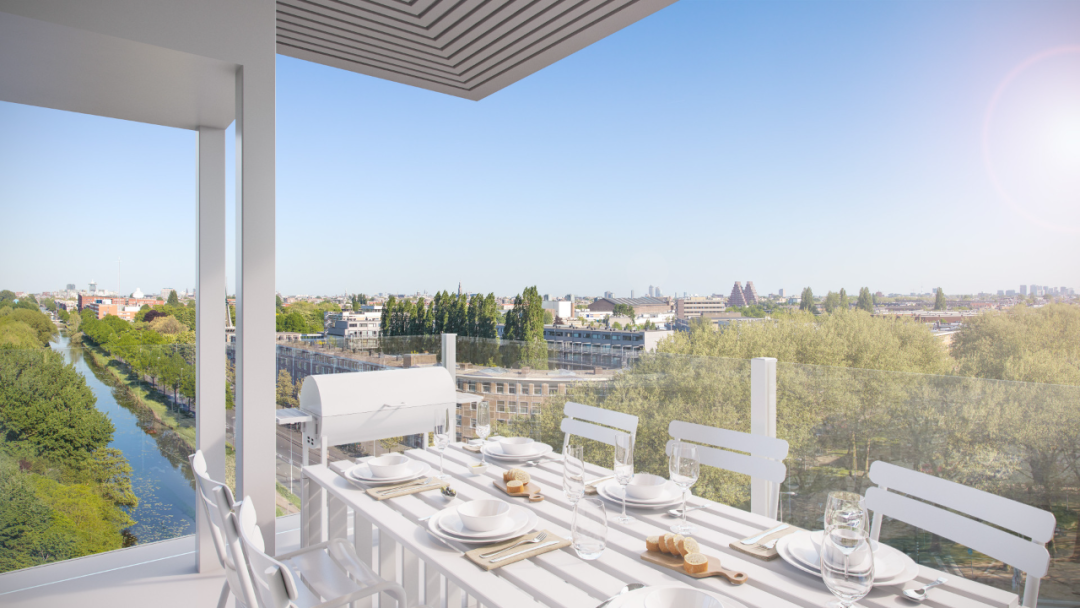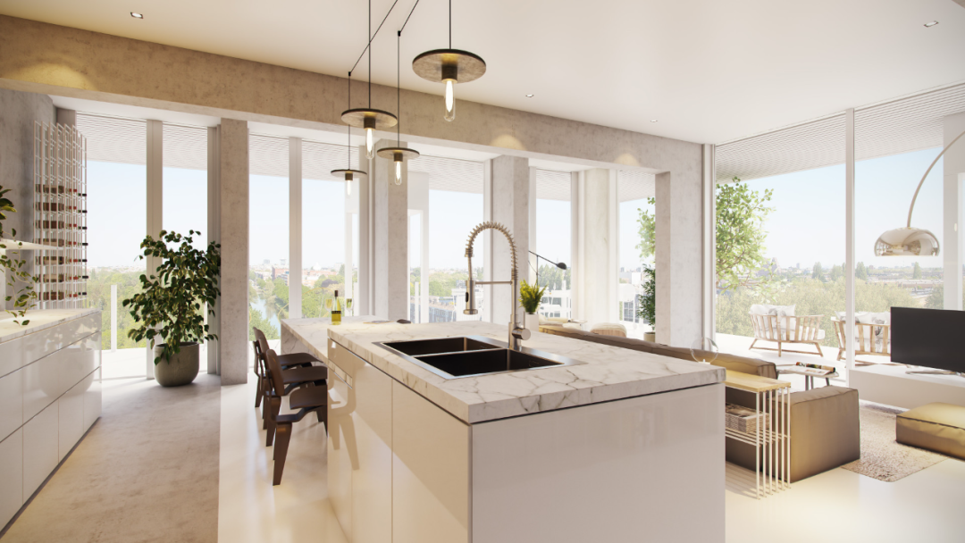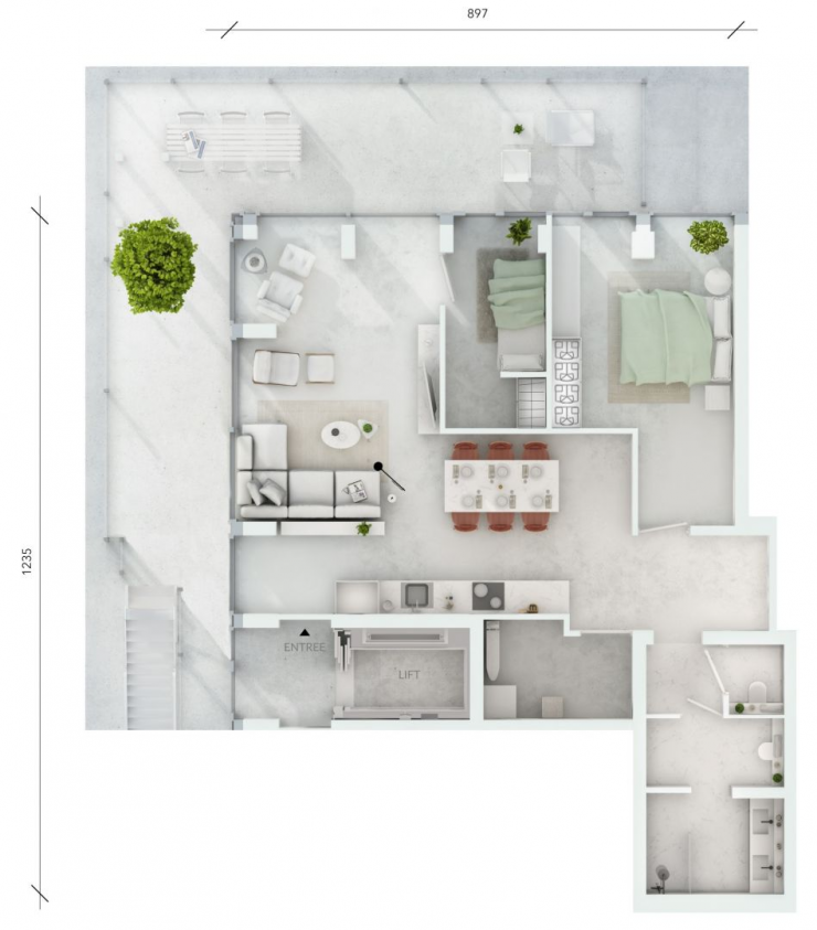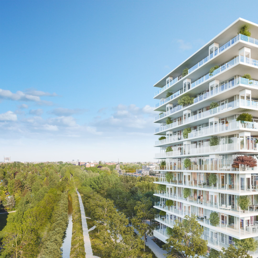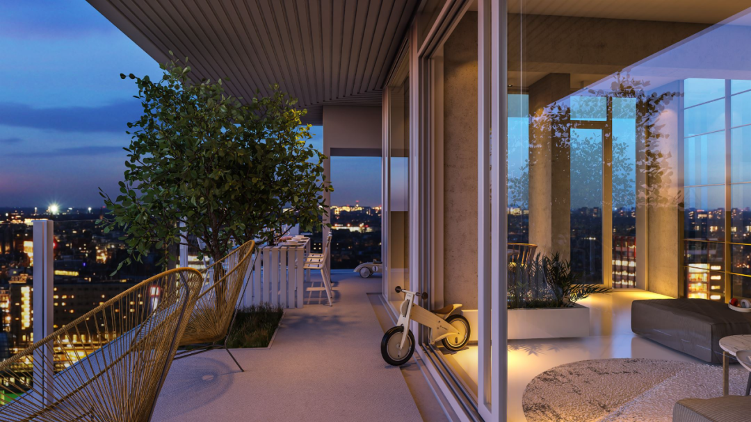 首先把原建筑的外墙界面缩进,同时同时又增加了挑出去的露台,更加大胆的是,把一个核心筒在内部中心的布局,改成了 4 部电梯分别在平面的 4 个方位,直接通往露台。