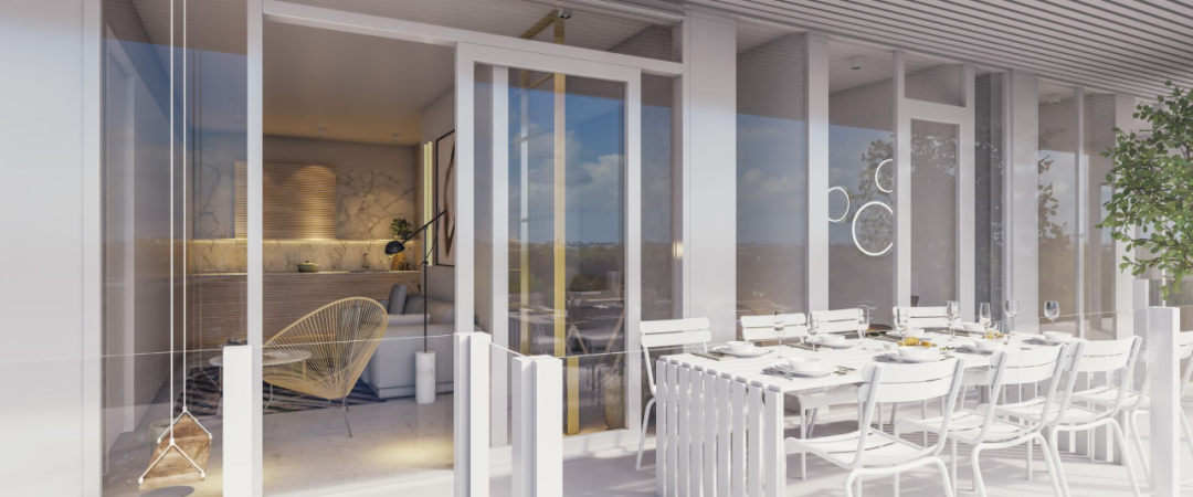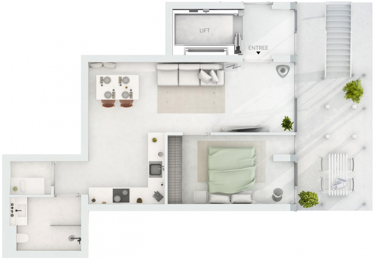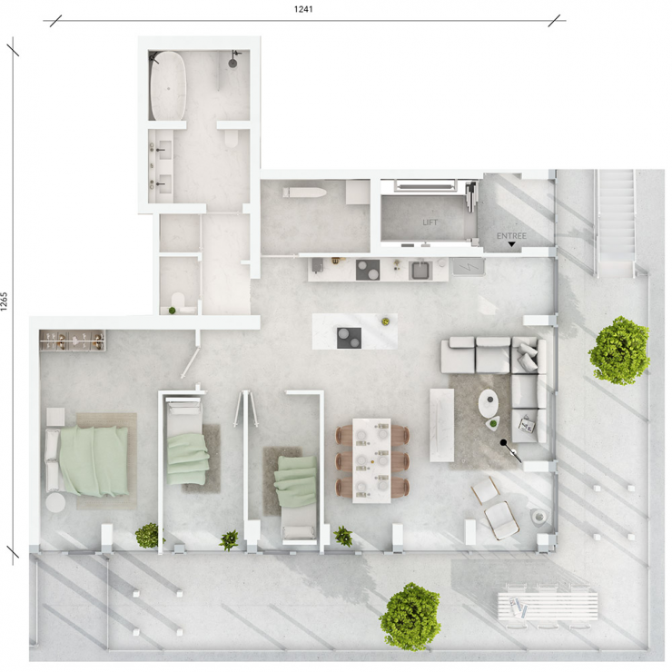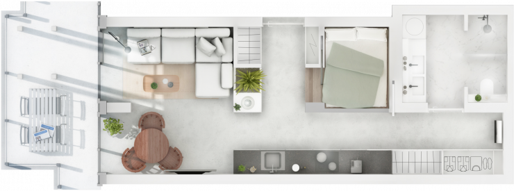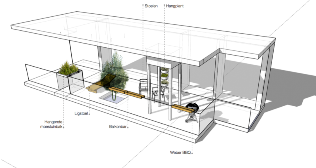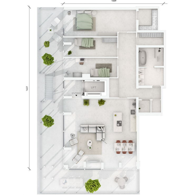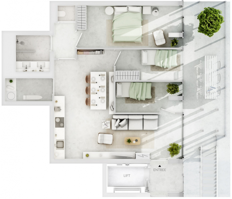 这样的设计不仅可以减少公摊面积,而且让电梯直接入户,挑出去的露台兼顾了三个功能:公共走廊、疏散通道、公区的花园。