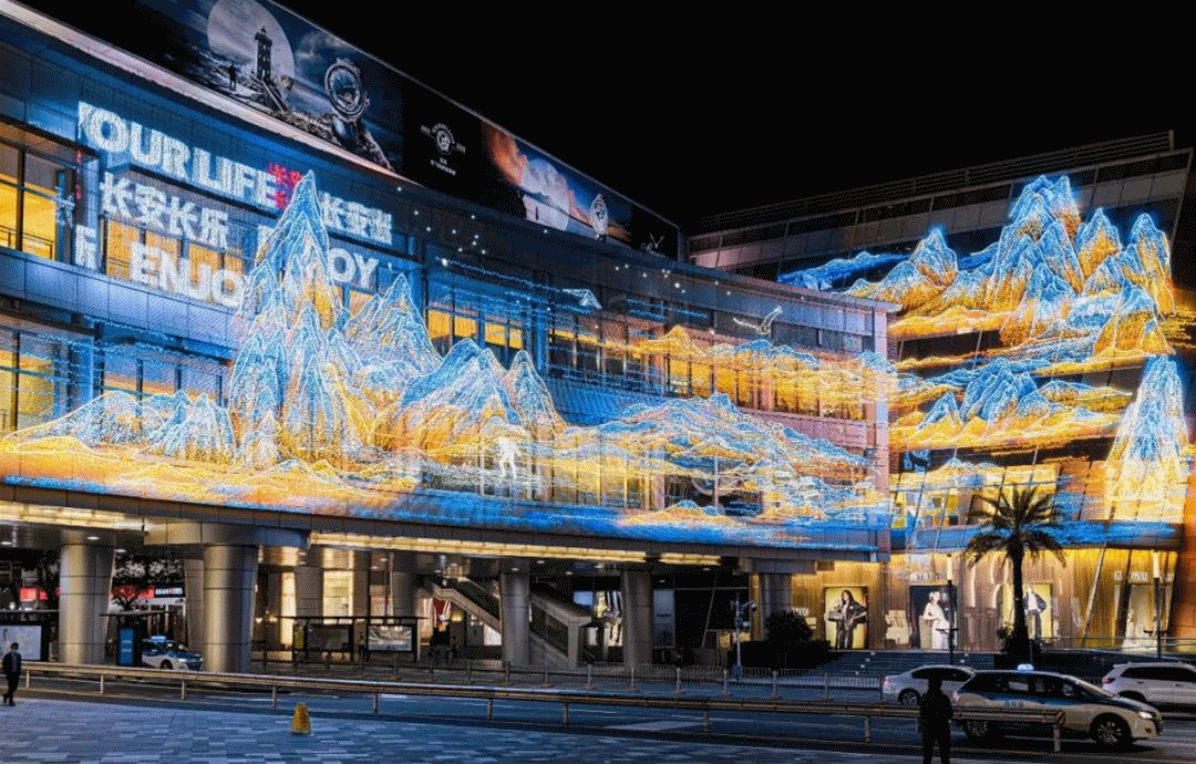 营销上聚焦文化、艺术类活动。12月展出的“江山无垠·万象常安”艺术灯饰向中国传统文化美学致敬,以现代设计艺术手法描绘千里江山无限的山水意境,壮阔炫目,极具艺术感。