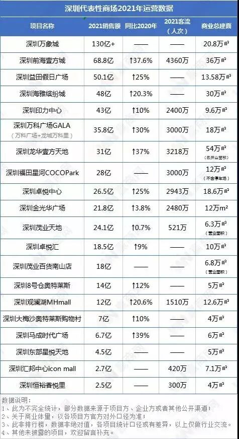 硬件出众,同时叠加着庞大且稳定的消费客群,承拖起深圳的商业。深圳的城市商业规模和档次上极具实力。深圳商业规模位于全国城市第4名,坐拥了大量的头部购物中心。如2021年销售业绩排行榜中,深圳万象城以130亿+的销售佳绩领跑深圳,突破50亿大关的商业体有前海壹方城和益田假日广场。