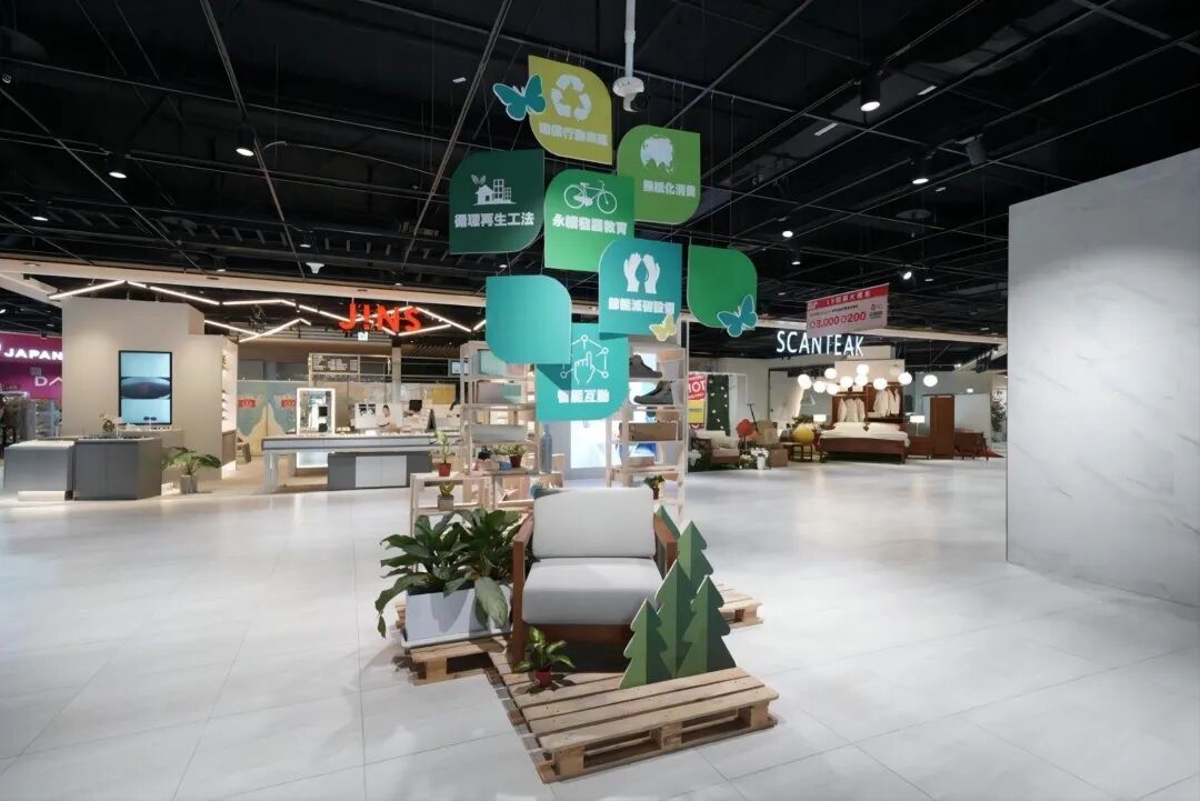 在台湾的环球购物中心逛街逛累了,坐下来吃顿饭,消费者可以在餐厅和美食街享用健康饮食,自带环保餐具还有优惠。大量运用环保建材,柜位隔间采用模组化组装,可重复使用减少废弃物,商场休憩区则与小智研发合作,陈列使用宝特瓶、麦渣、玻璃等再生材质制造的沙发、桌子;屏东分店屋顶也设置太阳能发电系统,同时多个商场也设有电动汽车、机车充电设施,将循环减碳概念化为消费者的实际体验。