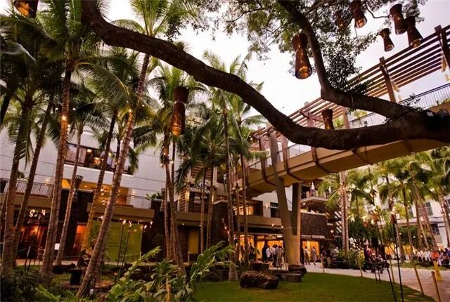 The Royal Grove生态植物园位于购物中心中央,里面设有鲤鱼池塘、榕树、用夏威夷出产的木头搭成的木桥和地方花卉。植物园内介绍牌上介绍的是夏威夷著名的酋长、前皇室成员和历史地标。表面看起来这是为游客休闲打卡的地方,但这些文化服务的意义在于鼓励参观者停留片刻、细读这些介绍和购物。