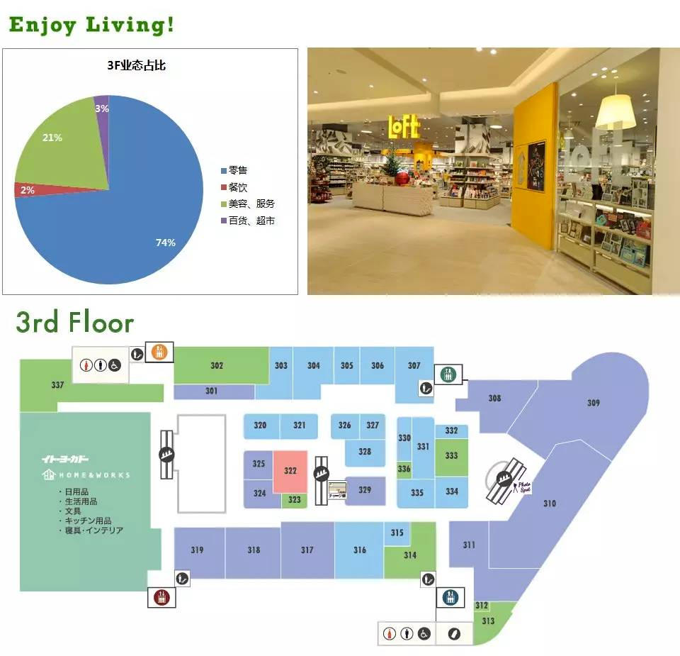 日本这家体量为3.7万㎡ GRAND TREE购物的中心,开在非常有人气的东京都内居住地——武藏小杉地区,定位社区商业。从19年开业至今,它仍然是日本最受欢迎的商场之一。格林木的目标是打造一个“目前为止还没有出现的购物中心”。将目光聚焦在城市中的家庭客群,细化家庭中存在的各类关系为其提供陪伴式消费场所和体验式场景。