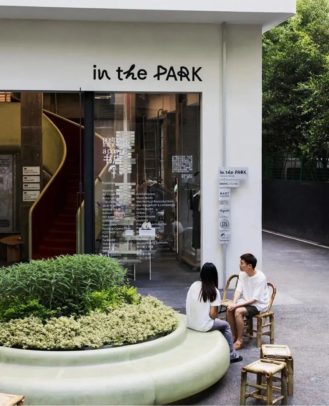 店铺的正门口,是一个通透的花坛,配上几把竹椅,既是一个休息区,又是室内外空间的连接。而公园里常见的物件,像树木、座椅、滑梯、石头等这些经典的元素,在设计师巧妙的设计下也被装进了店铺的室内空间。