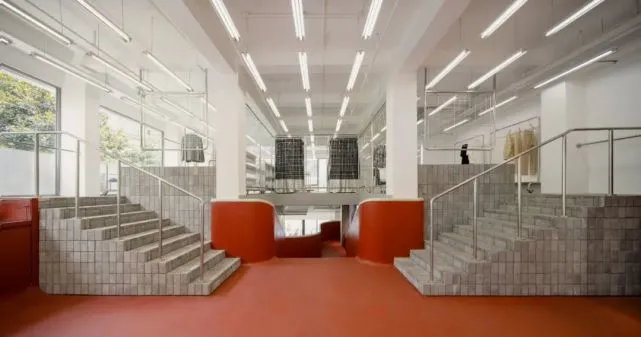 其中,在室内,设计了一个贯穿于整个空间的大红楼梯,鲜明而亮眼。据了解,红楼梯的设计灵感也是来源于公园的公共滑梯。空间中的水泥柱网,周围均设计了效仿公园大树旁的“围树椅”。还有置物架和龙门架,运用的则是公园里的元素和上海常见的晾衣杆效果。