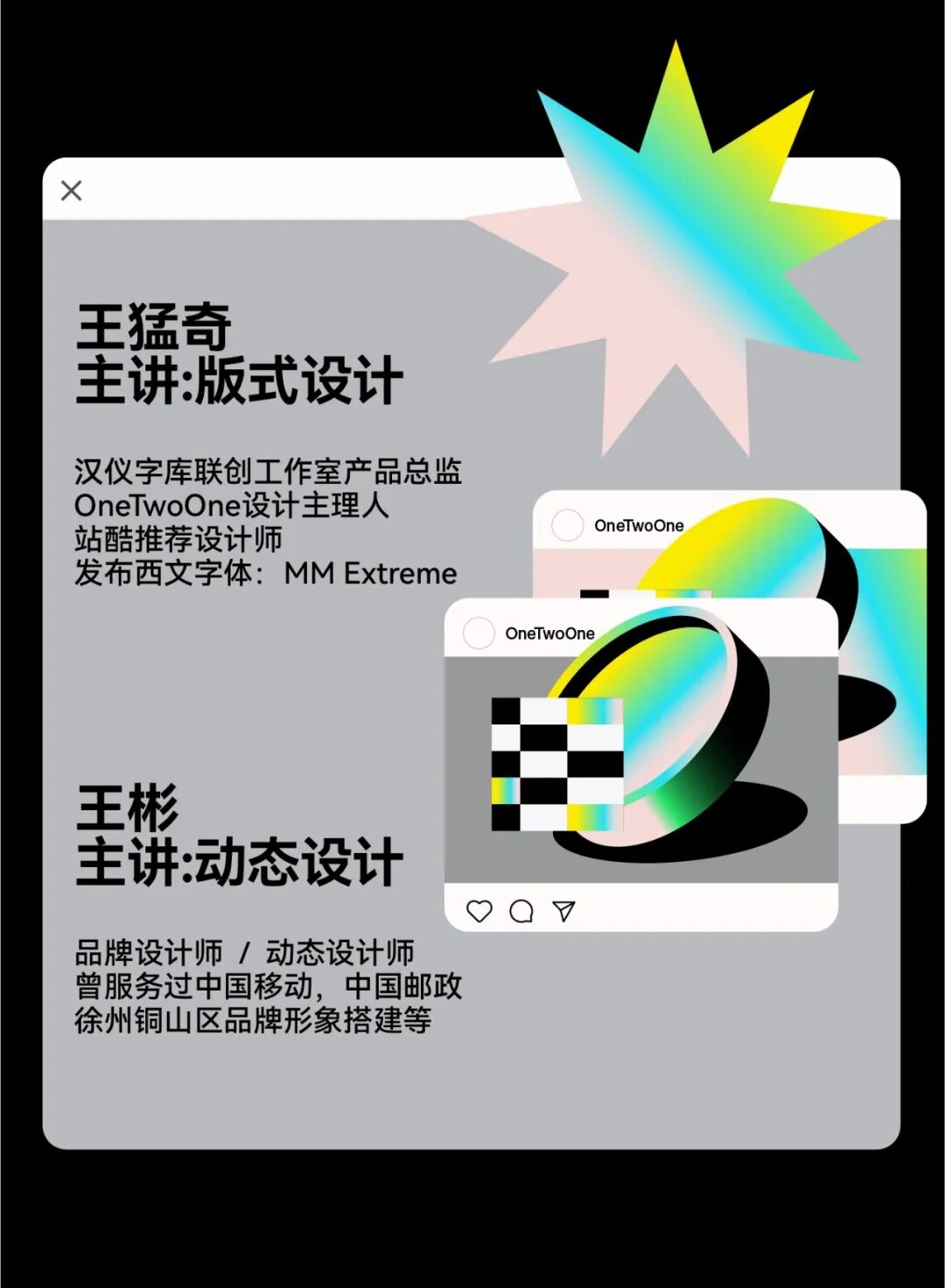 接下来介绍本次课程的两个授课老师。版式设计部分是由猛奇老师来上课(1-9节),动效部分则是由王彬老师负责为大家讲解(10-17节)。