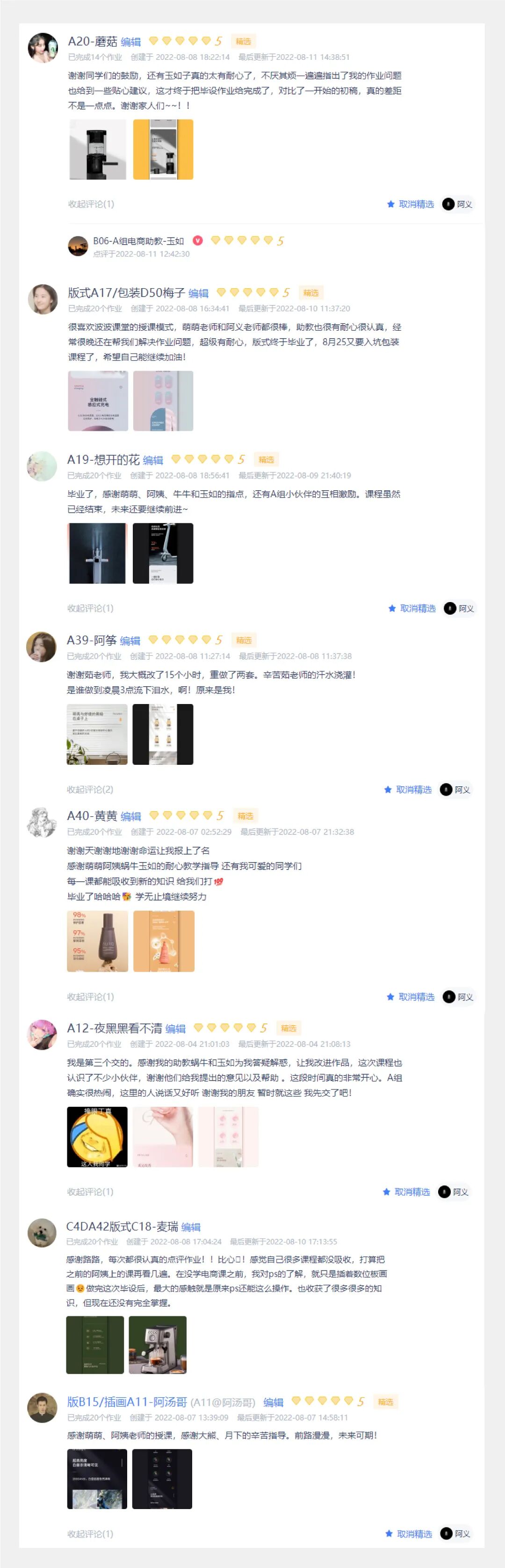同学们的评价及感谢,是老师最大的动力源泉之一了,没有哪个老师会希望同学们徒劳无功一场。能帮助大家不管是在工作中,或是对于设计的审美与认知上的提高,都是最开心的事情。之所以有这么多的优秀作业,仅仅有科学的学习路径肯定是不够的。每个小组我们会派助教为大家答疑解惑,强大的助教老师团队,1对1的作业点评,让你的每一步都走的更加踏实。