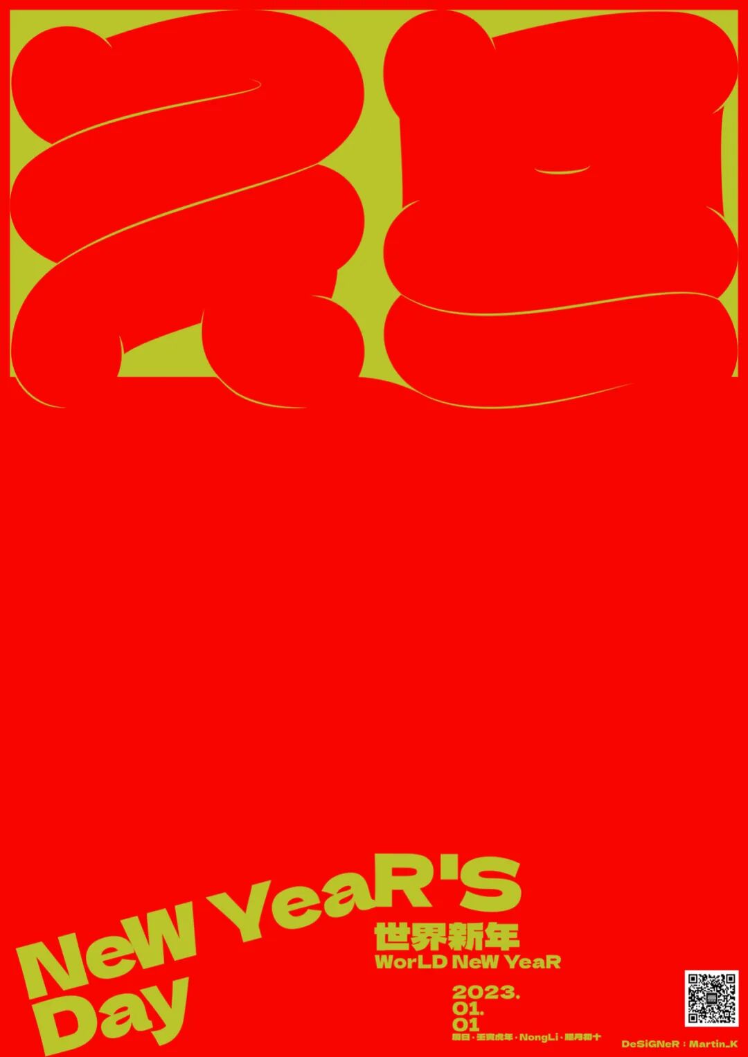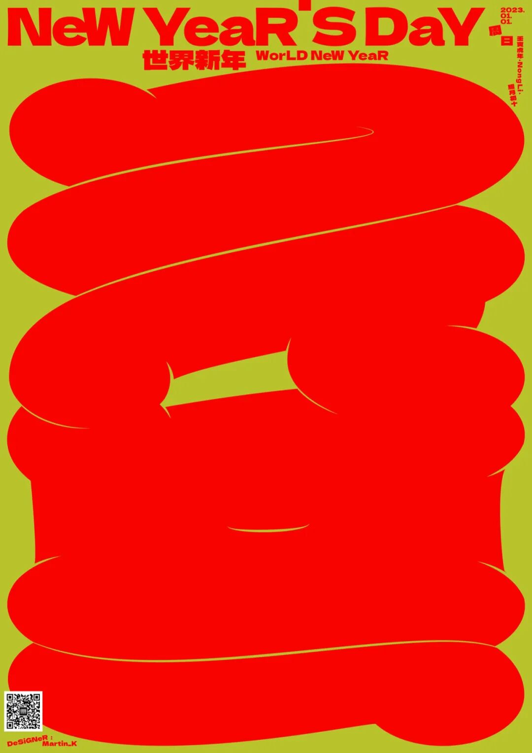 以主题文字作为核心创意载体,版面空间作为创意表现的环境,采用柔和且粗壮的特点对主体文字进行手写连笔的处理,使其可以体现出时间的轮回及流逝,并呈现出抽象的拟人化艺术形态表现和文字的识别度,通过版面空间的合理使用及正负空间的表现,表达出元旦作为起点的走动以及时间堆积后的结束,以饱满且具有象征生命力的动势和拟人化感受,让画面充满符合主题含义的表达。