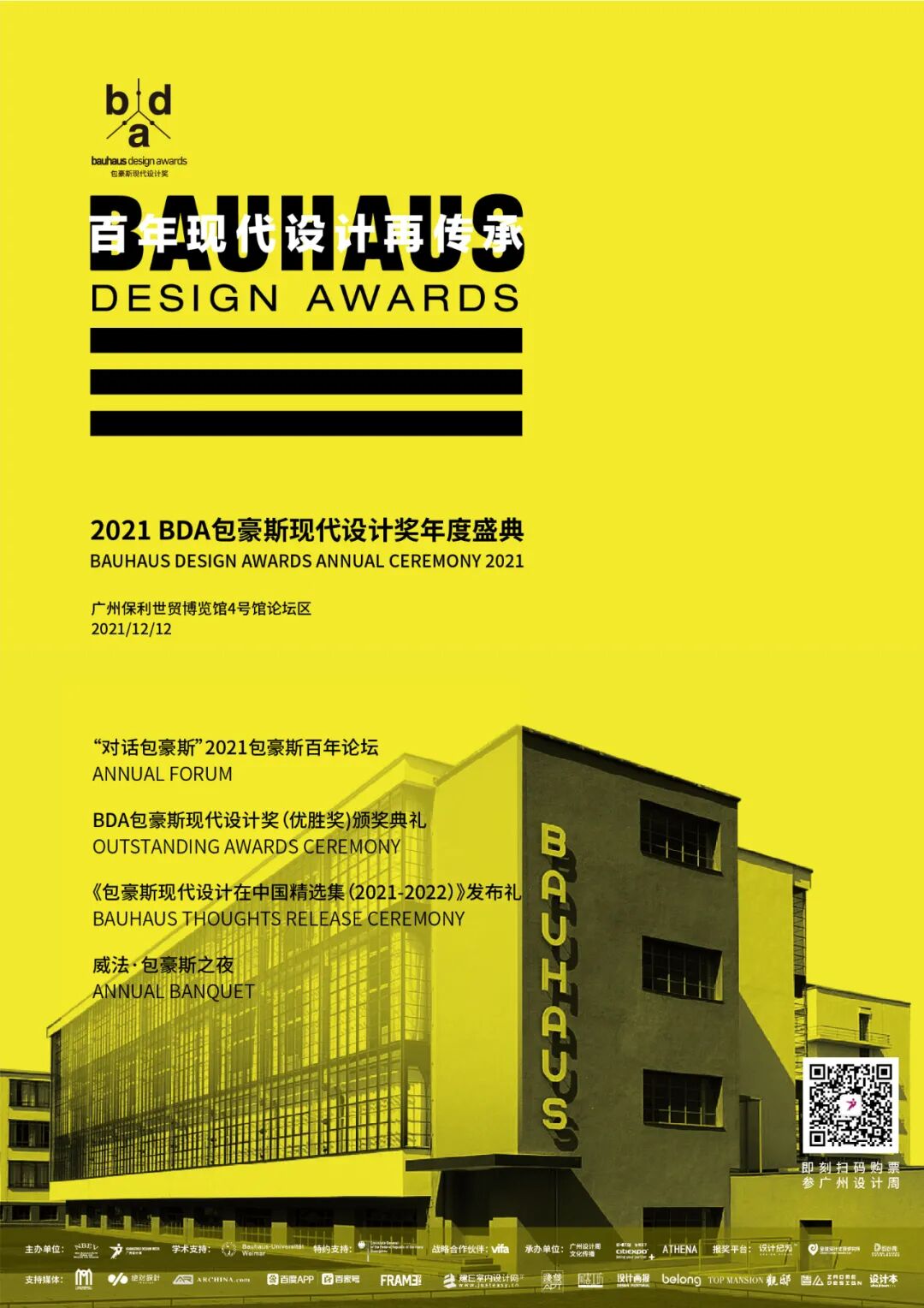 12月12日,我们将迎来本年度重磅的收官盛典活动--2021BDA包豪斯现代设计奖年度盛典,本次盛典分「“对话包豪斯”2021包豪斯百年论坛」、「 BDA包豪斯现代设计奖(优胜奖)颁奖典礼 」、「 《包豪斯现代设计在中国精选集(2021-2022)》发布礼 」、「 威法·包豪斯之夜 」,重磅表彰具备包豪斯精神的设计理念的来自全国数十座城市的数百位优秀设计师,同时,邀请多位优秀设计师进行现场对话,深入发掘世界性的设计理念,以此向包豪斯致敬!