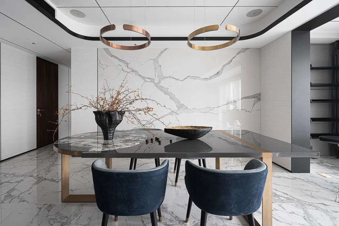 项目介绍 | 本案以高级灰为基调,运用极富美学的天然大理石,搭配突出细节感的木饰面以及地毯,质感十足的金属色灯具使得整体线条更加流线,将简洁性与质感美融合到了极致,打造一个能让心灵栖息下来的家。